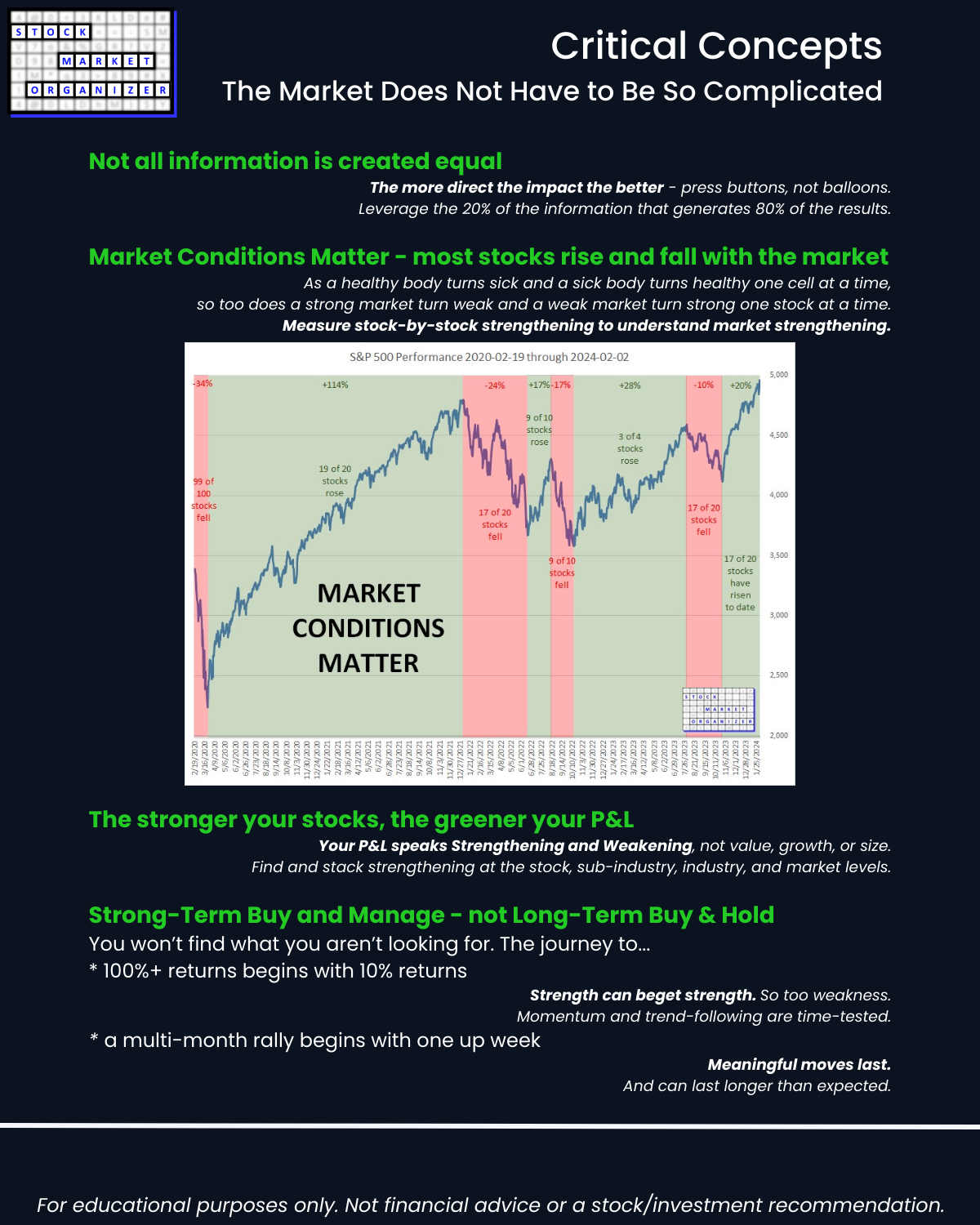 - Most stocks do what the market does. (While the market can only do what its underlying stocks, sub-industries, and industries do.)