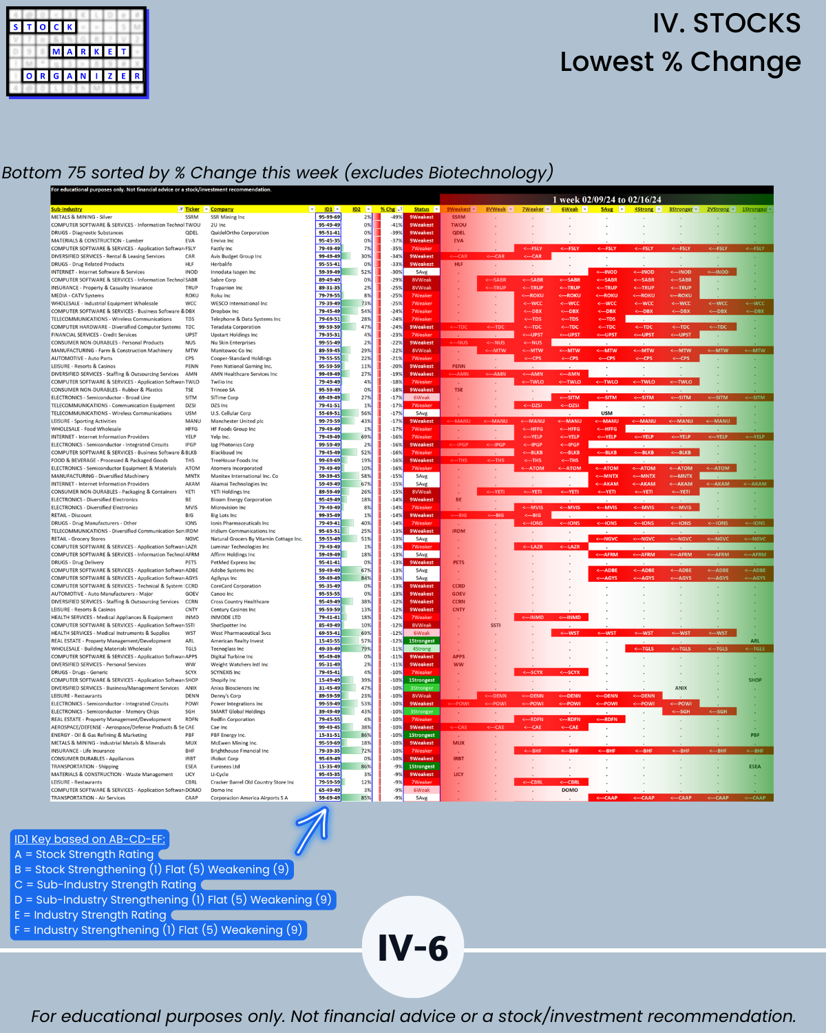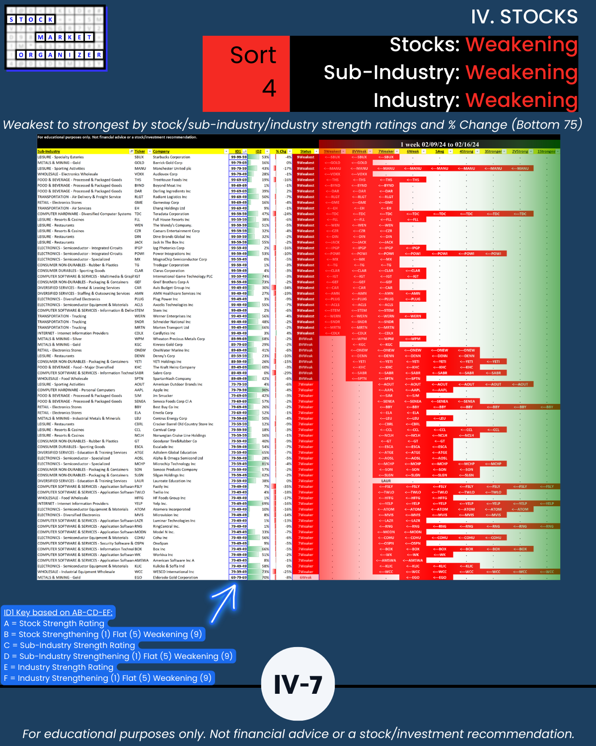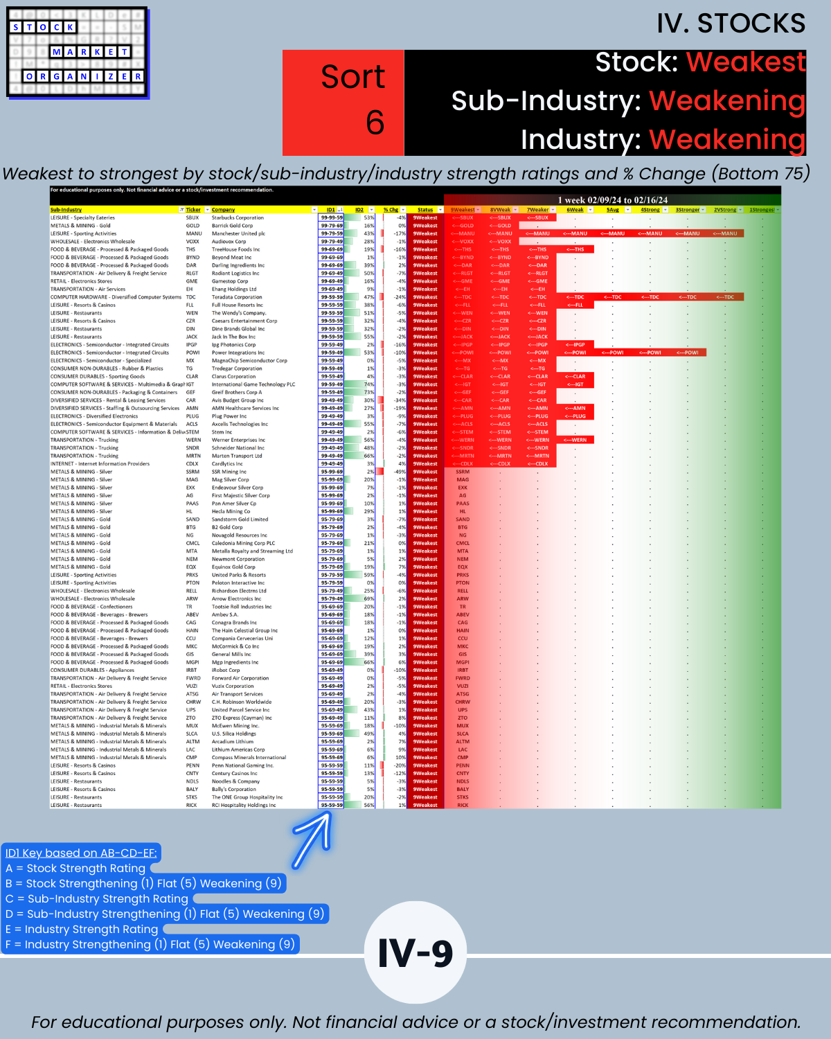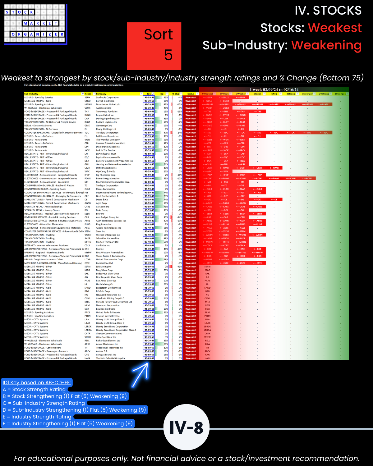 🔹 What are the weakest-rated stocks in weakening sub-industries and industries?