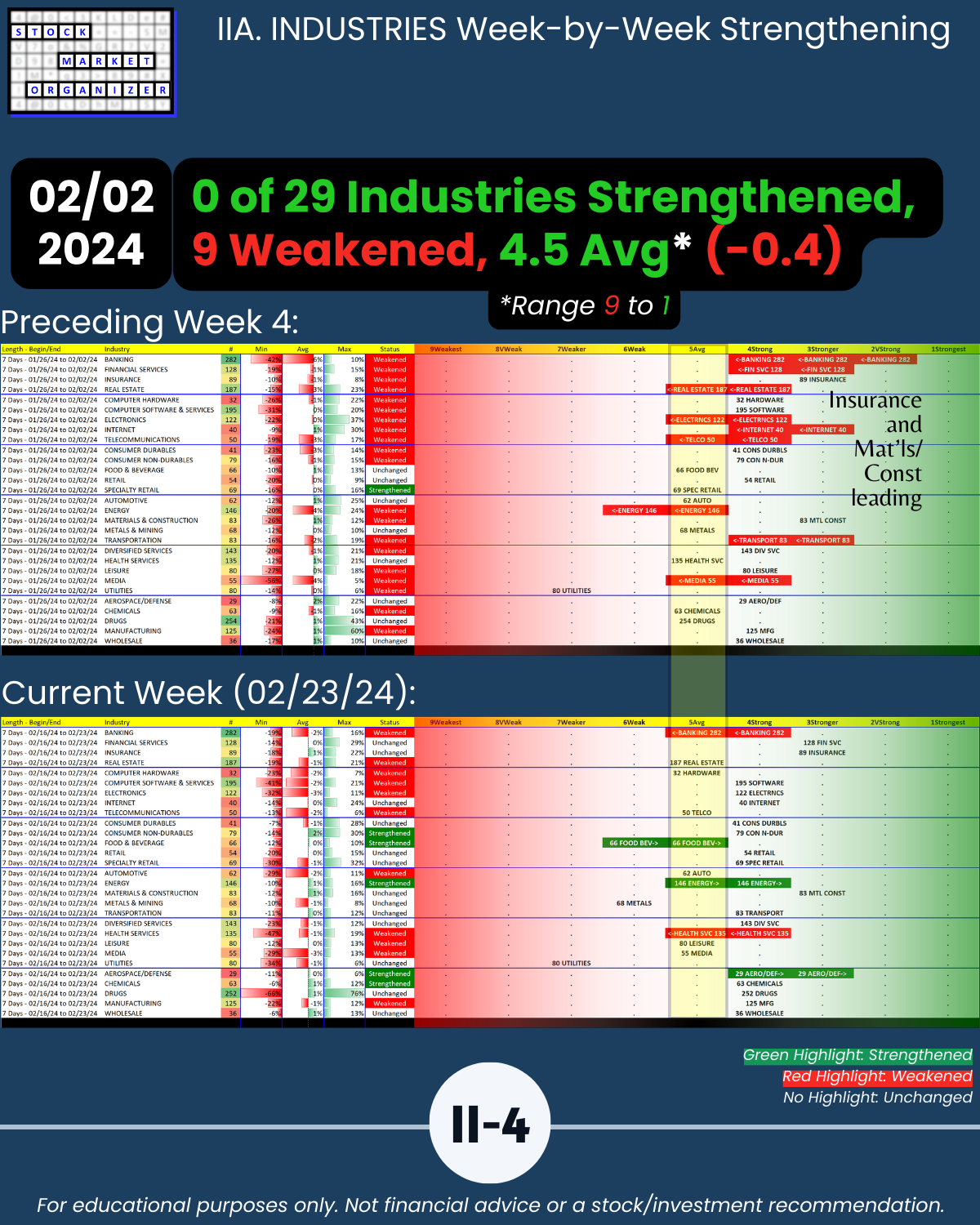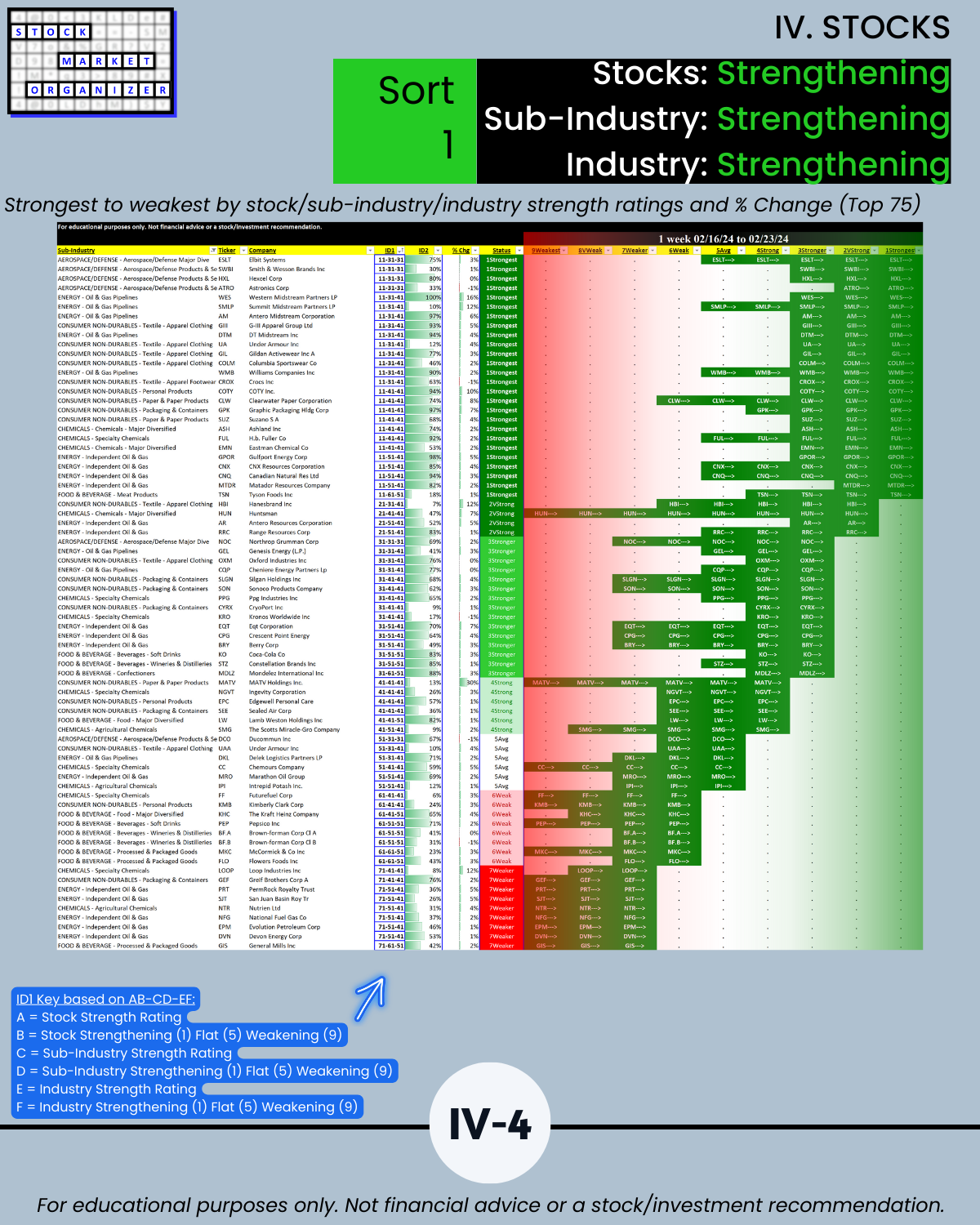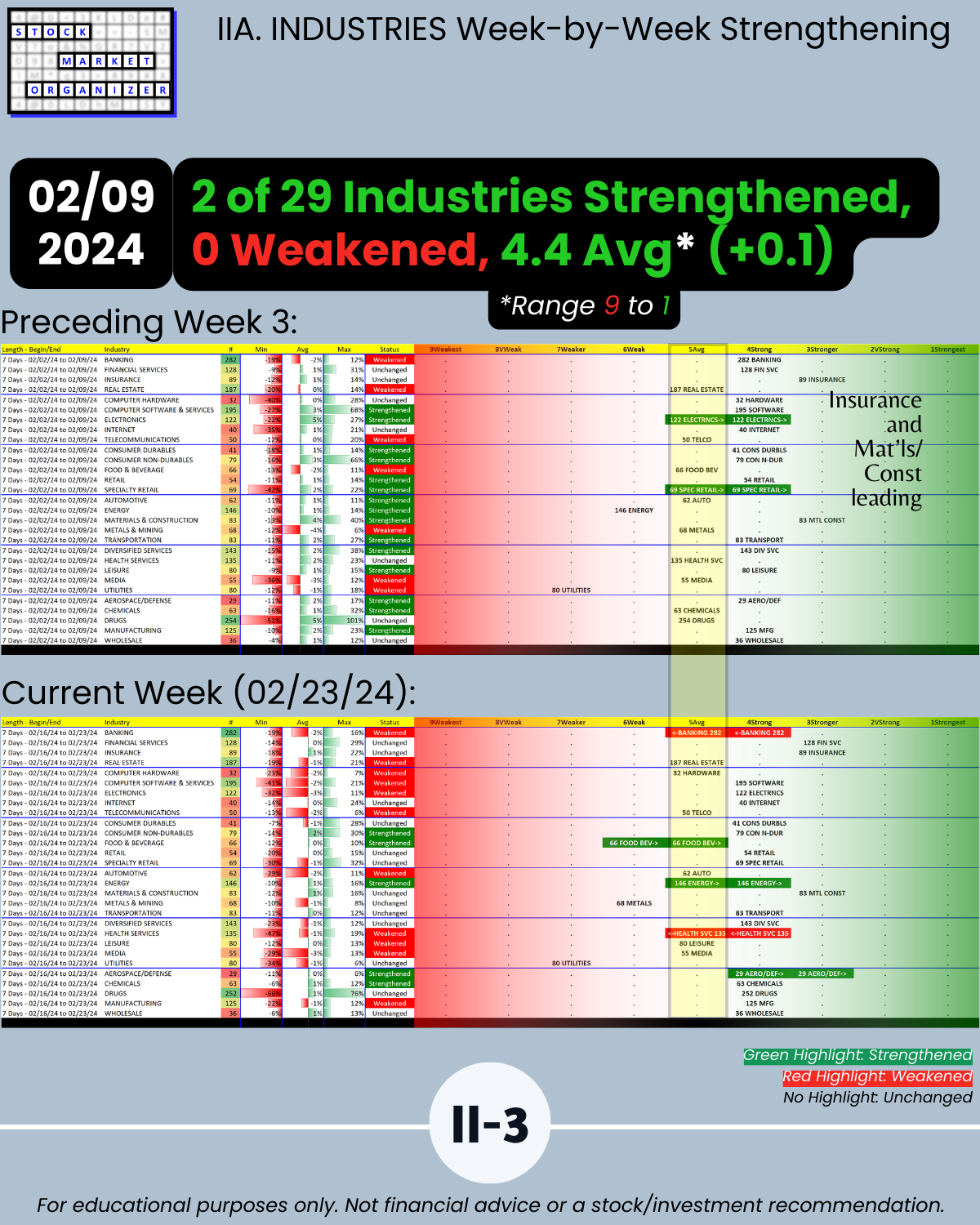 🔹 Financial Services, Insurance, Materials & Construction, and Aerospace Defense = strongest industries at Stronger (3rd strongest of 9 levels)