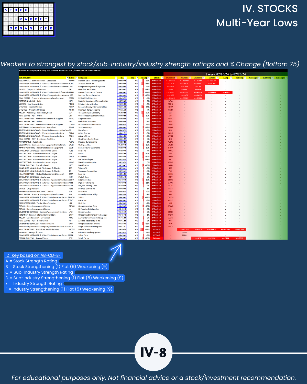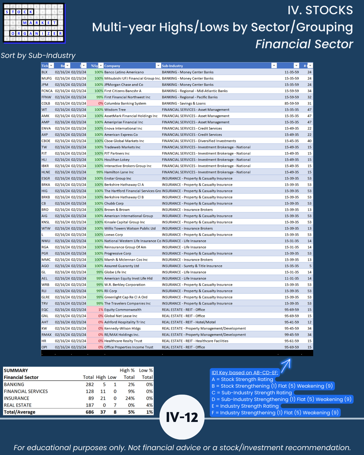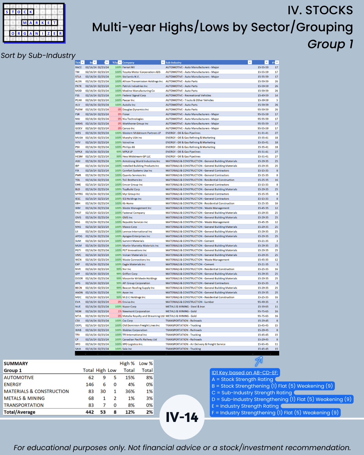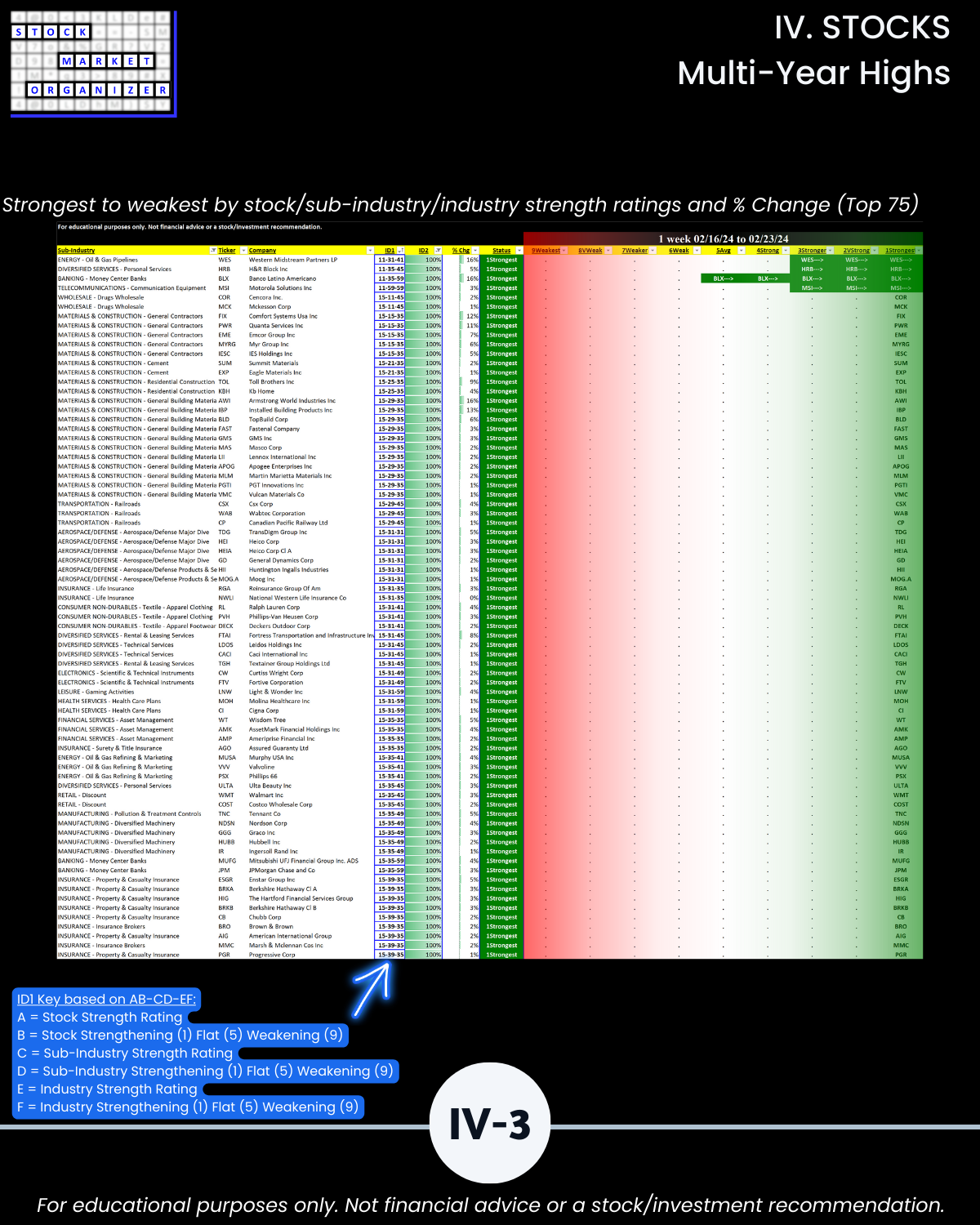 🔹 What stocks are at multi-year highs/lows, and how strong/weak are their sub-industries and industries?