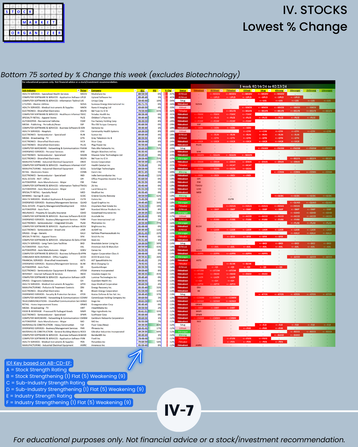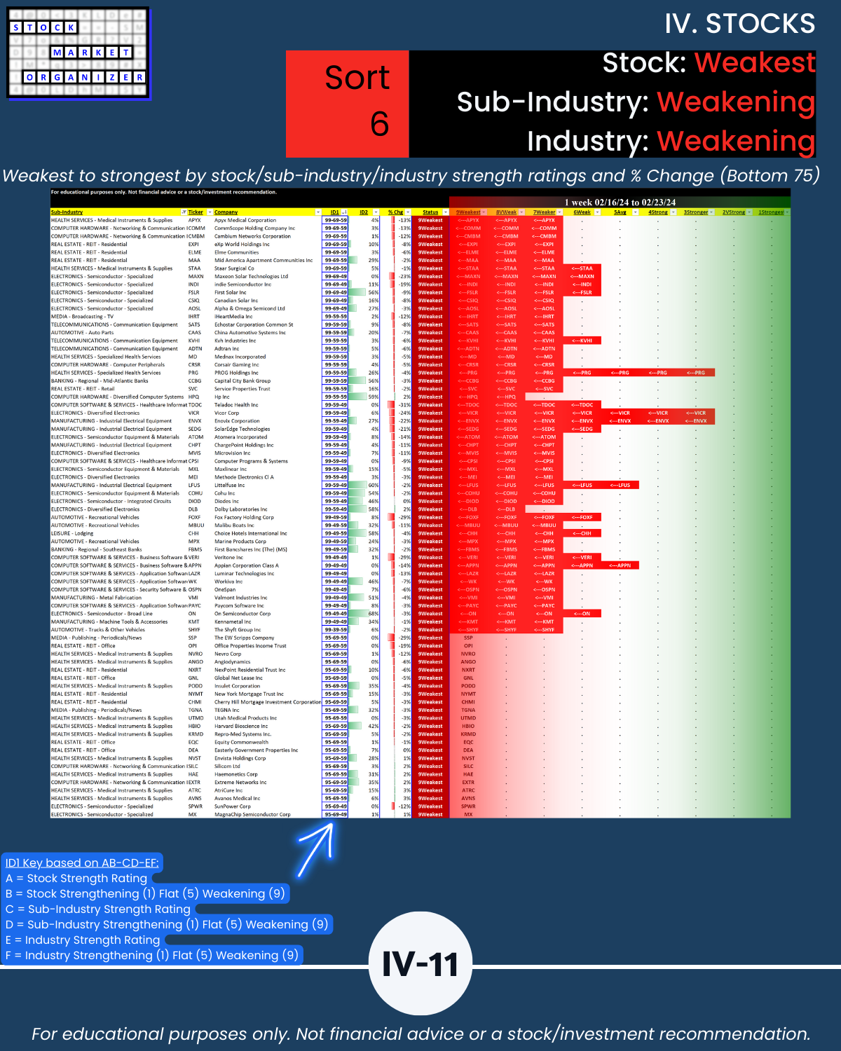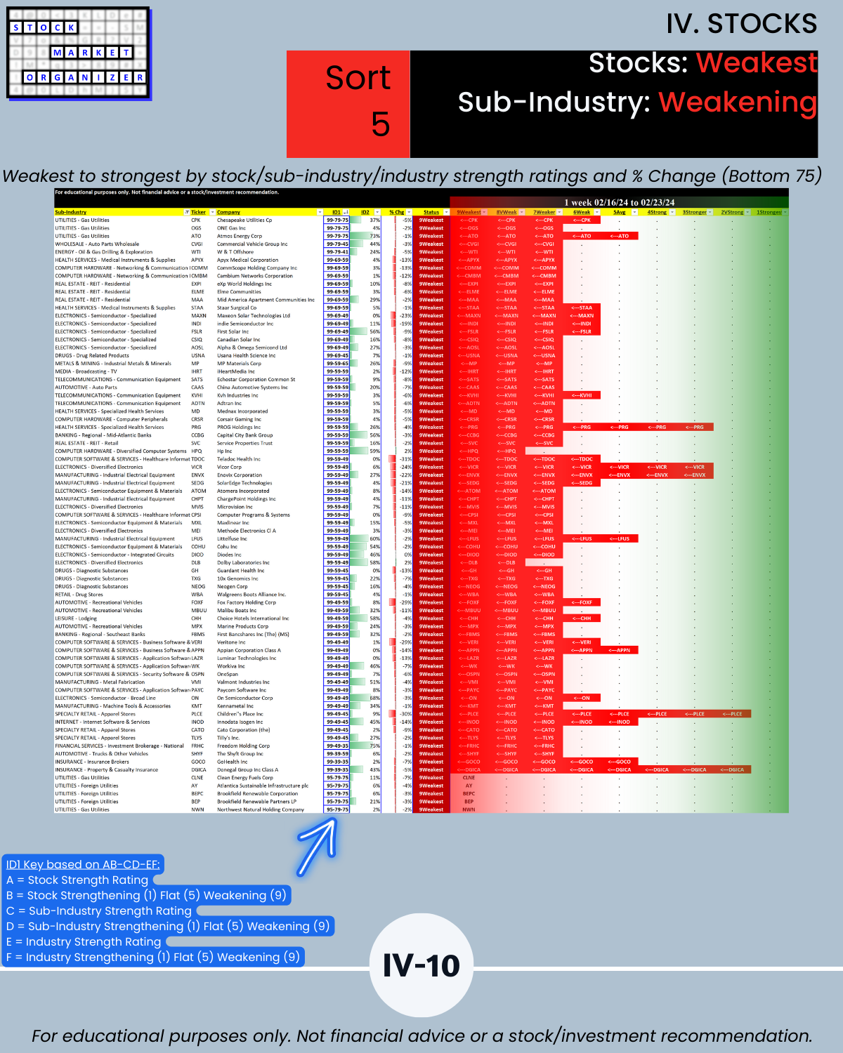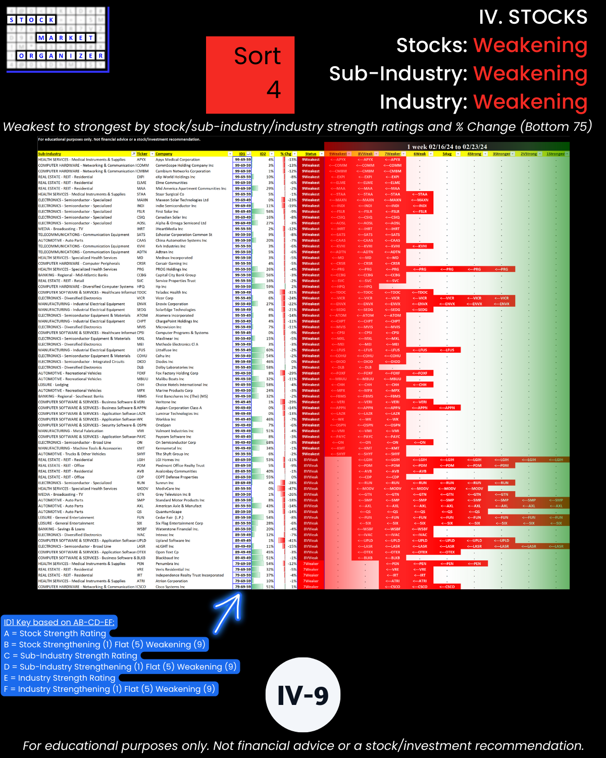 🔹 What are the weakest-rated stocks in weakening sub-industries and industries?