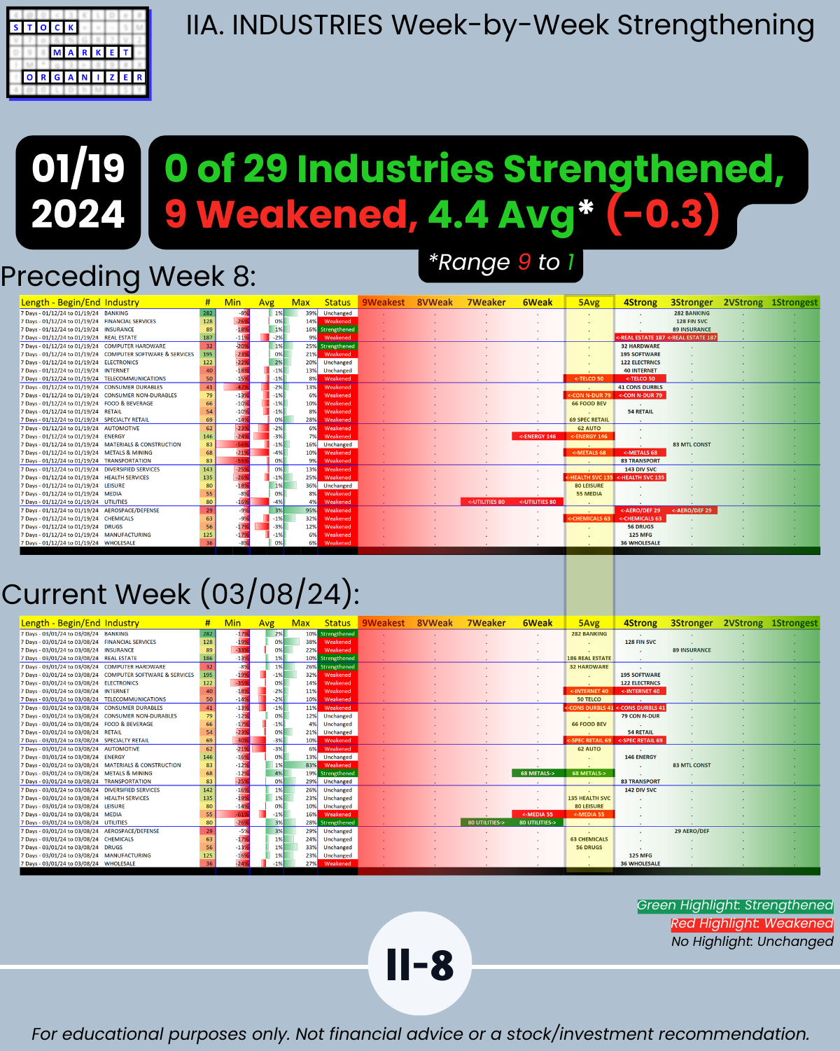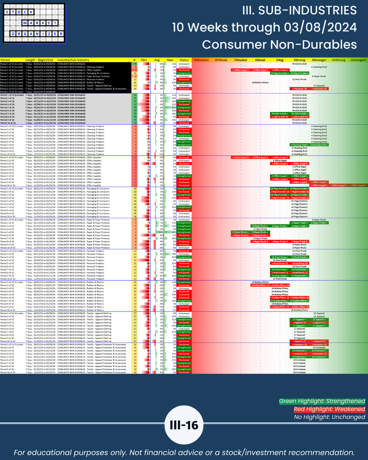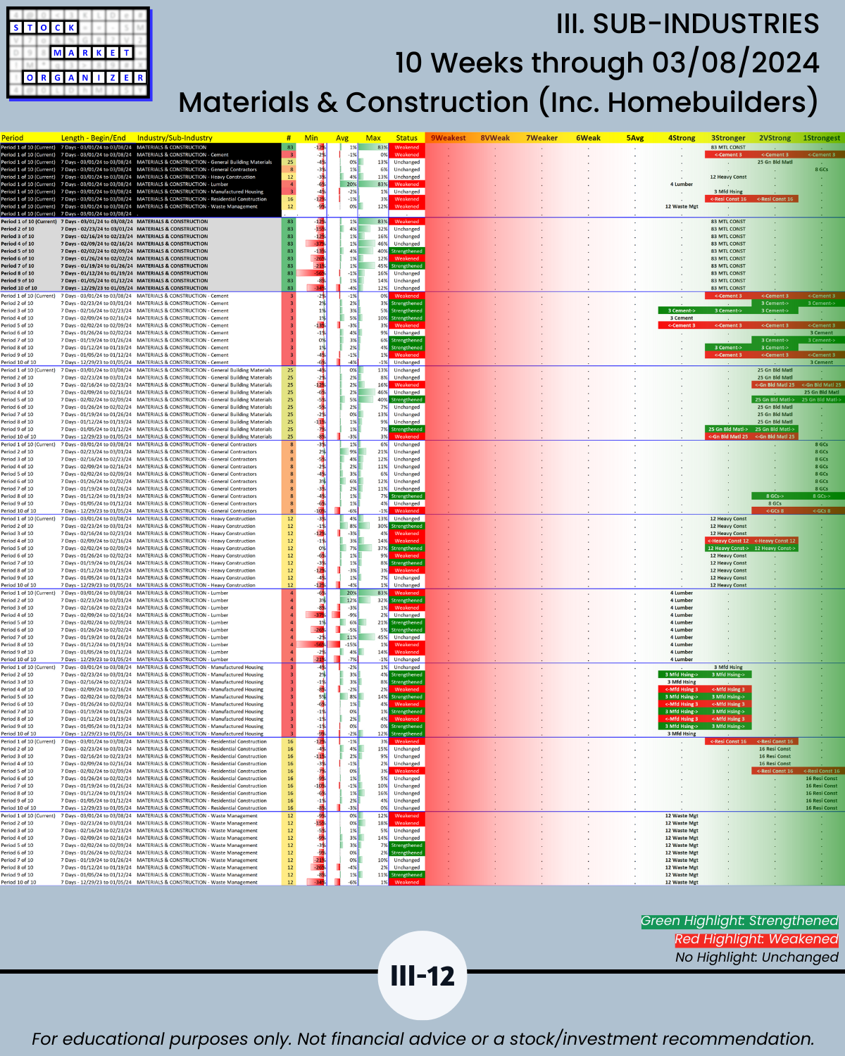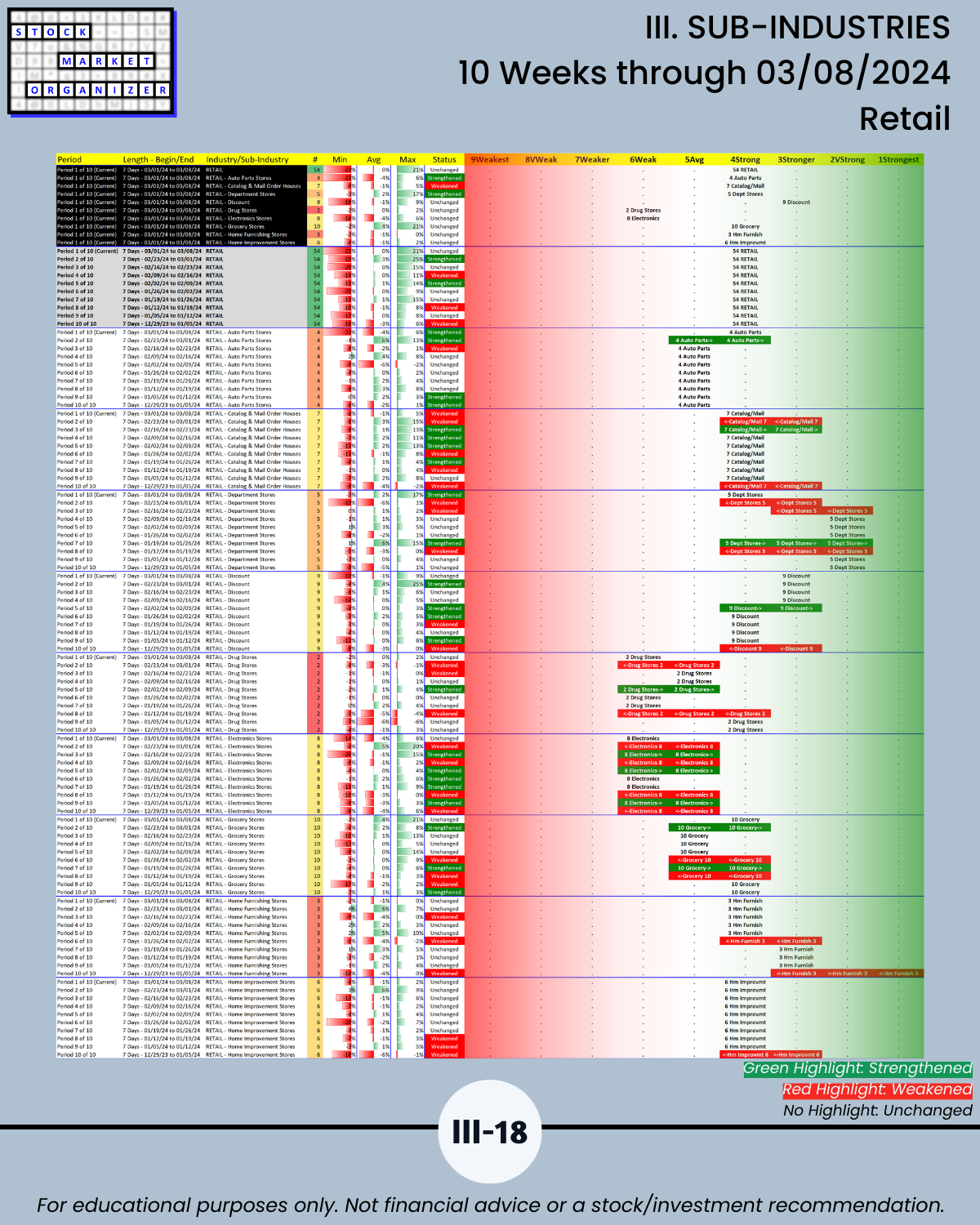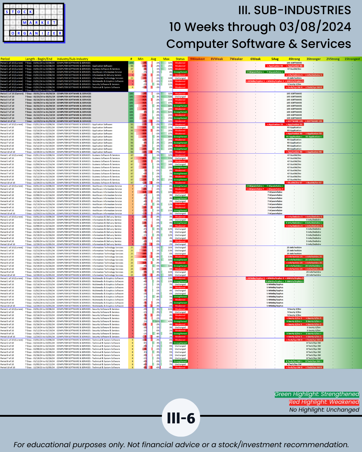 The detail underlying Section II. Meaningfully compare relative and absolute strength amongst/between all the 198 sub-industries, and clearly see how this comparative strength is changing. Know where to look, why, and when, depending on if you are looking for strengthening or weakening.