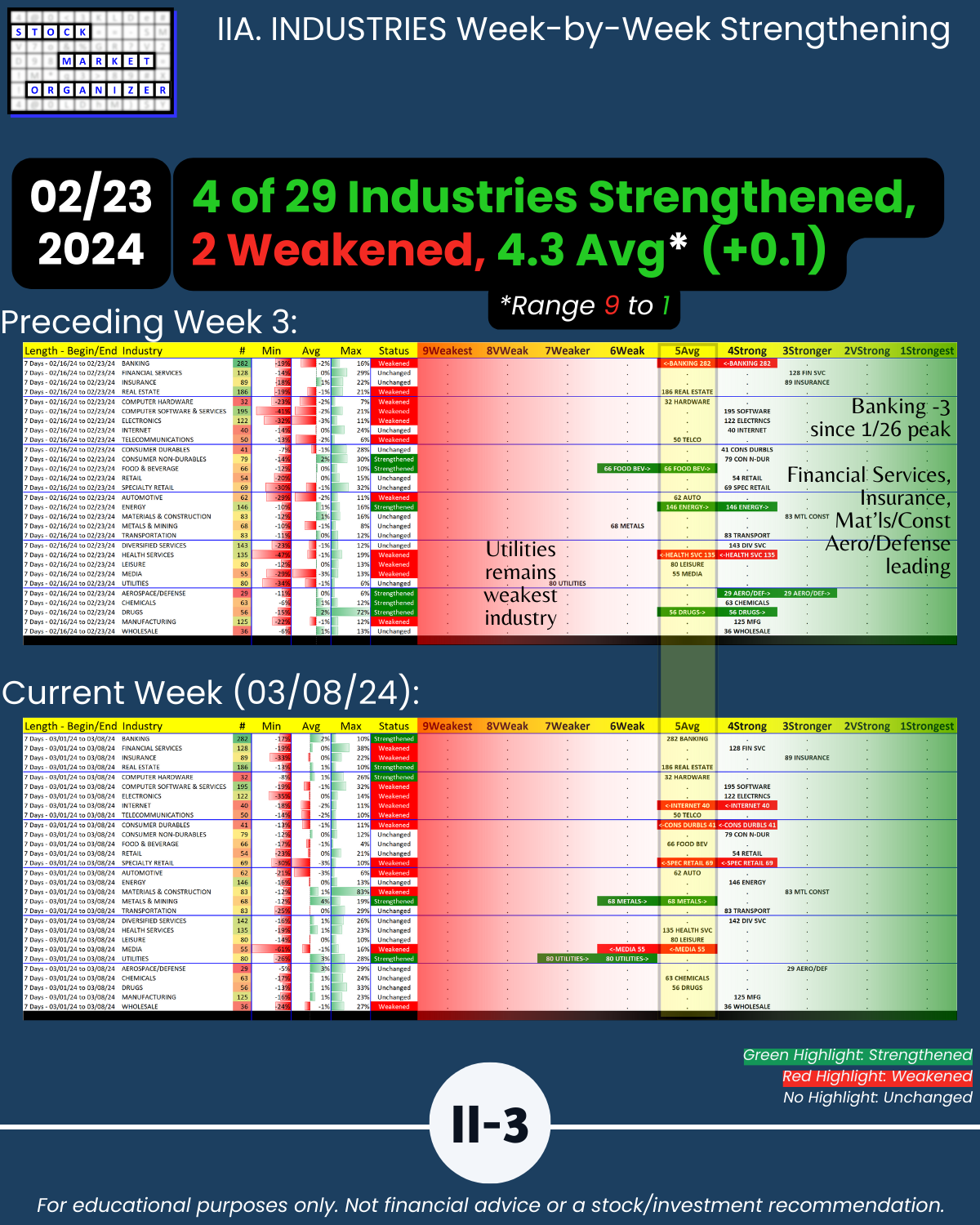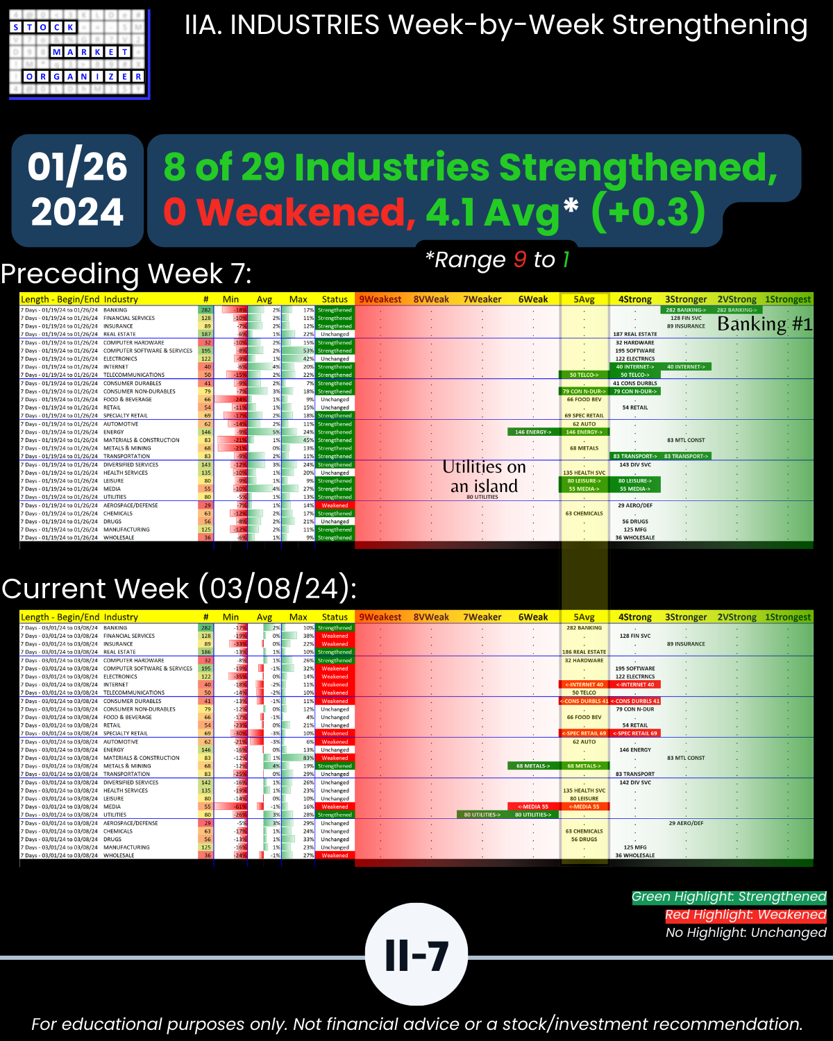 Past 10 weeks strength comparison for the 29 industries in 6 sectors/logical groupings. Utilities has lagged but strengthened this past week. Materials/Construction and Insurance have been leaders the whole time. Banking led the week ending 1/26/24 but has since weakened 3 levels to Average (5th strongest of 9 levels). Yet, 83% of its stocks were positive this last week.