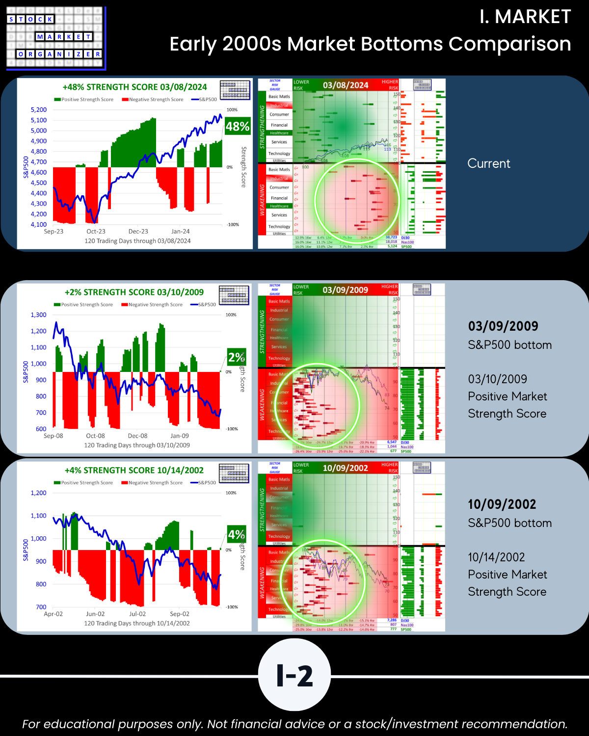 Market Strength Score with examples of previous market bottoms for context. At those bottoms it is clear the market is extended. (Still, many insist it’s not possible to time the market. Okay, Jan. Let’s agree there are times to be aggressive and times to be conservative, and those with the right tools and an open mind can tell the difference enough to make a difference.)
