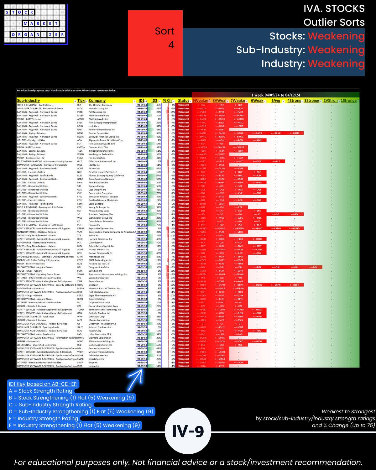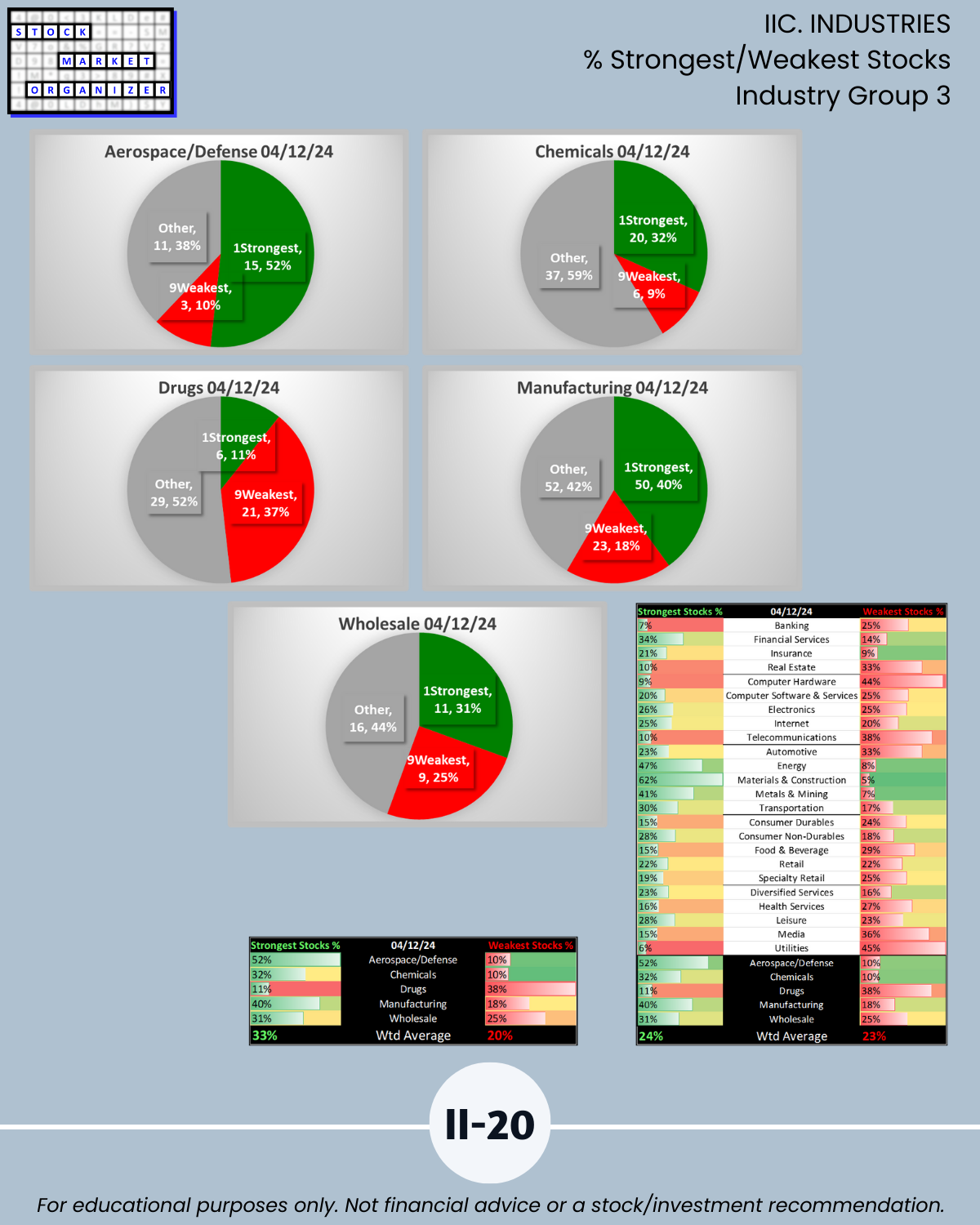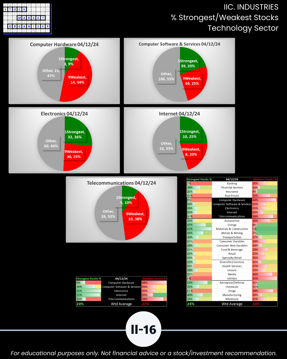 Attached: your cure for 4/12/24 U.S. stock market confusion. Whether retail or institutional, a participant or an advisor, this original and unique strength-focused, top-down, bottom-up, and inside-out perspective can complement your views no matter what they are. BOTTOM LINE – A SECOND WEEK OF BROAD WEAKENING. By the numbers: 🔹 29 industries: 27 weakened (vs. 26 last week), 🔹 198 sub-industries: 74% (vs. 68% last week) weakened, only 5% strengthened 🔹 2,669 stocks: 87% negative (vs. 78% last week).