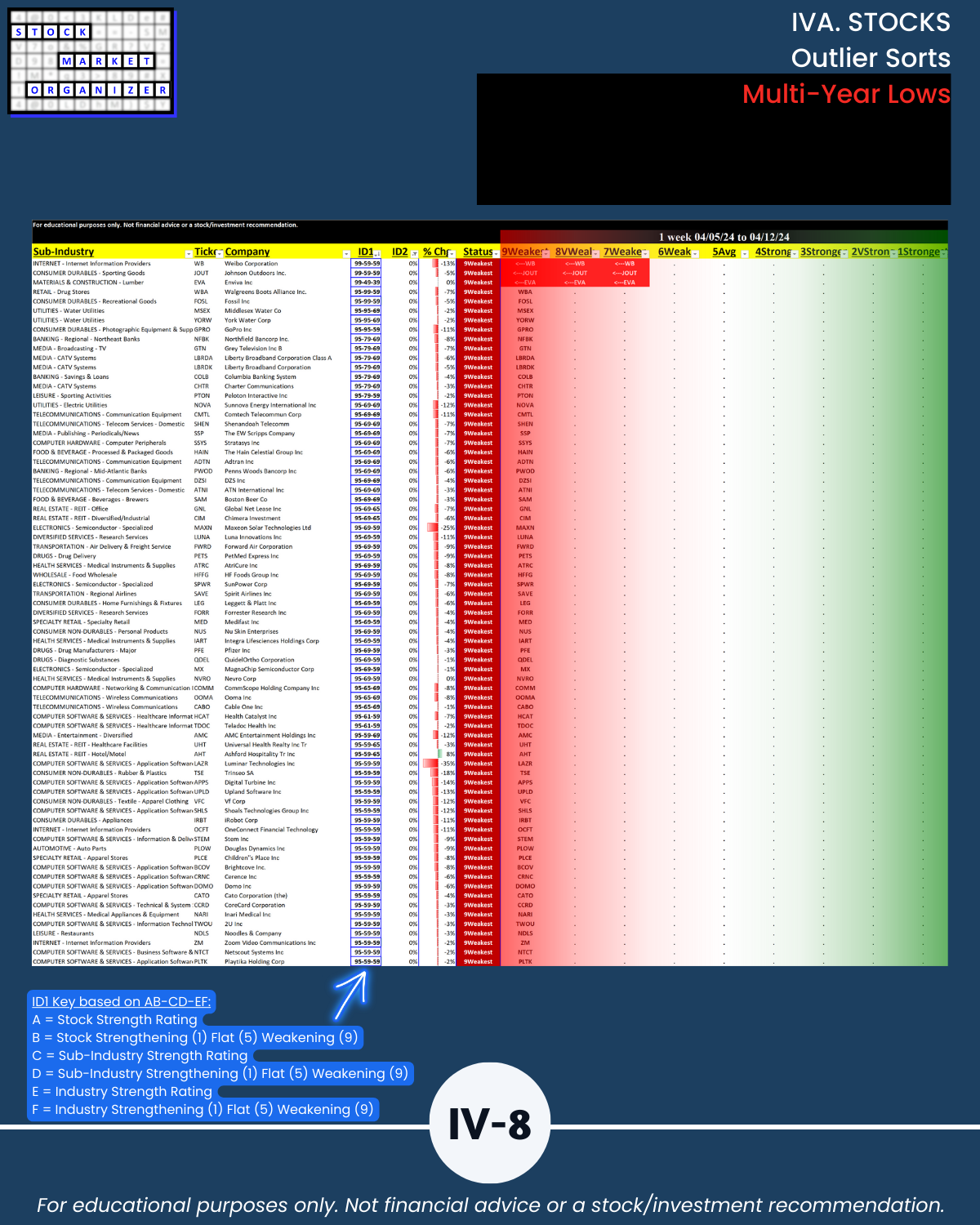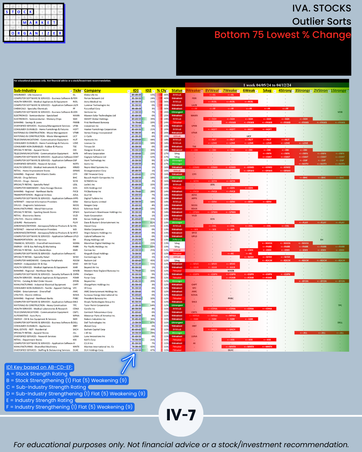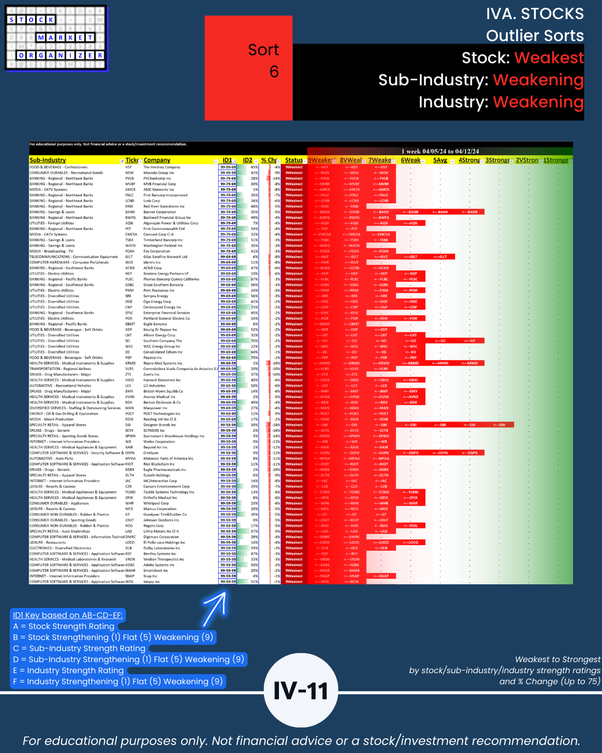 Attached: your cure for 4/12/24 U.S. stock market confusion. Whether retail or institutional, a participant or an advisor, this original and unique strength-focused, top-down, bottom-up, and inside-out perspective can complement your views no matter what they are. BOTTOM LINE – A SECOND WEEK OF BROAD WEAKENING. By the numbers: 🔹 29 industries: 27 weakened (vs. 26 last week), 🔹 198 sub-industries: 74% (vs. 68% last week) weakened, only 5% strengthened 🔹 2,669 stocks: 87% negative (vs. 78% last week).