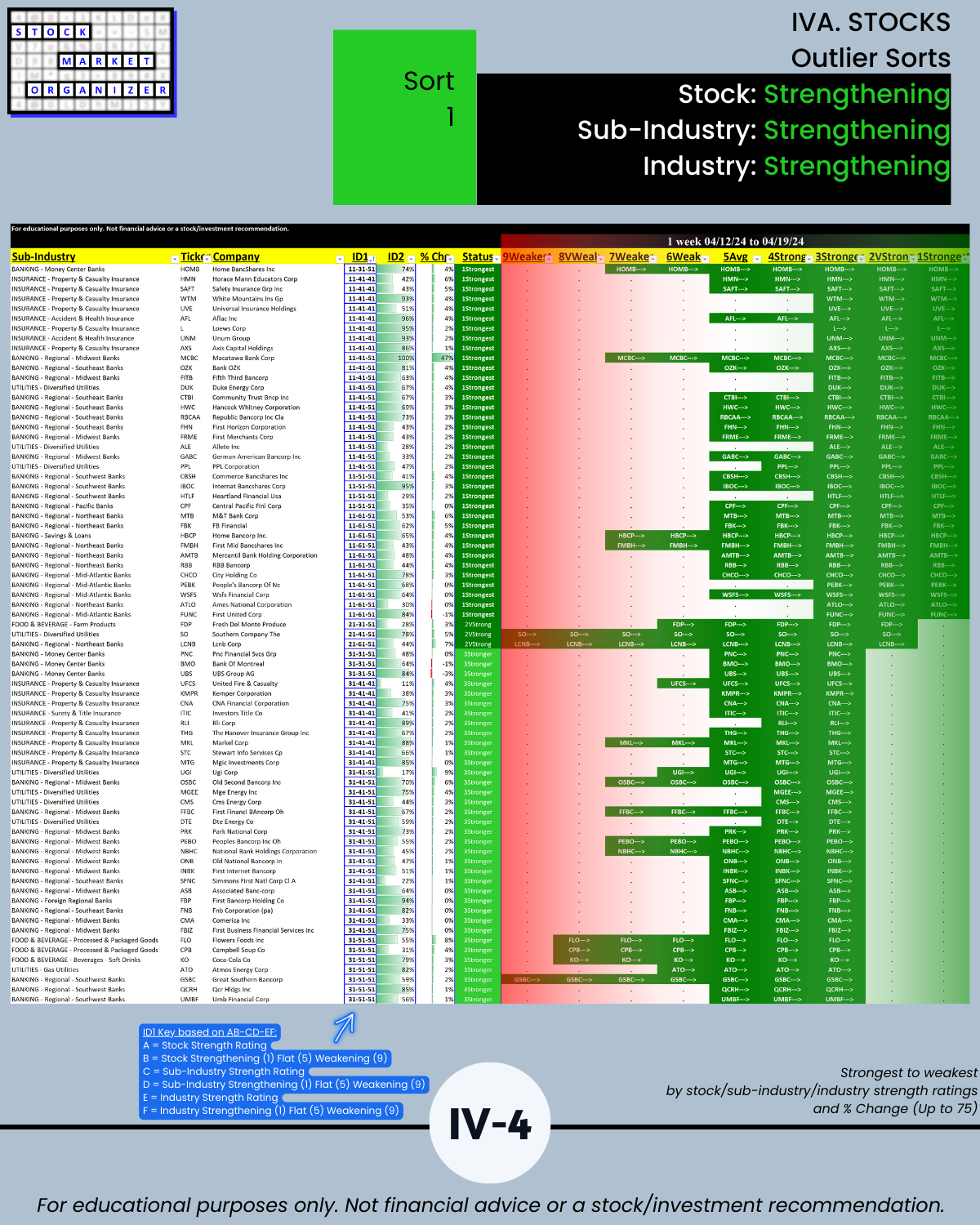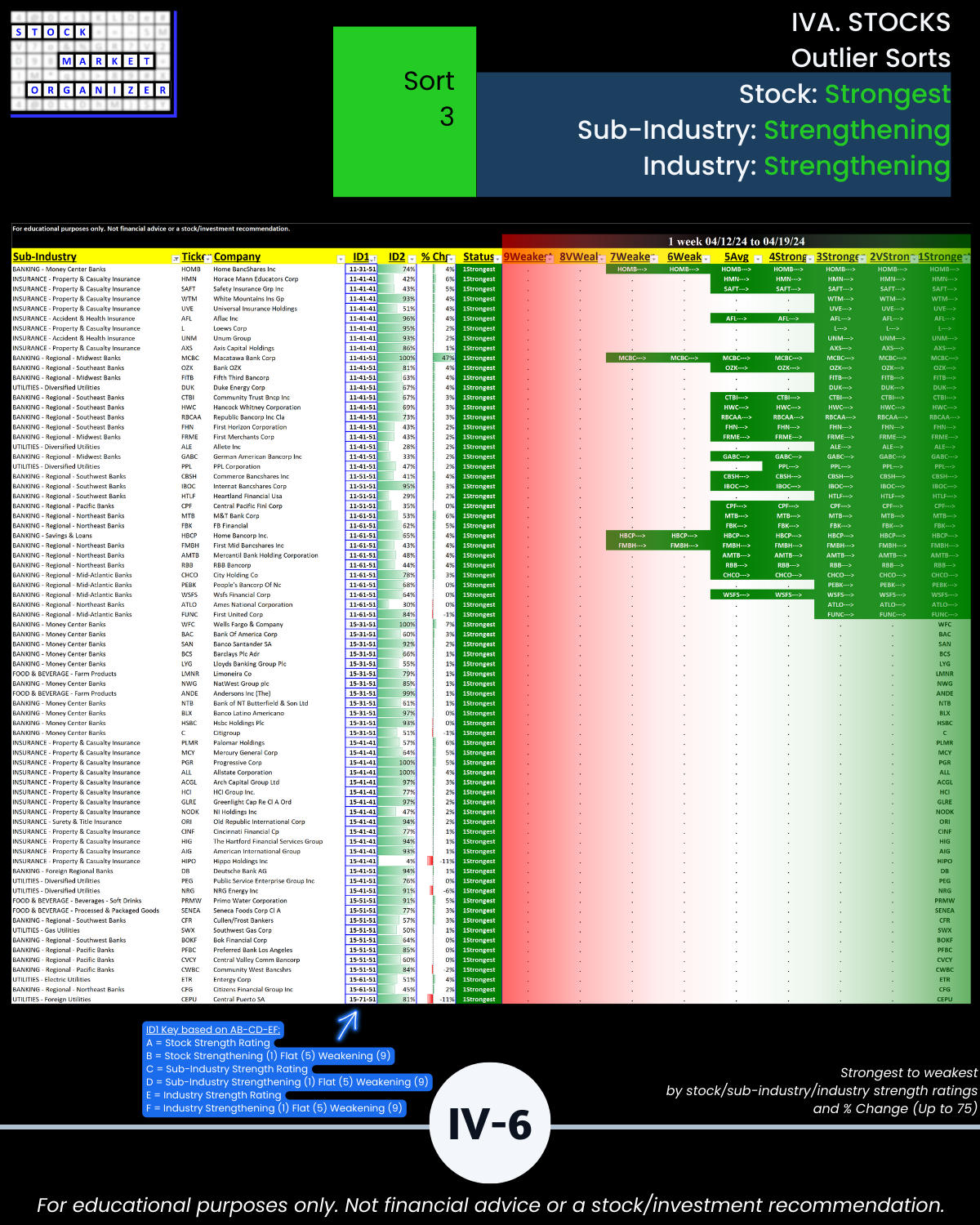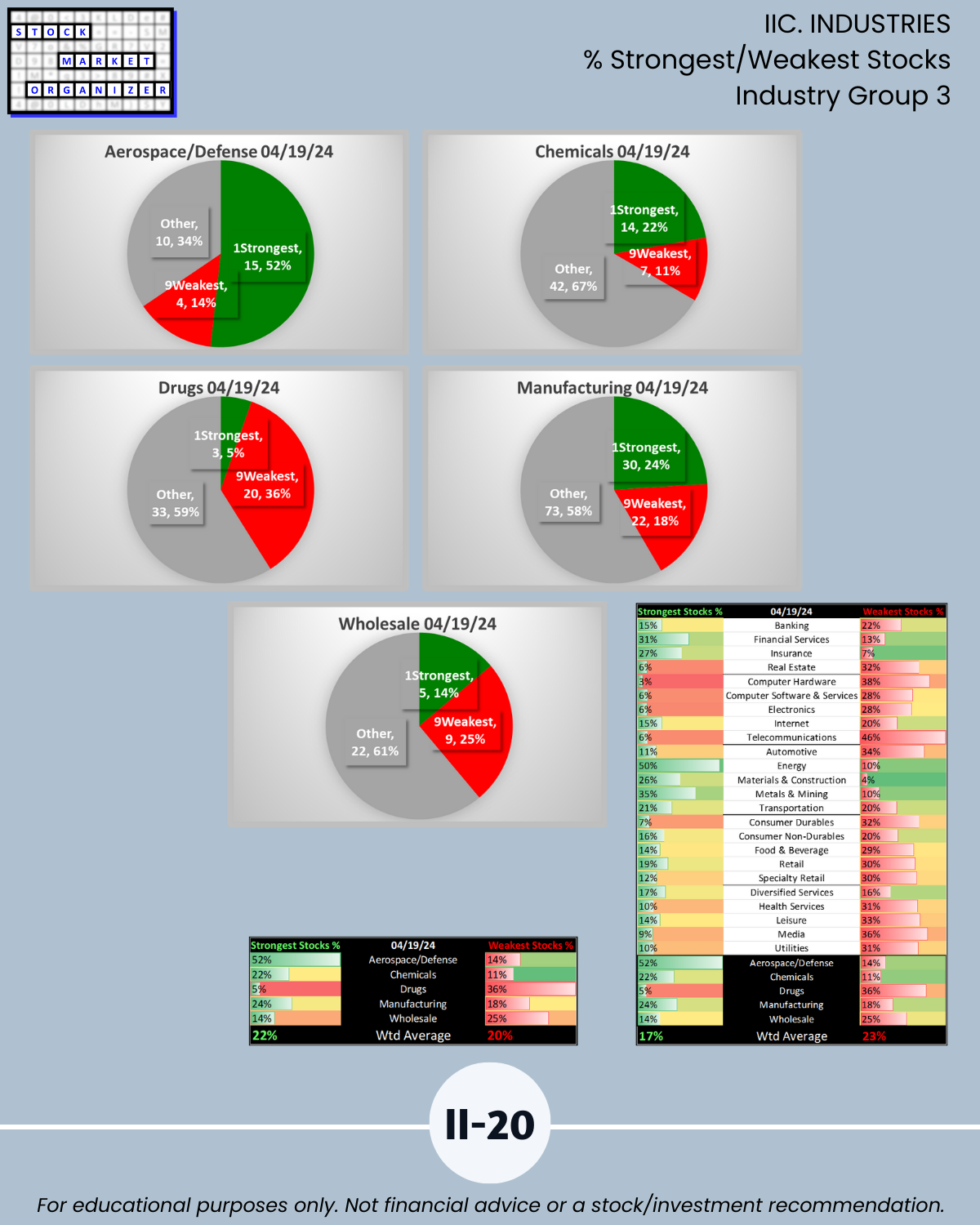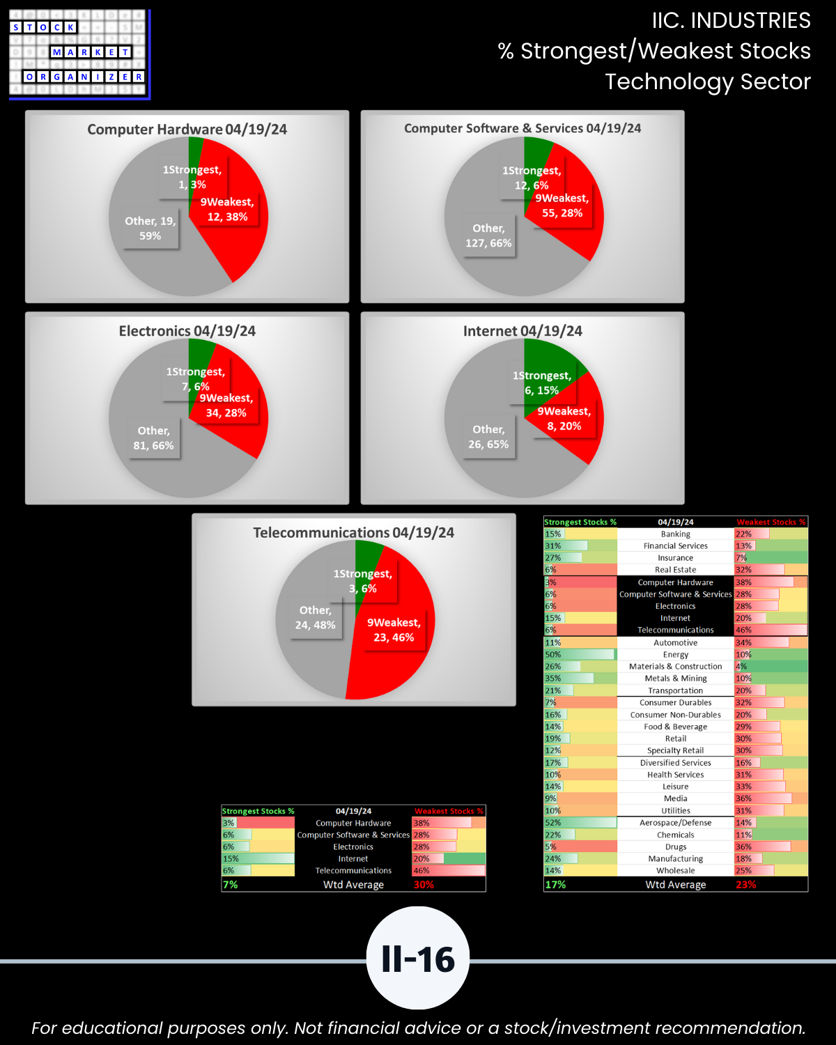 U.S. stock market 4/19/24 - to convert confusing chaos into crystal clear, calming context, see the attached unique strength-focused review. It looks at the market from the top-down, inside-out, and bottom up. It is original with insights unavailable elsewhere that will complement all other market views. Including yours. BOTTOM LINE β LESS WEAKENING STILL MEANS WEAKENING. (Especially if you own NVDA and/or SMCI.) By the numbers: πΉ 29 industries: 3 strengthened rankings (Banking, Food & Beverage, and Utilities) as 10 weakened (vs. 0/10 last week), πΉ 198 sub-industries: 20% strengthened and 58% weakened (vs. 5%/74% last week), πΉ 2,667 stocks: 67% negative (vs. 87% last week).