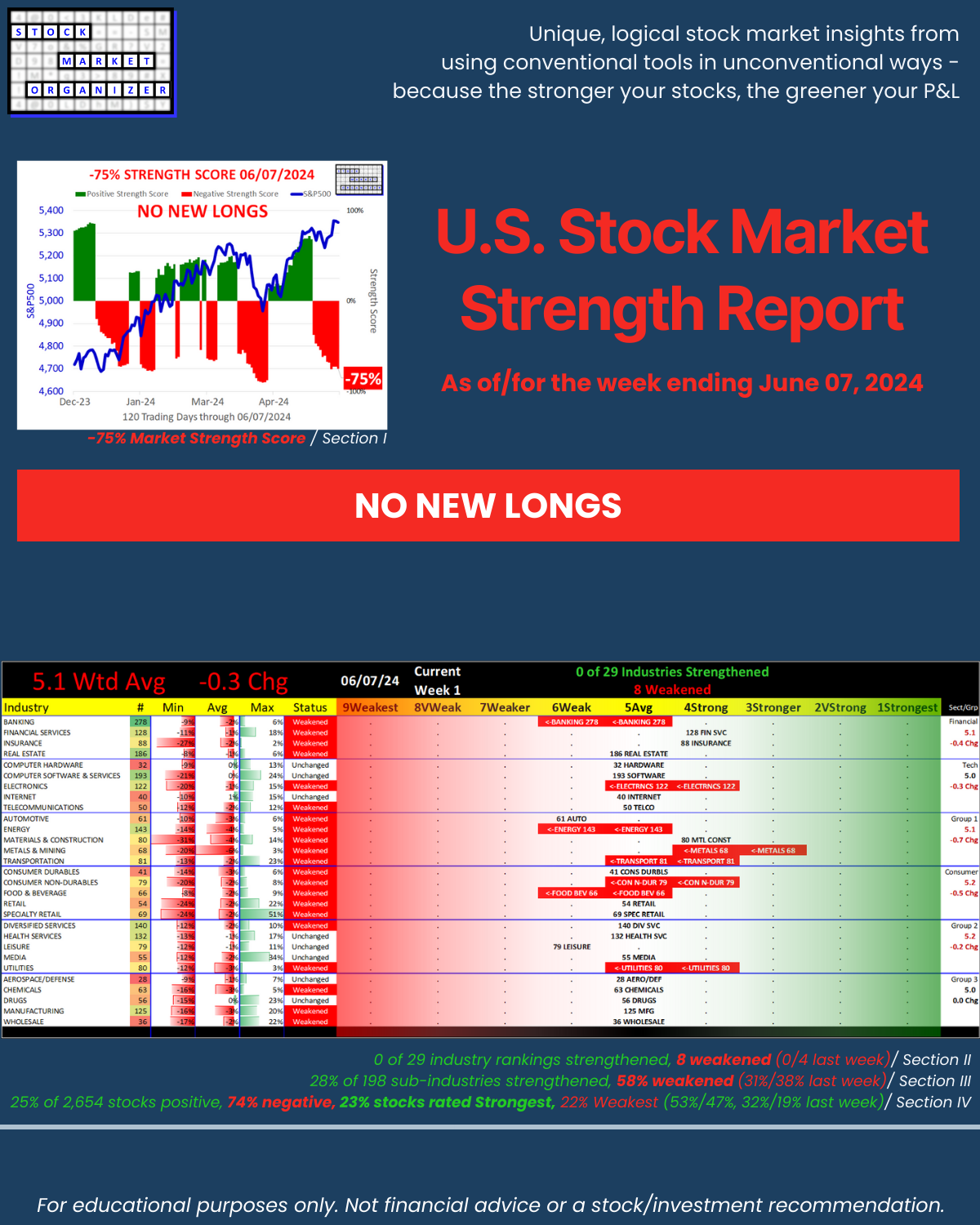 Shield your eyes if you care only about fundamentals, otherwise the attached U.S. stock market strength report as of/for the week ending June 7, 2024 may be of interest.