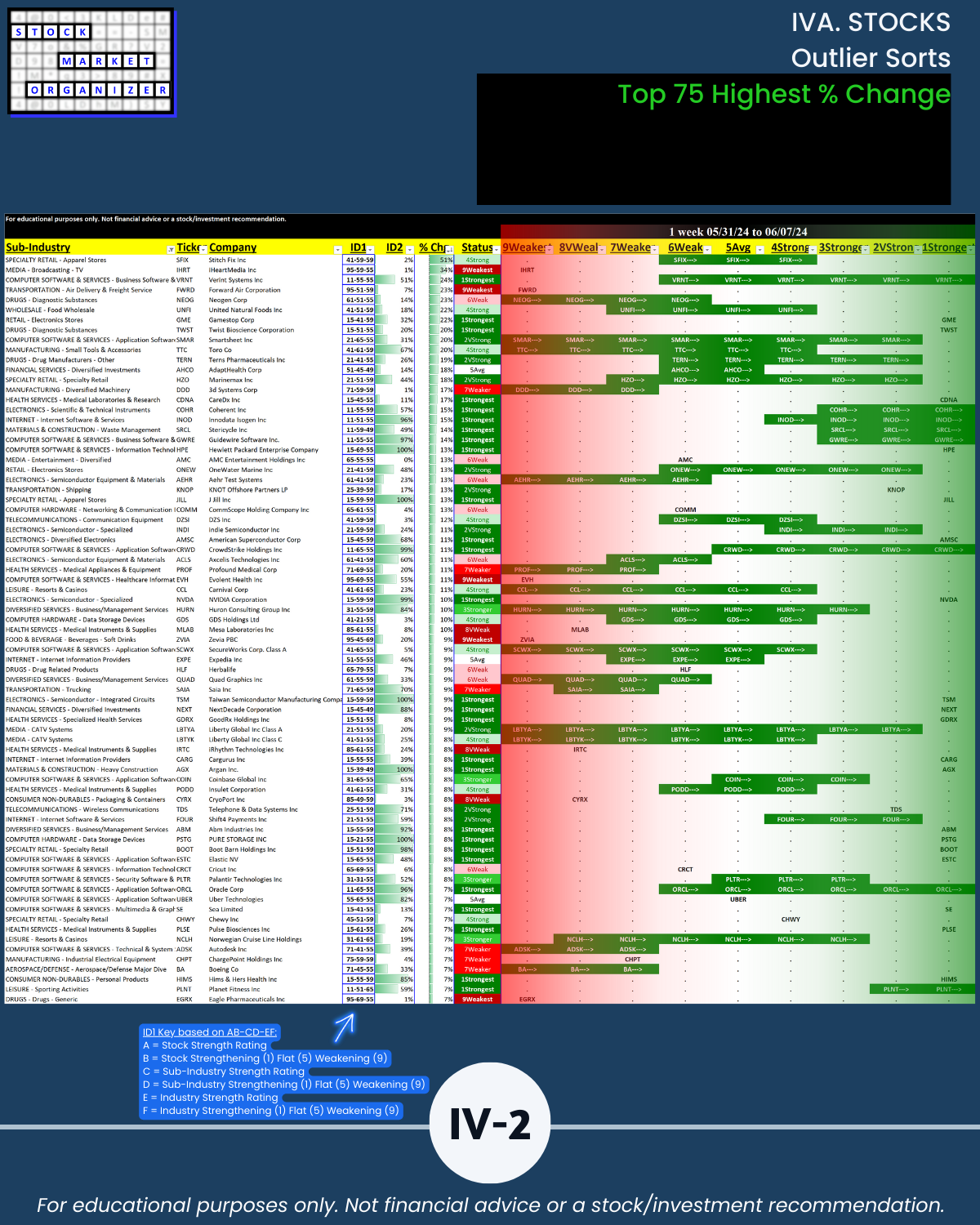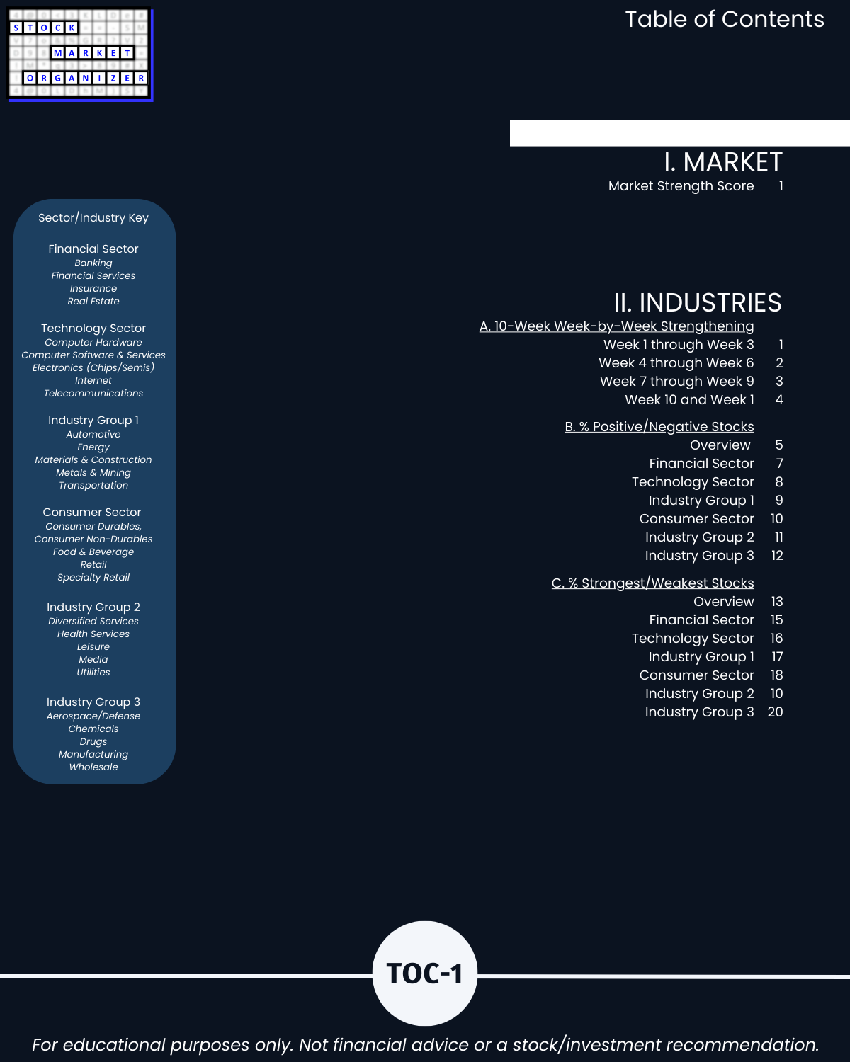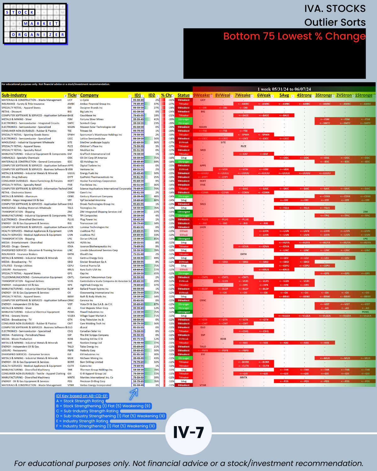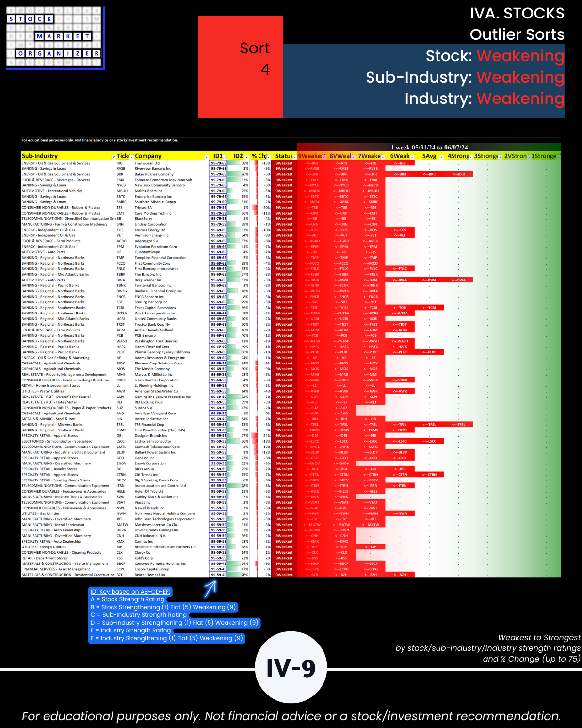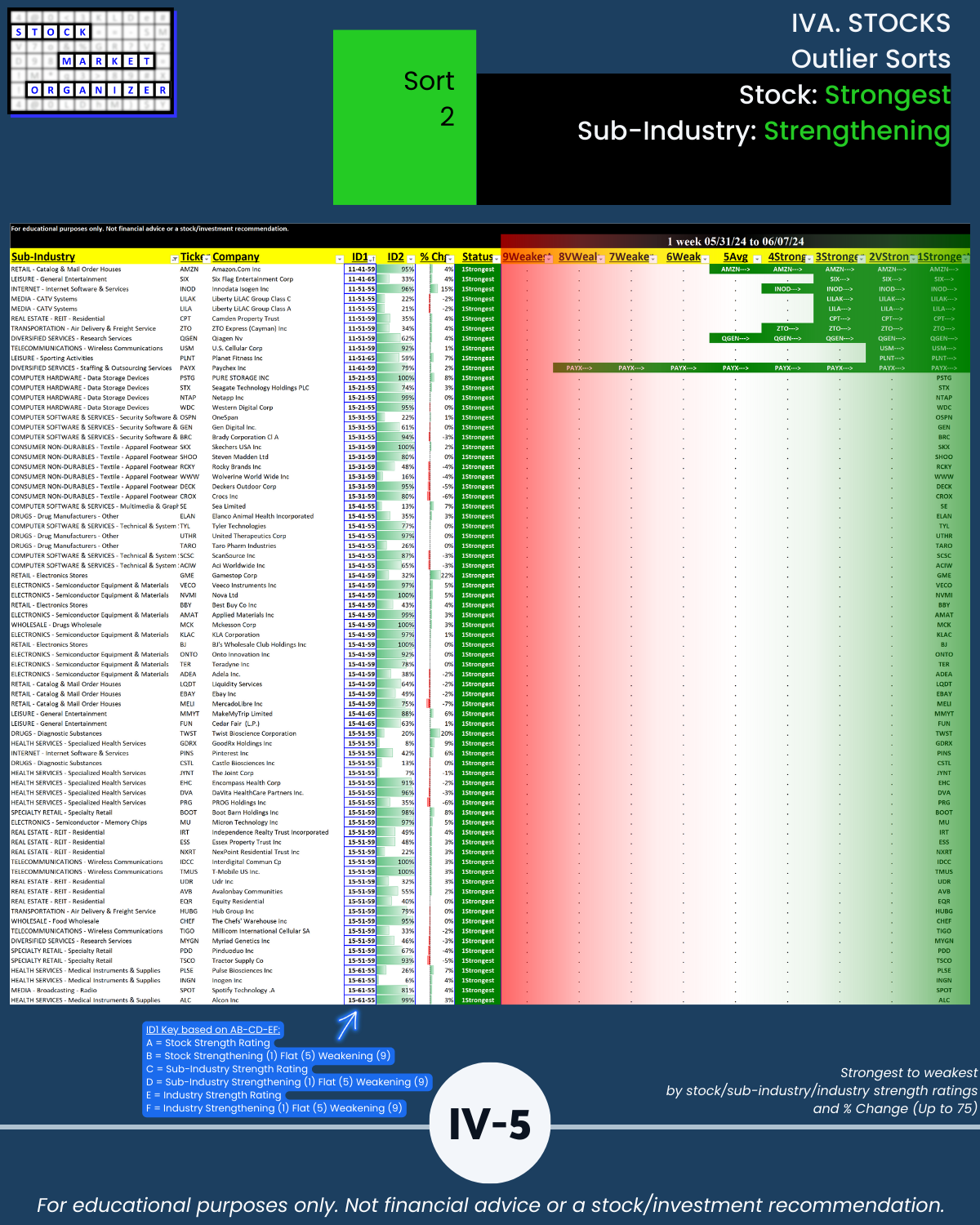 A top-down, inside-out (sector, industry, sub-industry), and bottom-up revealing of strength/strengthening and weakness/weakening throughout the stock market.