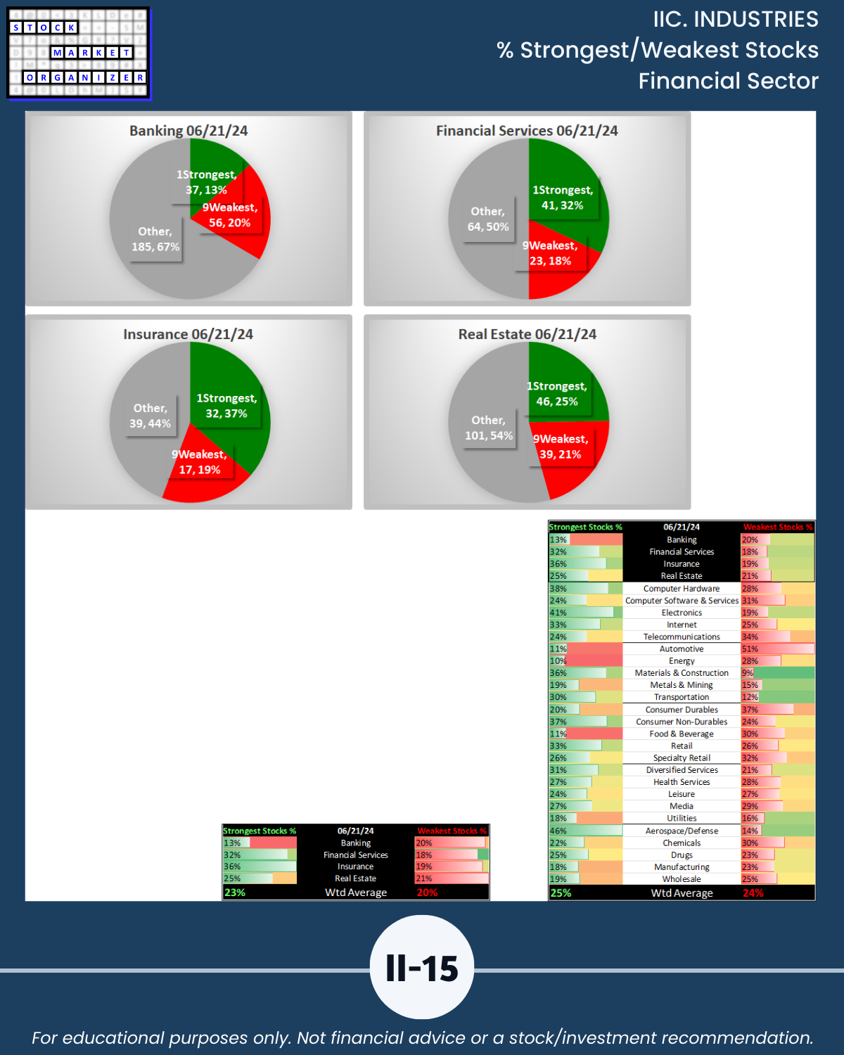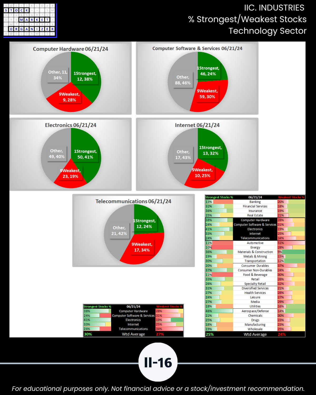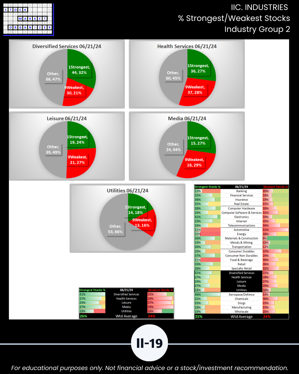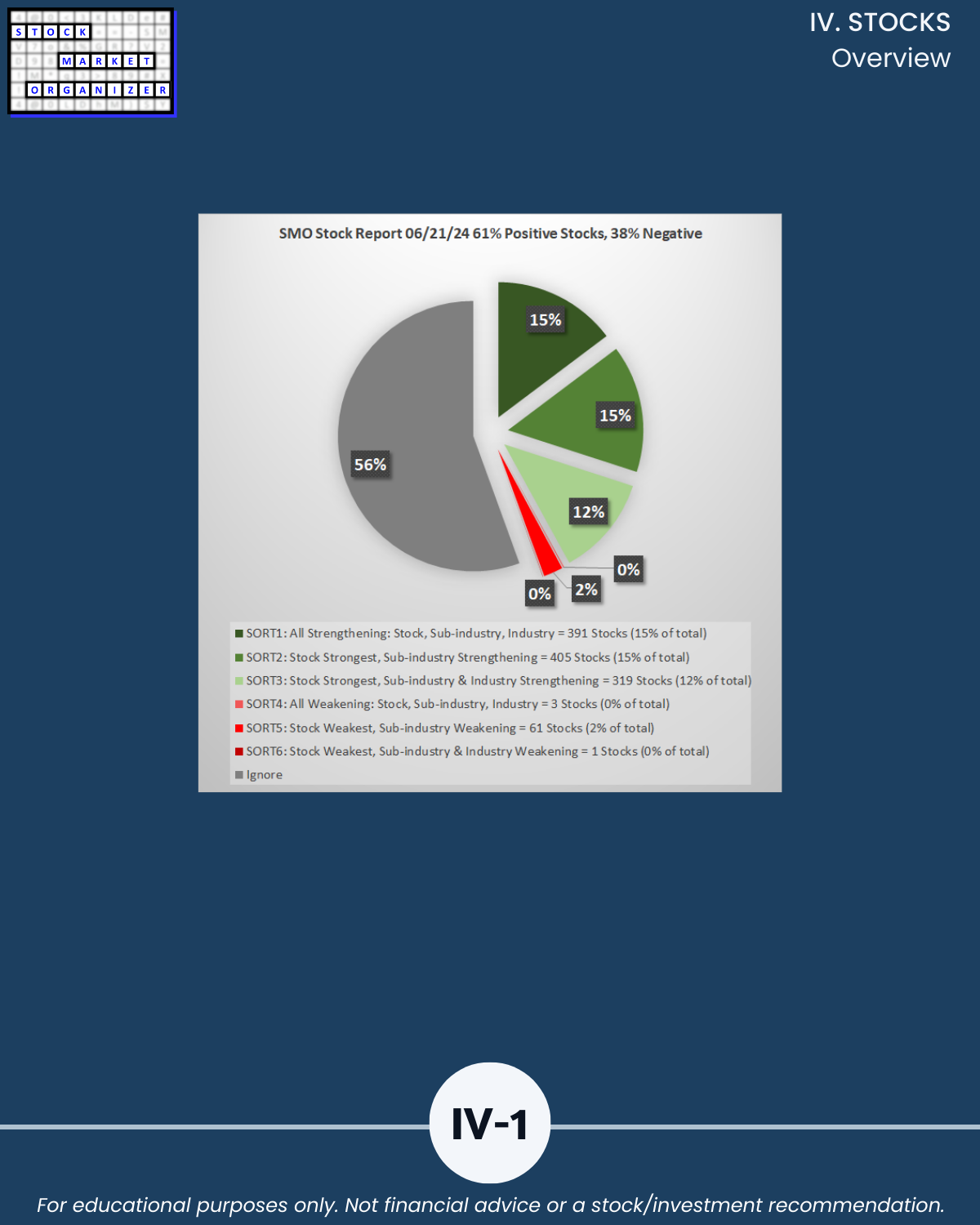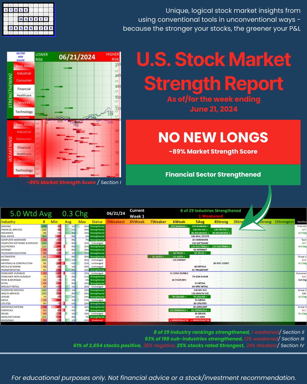 - 61% of 2,654 stocks positive, 38% negative, 25% stocks rated Strongest, 24% Weakest/Section IV