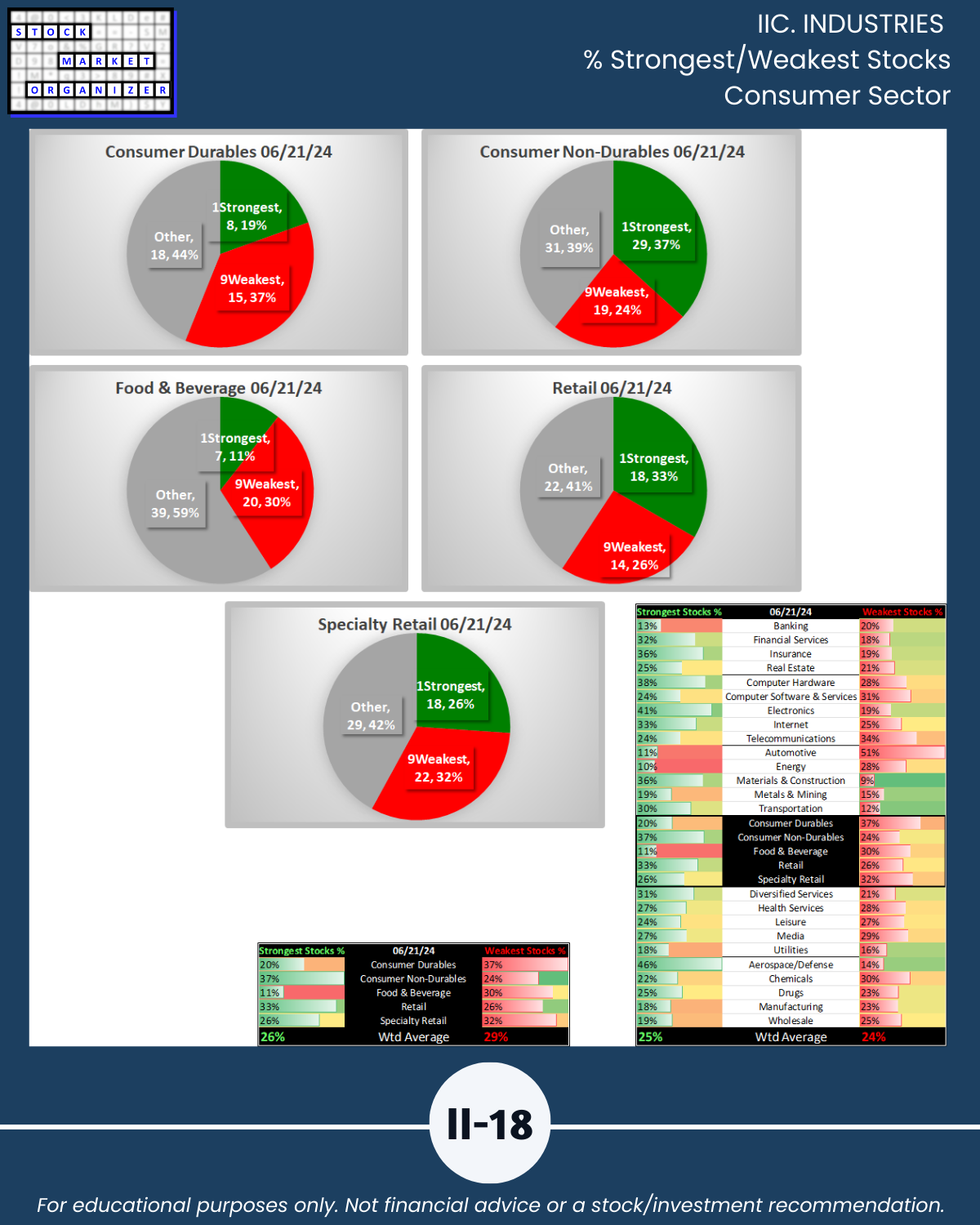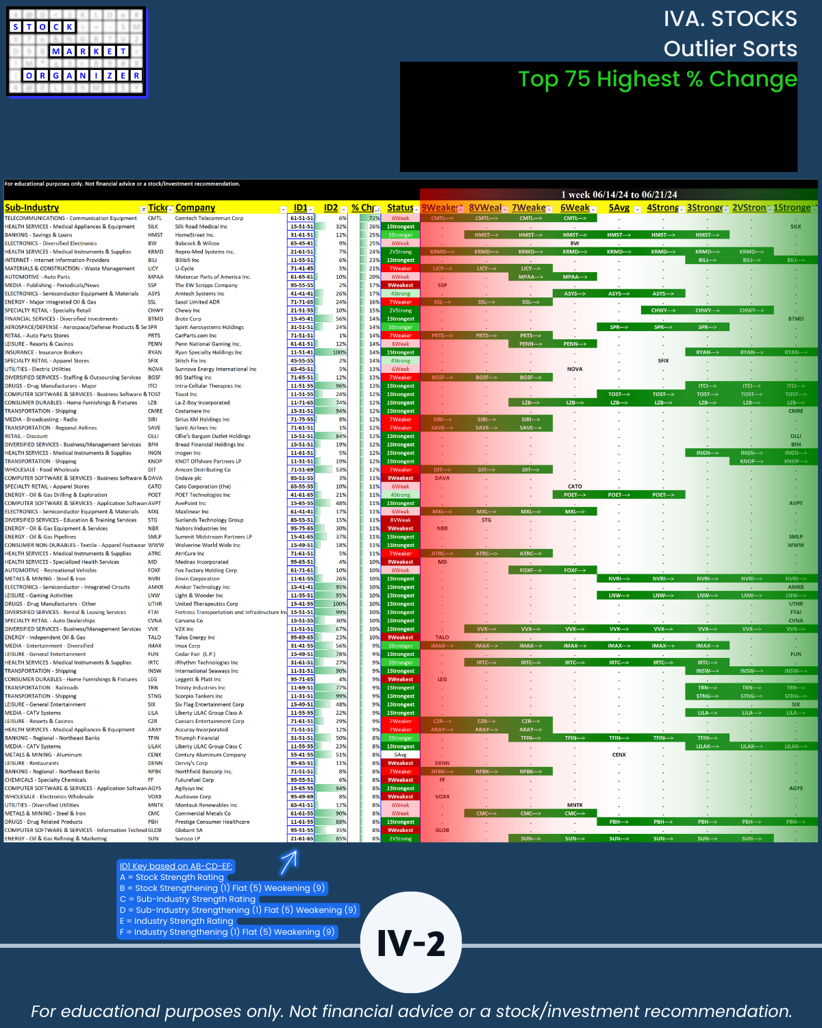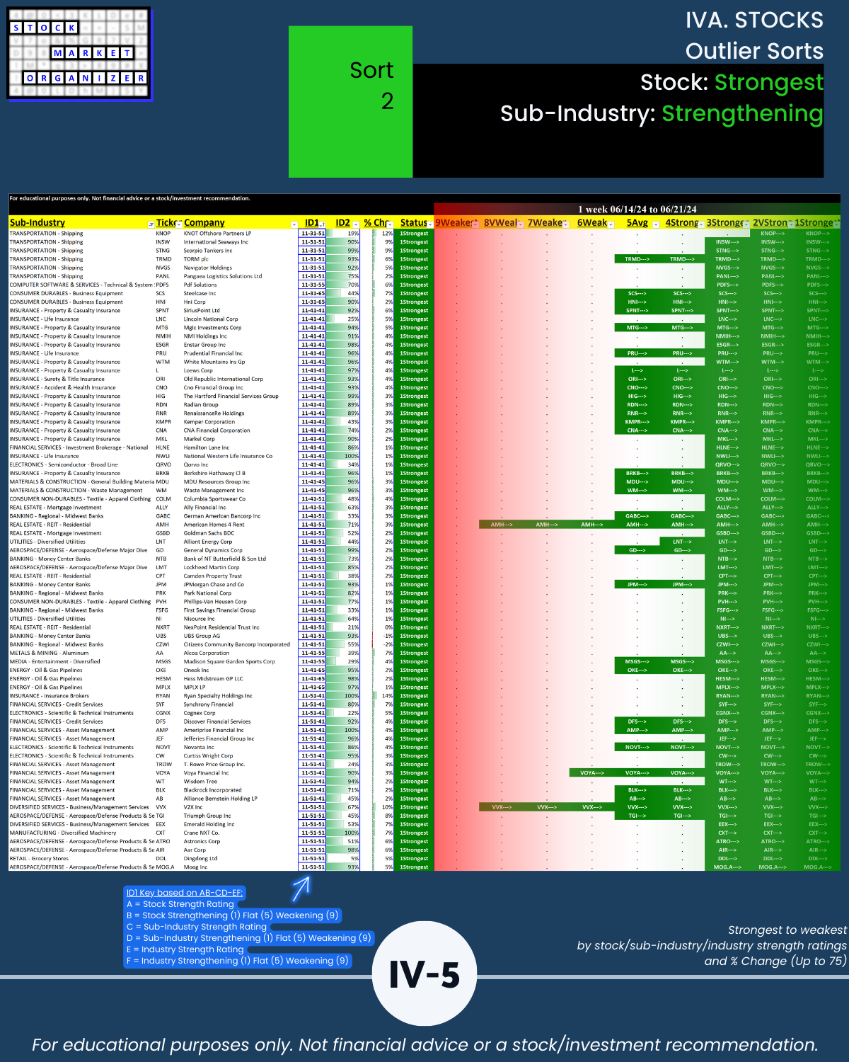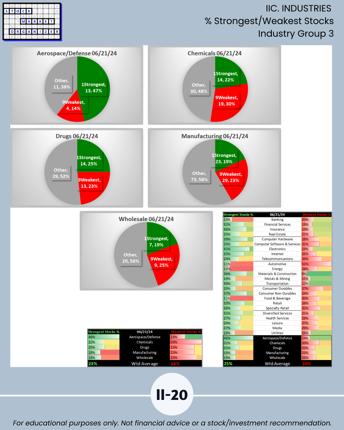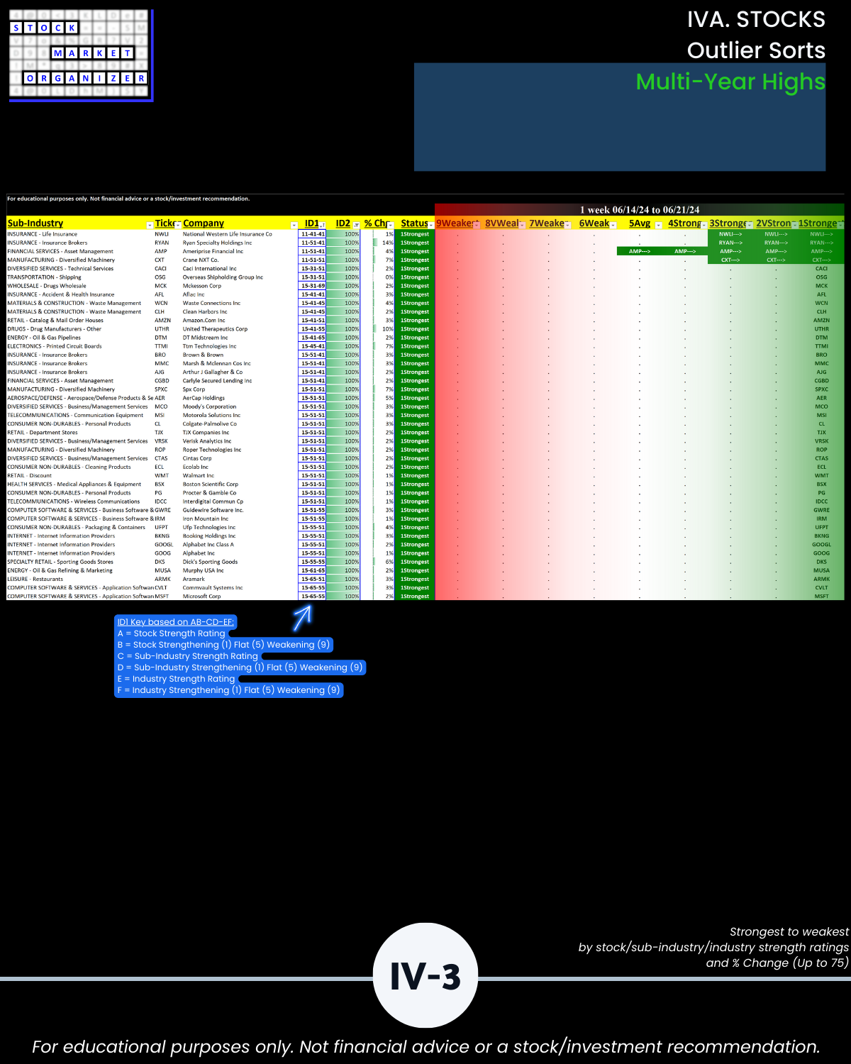 - 61% of 2,654 stocks positive, 38% negative, 25% stocks rated Strongest, 24% Weakest/Section IV