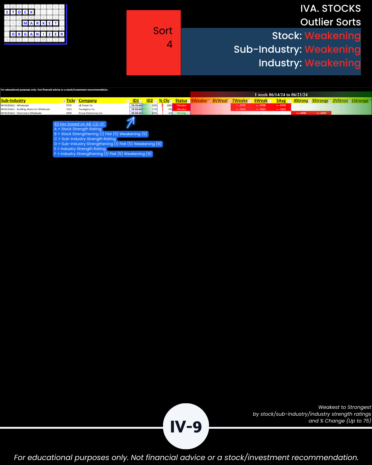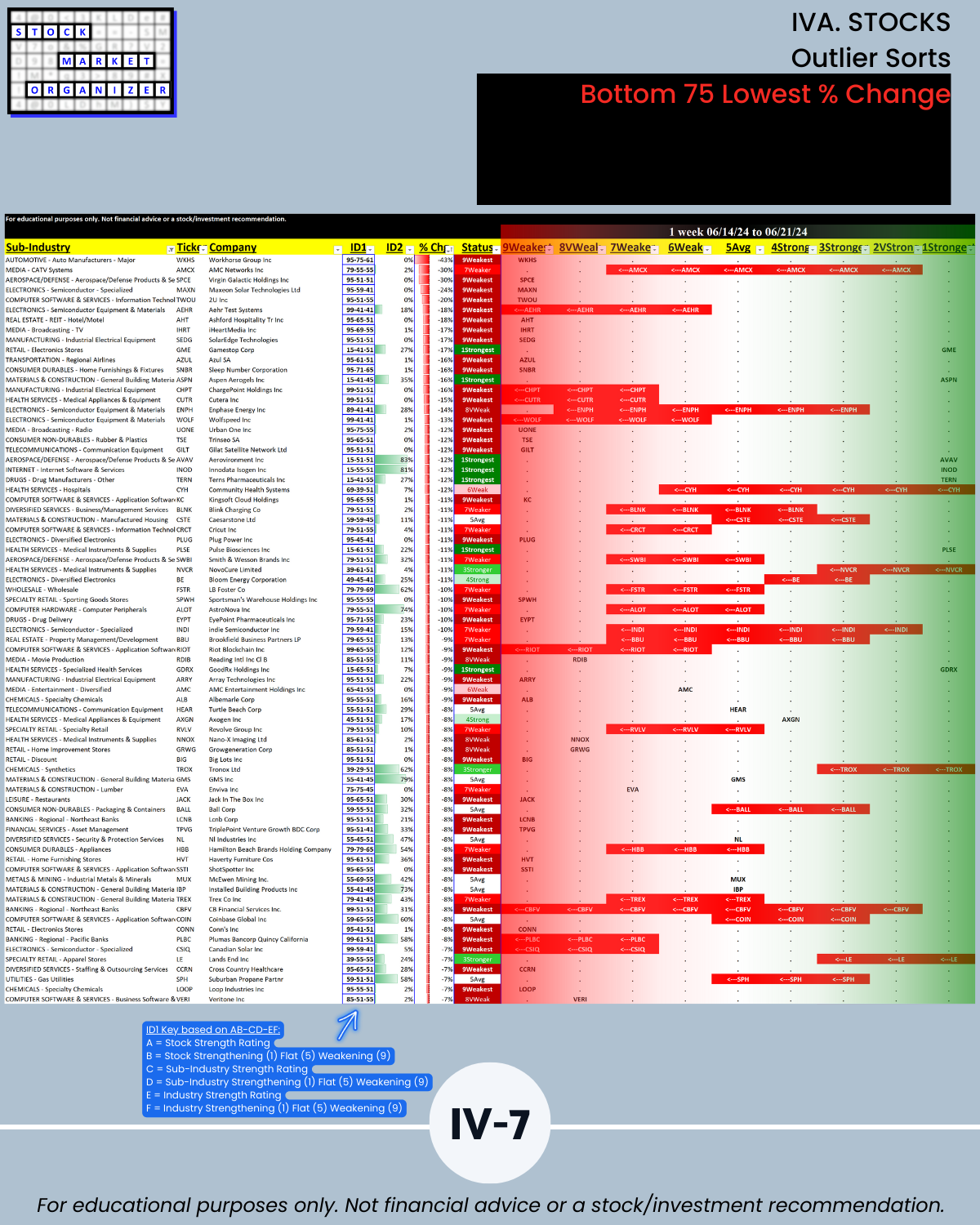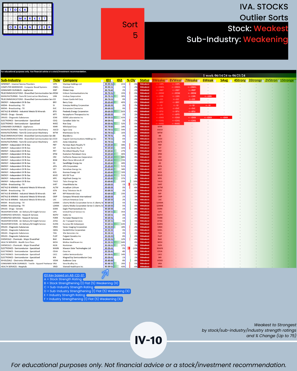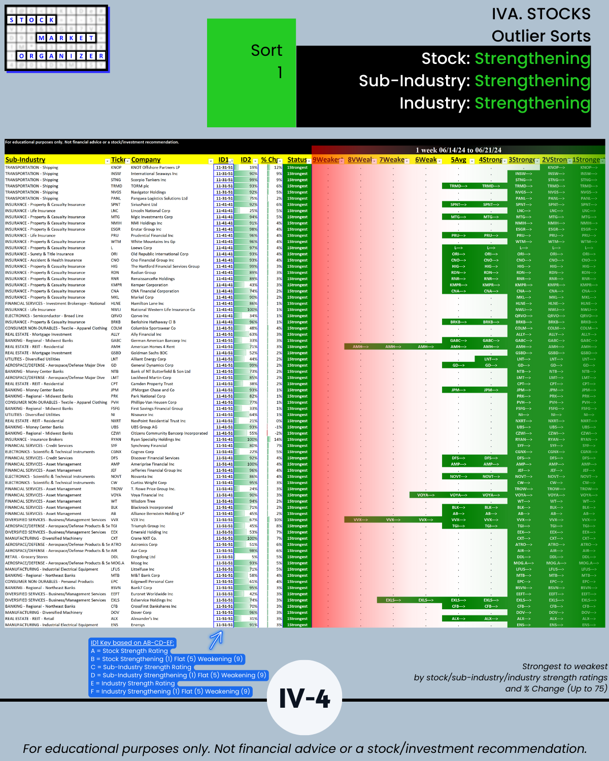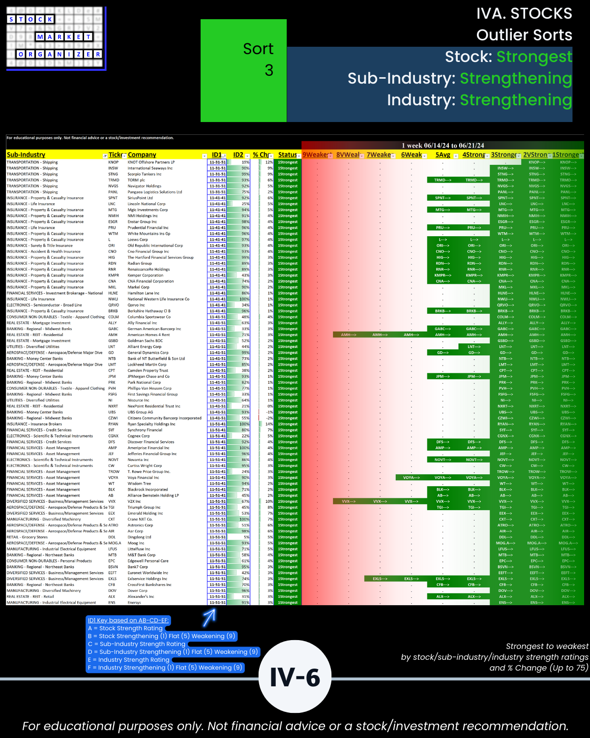 - 61% of 2,654 stocks positive, 38% negative, 25% stocks rated Strongest, 24% Weakest/Section IV