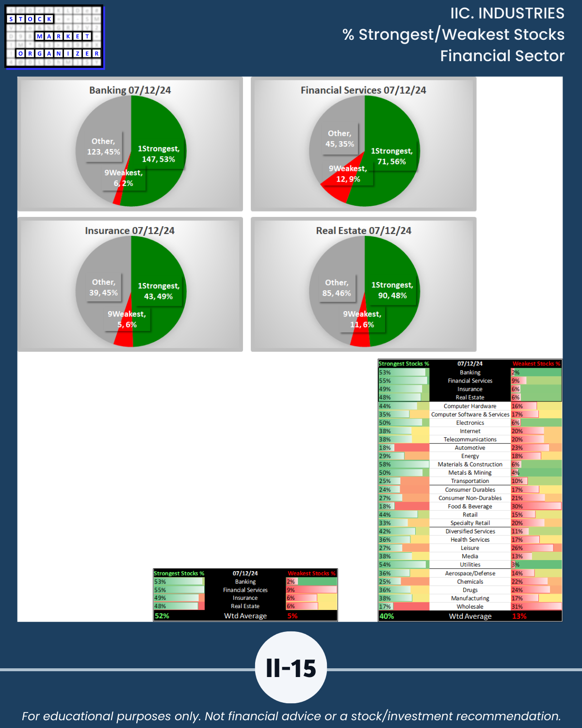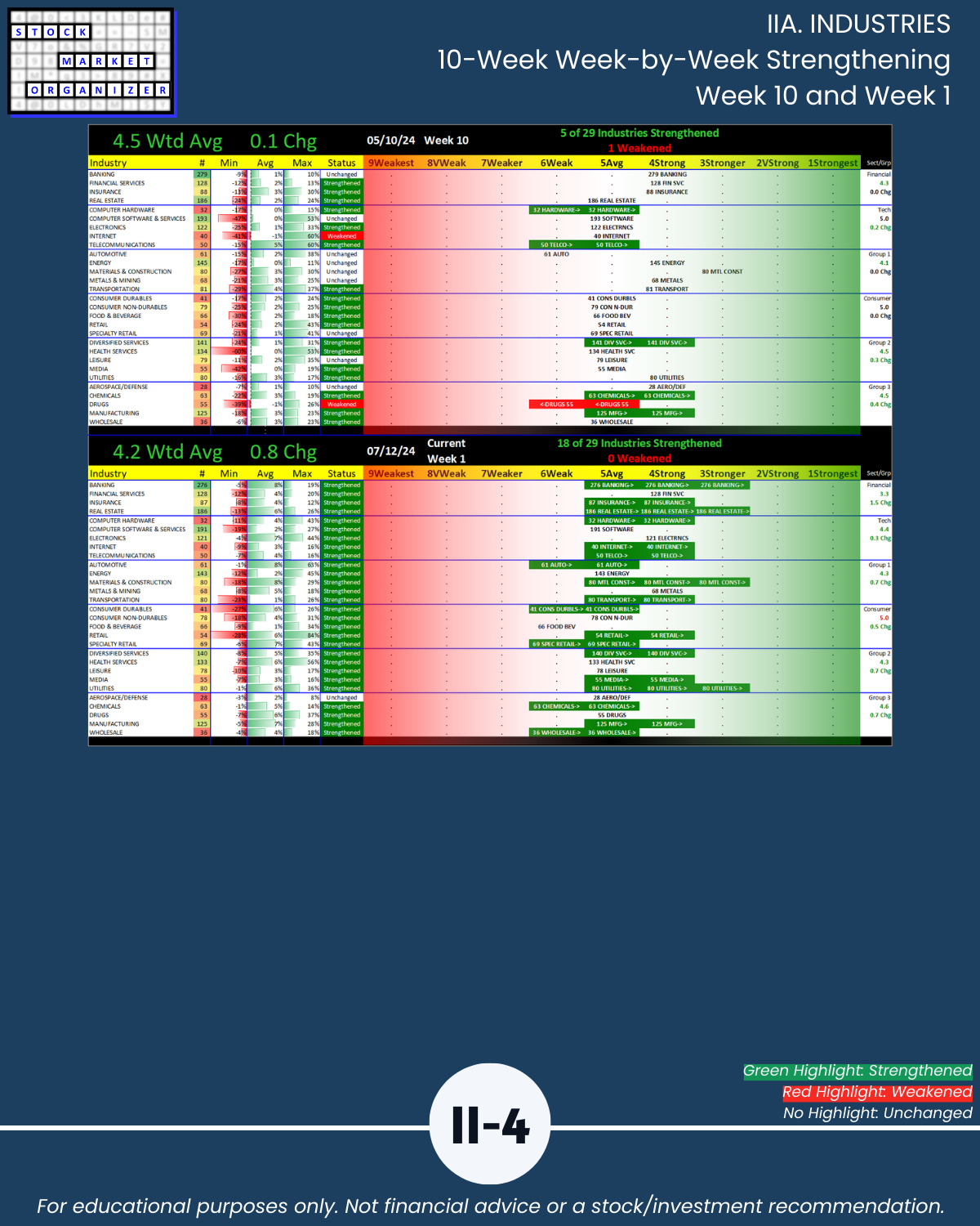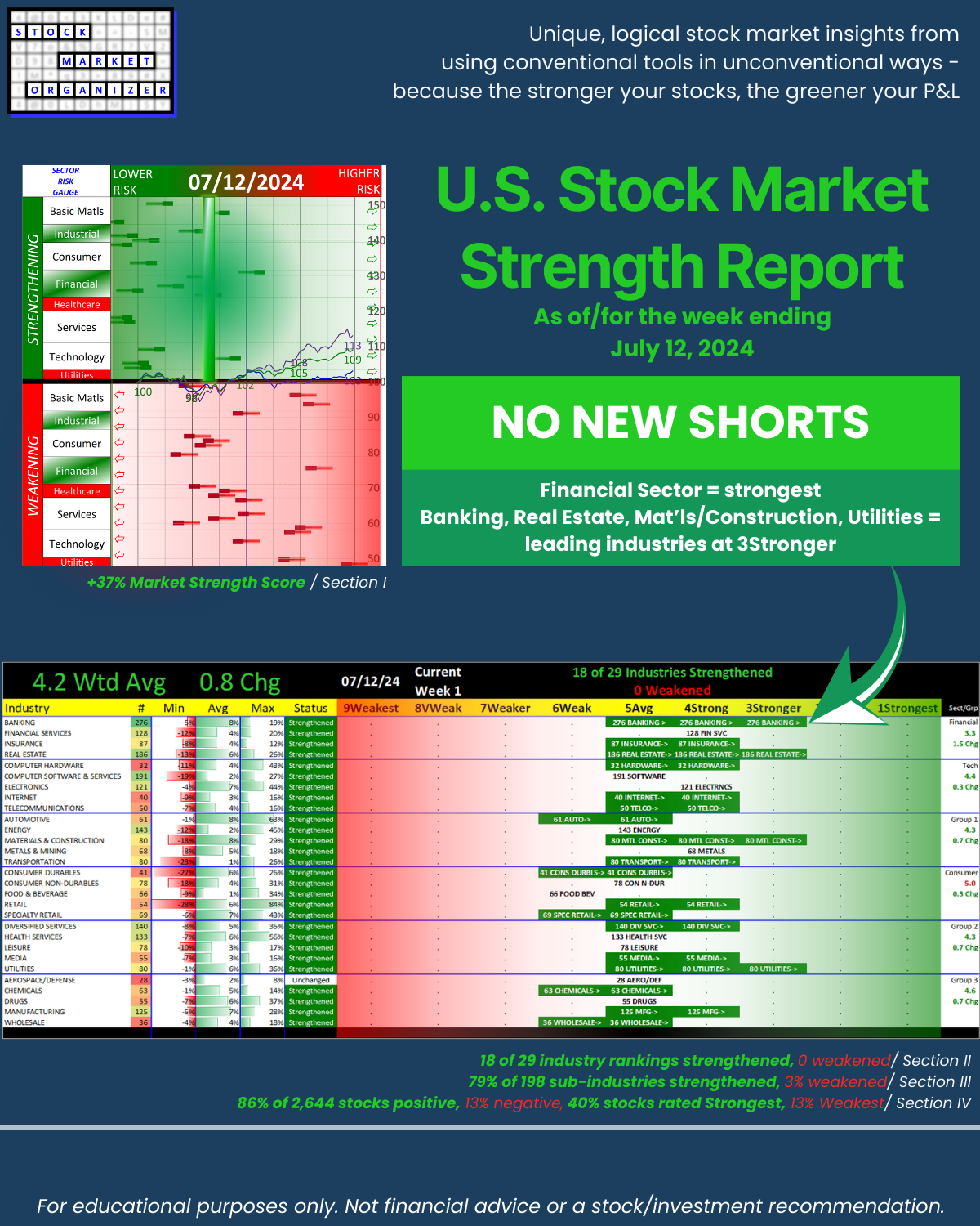 U.S. stock market as of/for the week ending 7/12/24 β missing breadth? Nope. Powerful broad advance. No new shorts, by my count still room to run. Guaranteed? Never. πΉ Financial Sector crushed it, +1.5 to 3.3 rating (scale 9 worst to 1 best), πΉ strongest industries at 3Stronger = Banking, Real Estate, Materials & Construction (Homebuilders), and Utilities, πΉ weakest industry at 6Weak is Food/Beverage. More:
