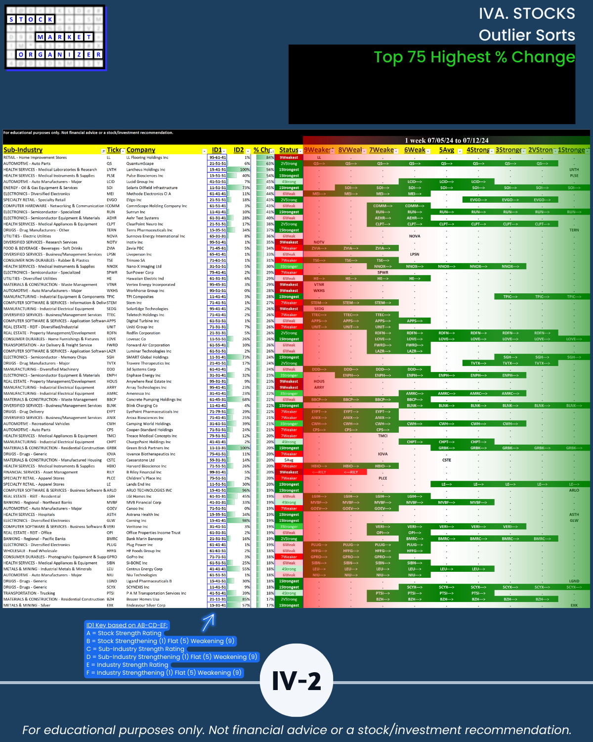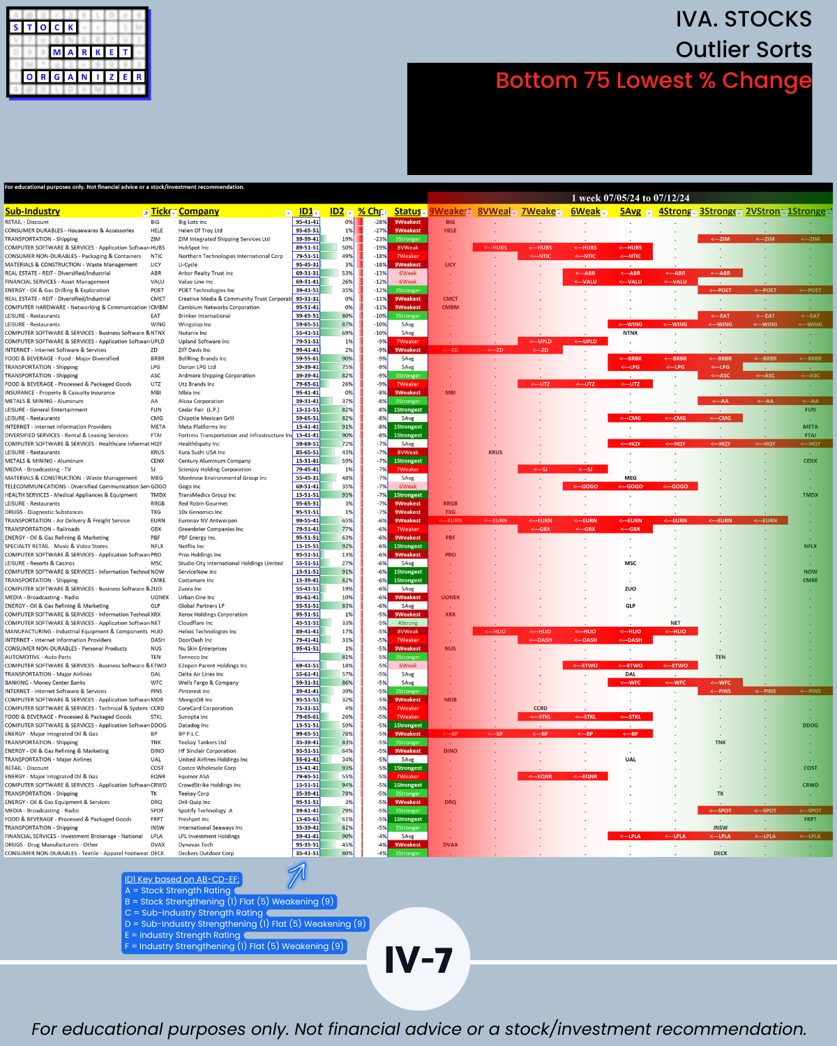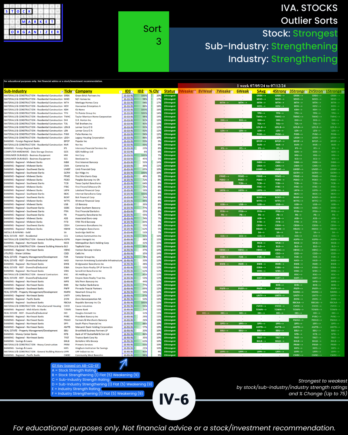 U.S. stock market as of/for the week ending 7/12/24 β missing breadth? Nope. Powerful broad advance. No new shorts, by my count still room to run. Guaranteed? Never. πΉ Financial Sector crushed it, +1.5 to 3.3 rating (scale 9 worst to 1 best), πΉ strongest industries at 3Stronger = Banking, Real Estate, Materials & Construction (Homebuilders), and Utilities, πΉ weakest industry at 6Weak is Food/Beverage. More:
