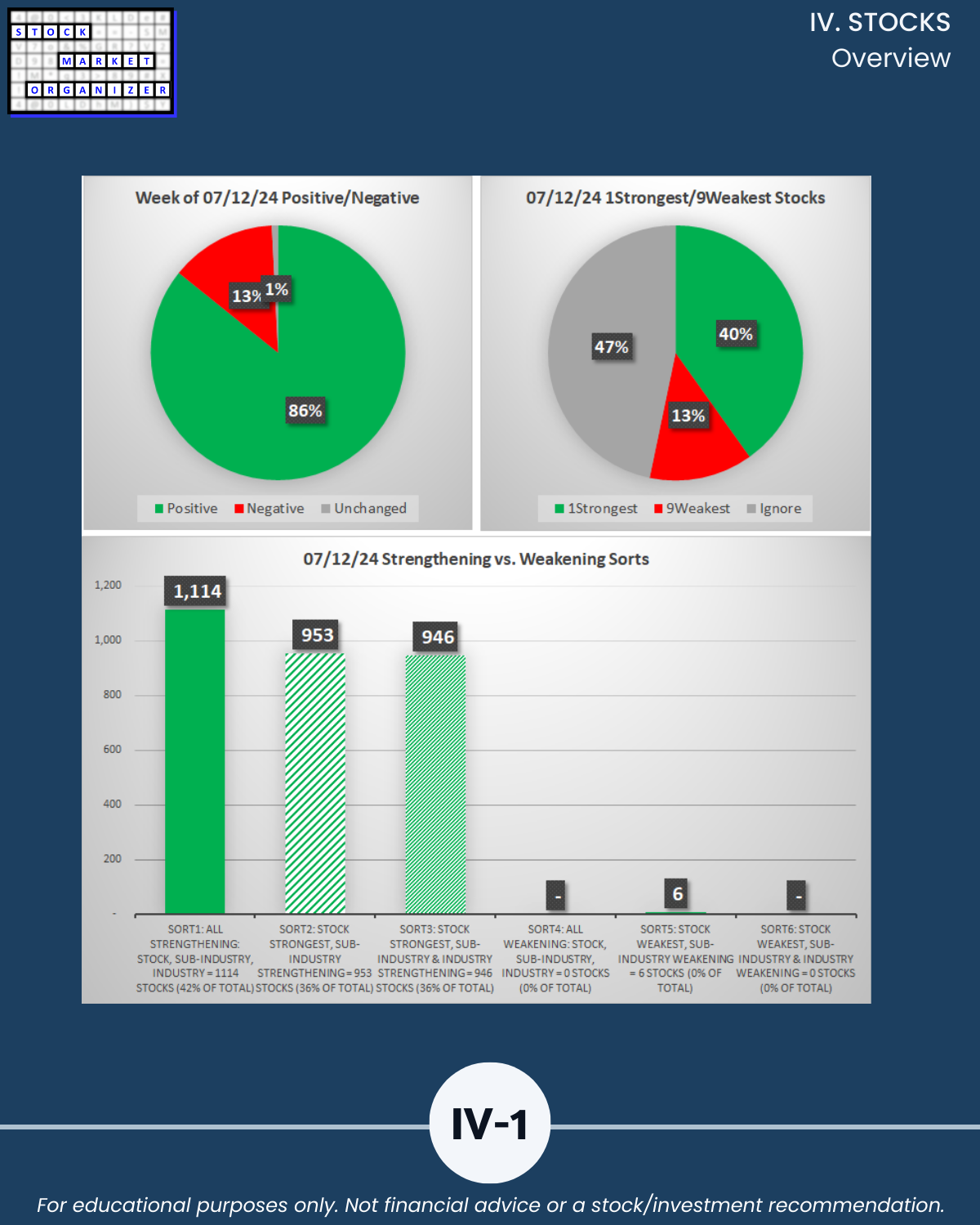 - 86% of 2,644 stocks positive, 13% negative, 40% stocks rated Strongest, 13% Weakest/Section IV