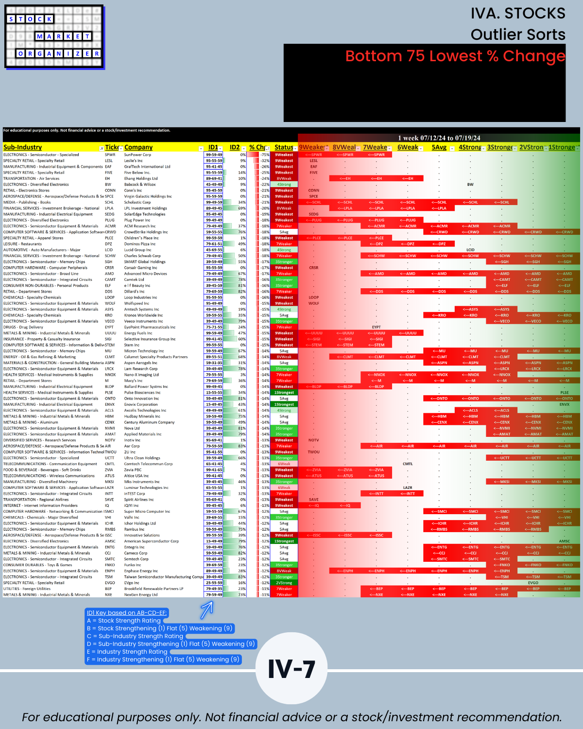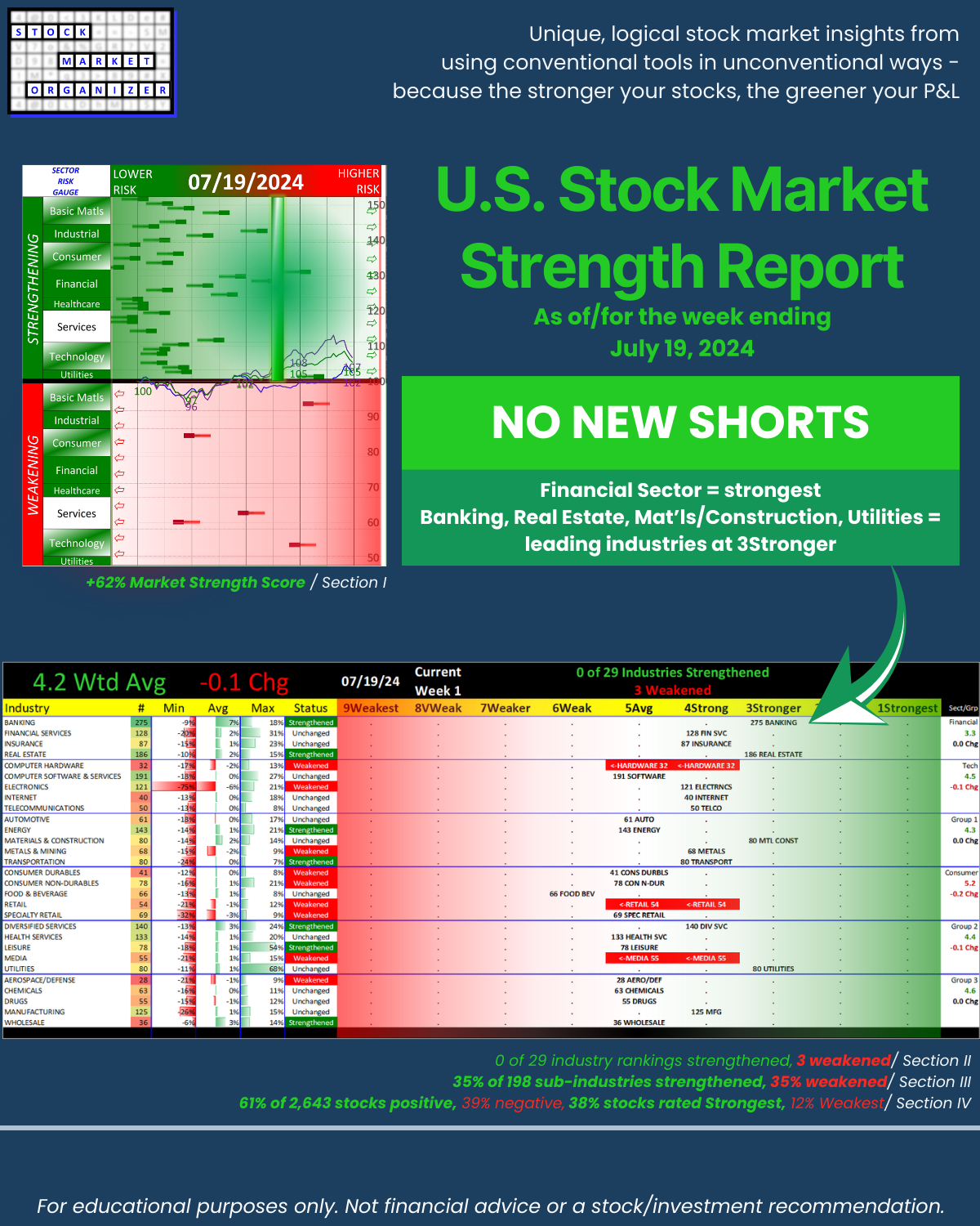 Here’s your unique, strength-focused U.S. stock market overview as of/for the week ending 7/19/24. Do you want to know if current sub-industry, industry, sector, and market tides are currently helping or hindering your stocks of interest? Answers attached.