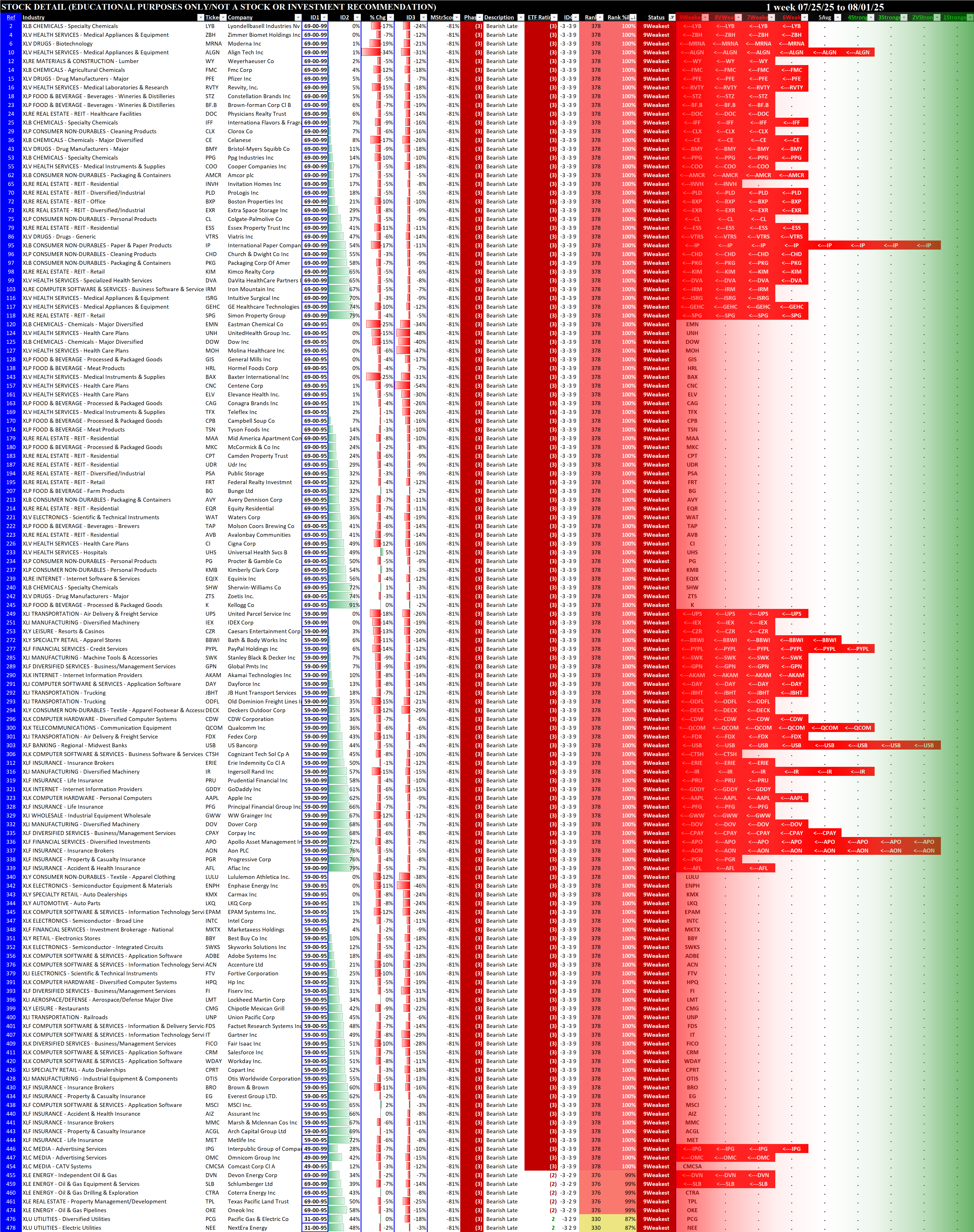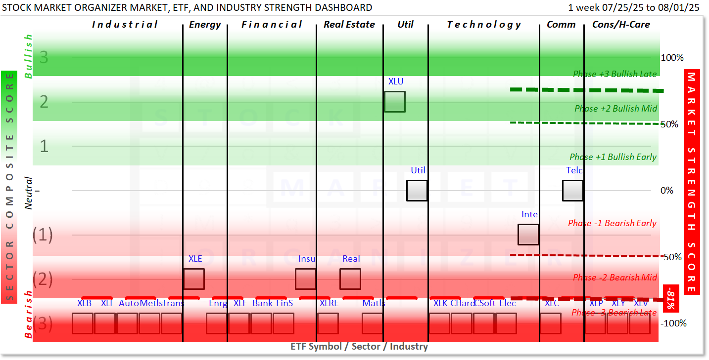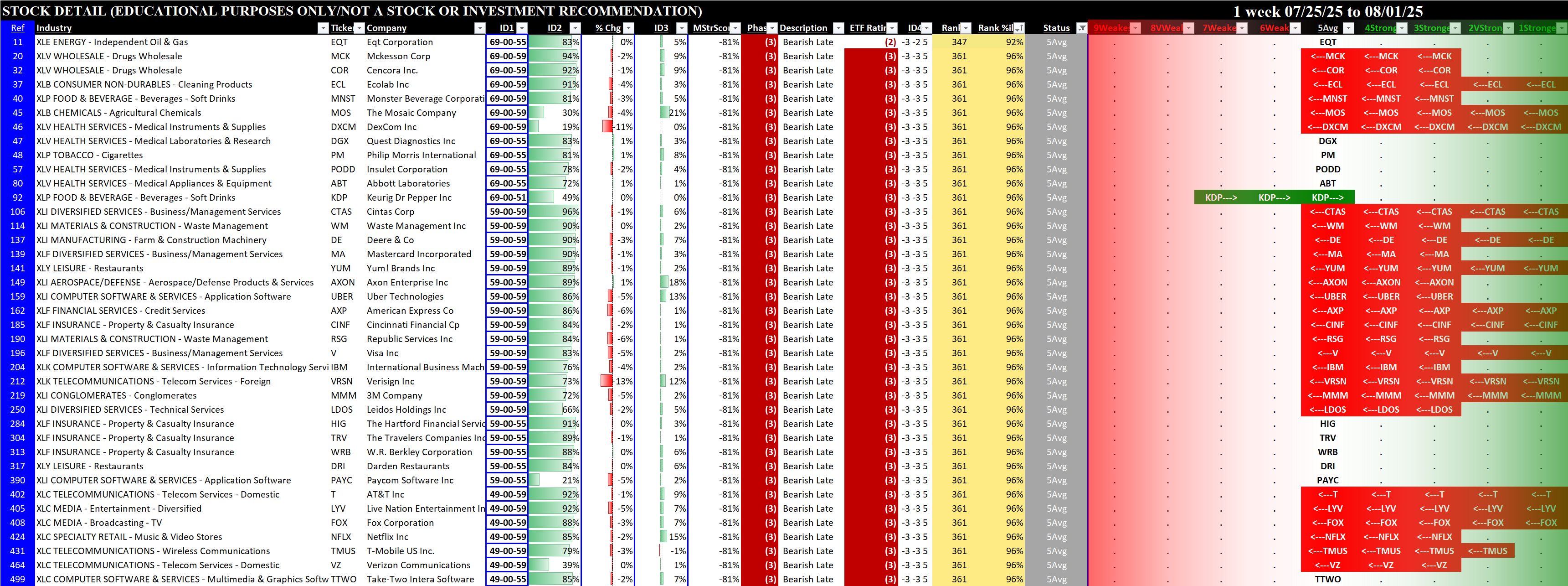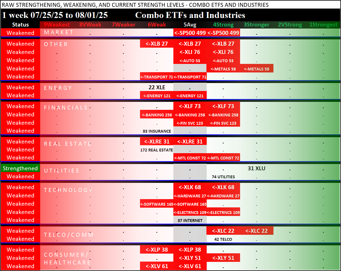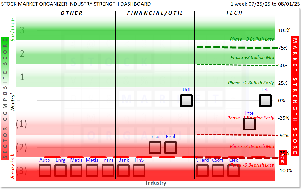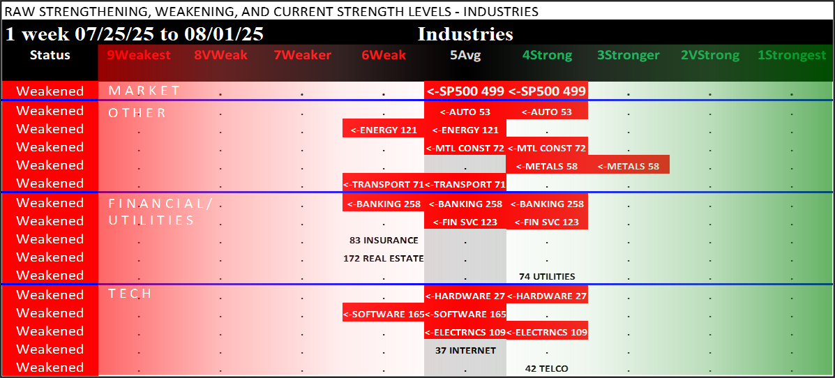 Selected key industries are presented below in Dashboard and Spectrum format similar to the ETFs/Sectors summary above. The underlying information here is the full component stock populations, not just the 500 ETF stocks. Thus, it provides a broader view of underlying strength and weakness and should be used to enhance the ETF Sector insights.