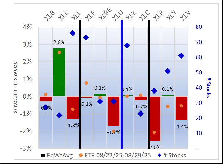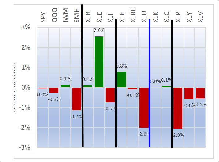 Weekly returns re-cap - the first chart below shows the equal weight returns for the 11 ETFs and the second shows the returns for four indexes and the 11 ETFs.