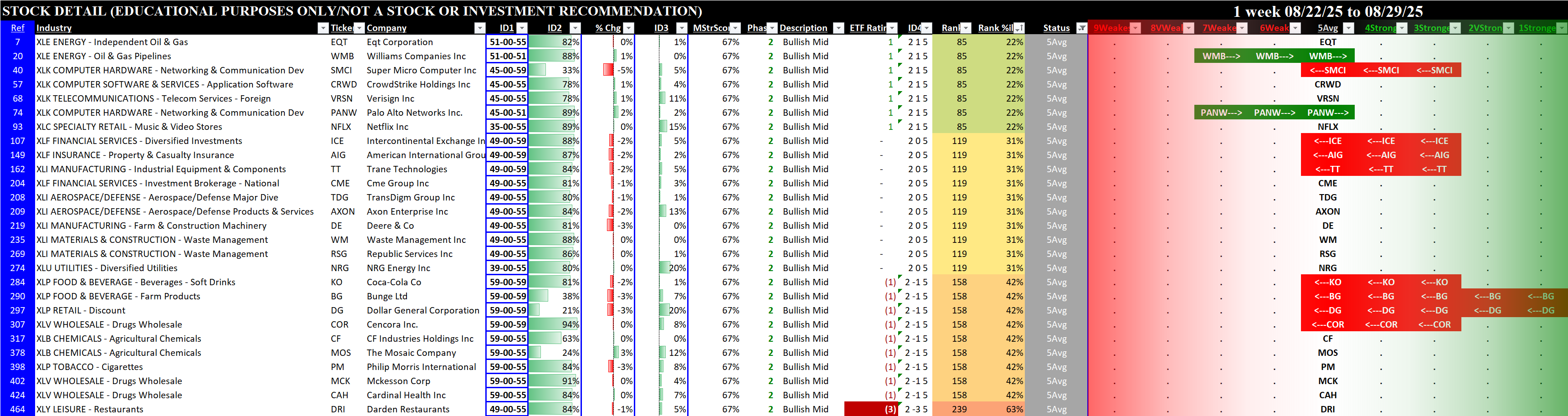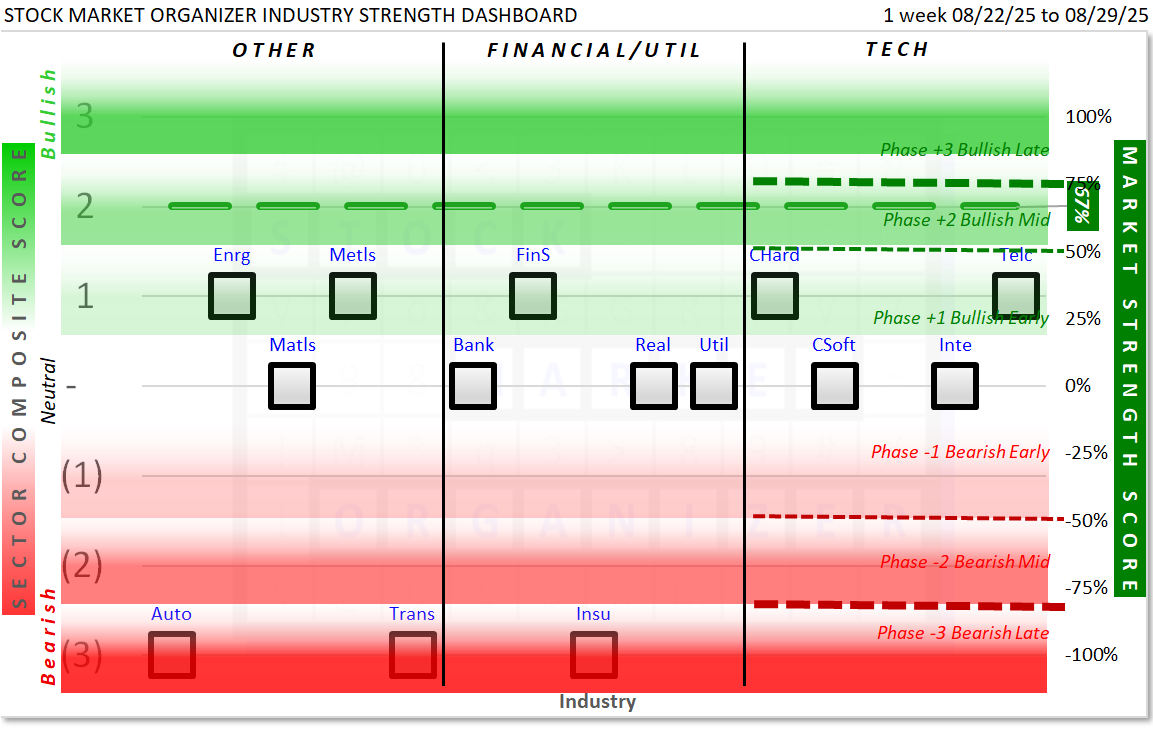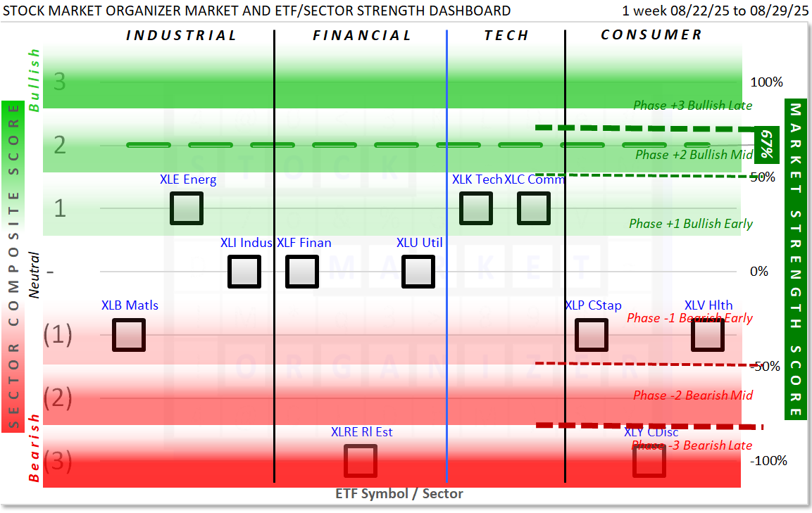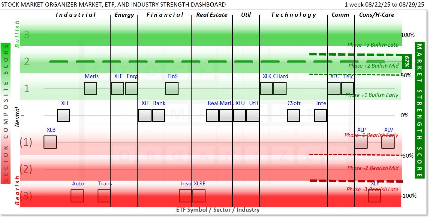 This Market and Sector Strength Dashboard converts to actionable information the raw strengthening, weakening, and current strength levels shown in the spectrum graph below. Note the +67% Market Strength Score translates into a Phase +2 Bullish Mid environment: