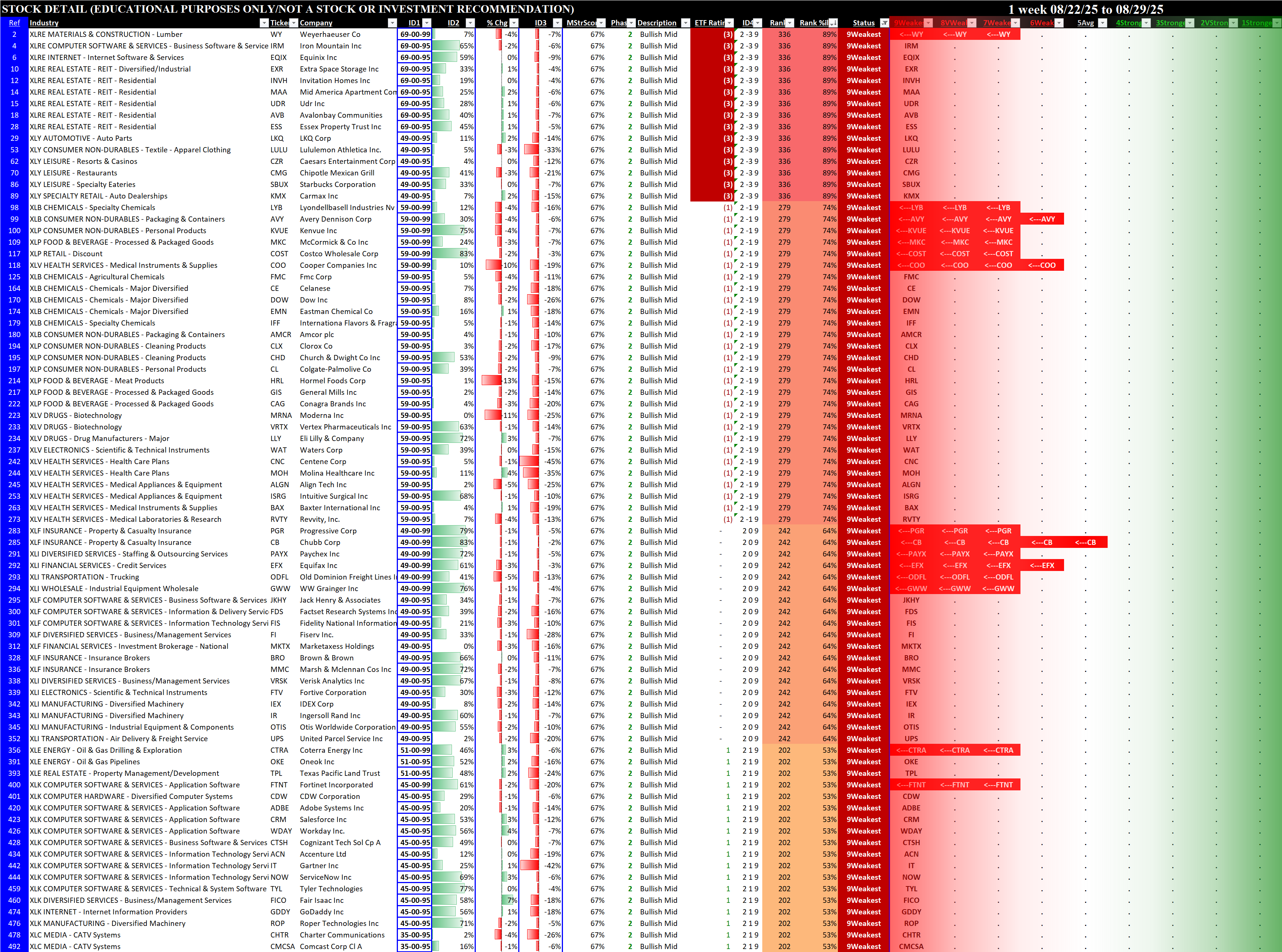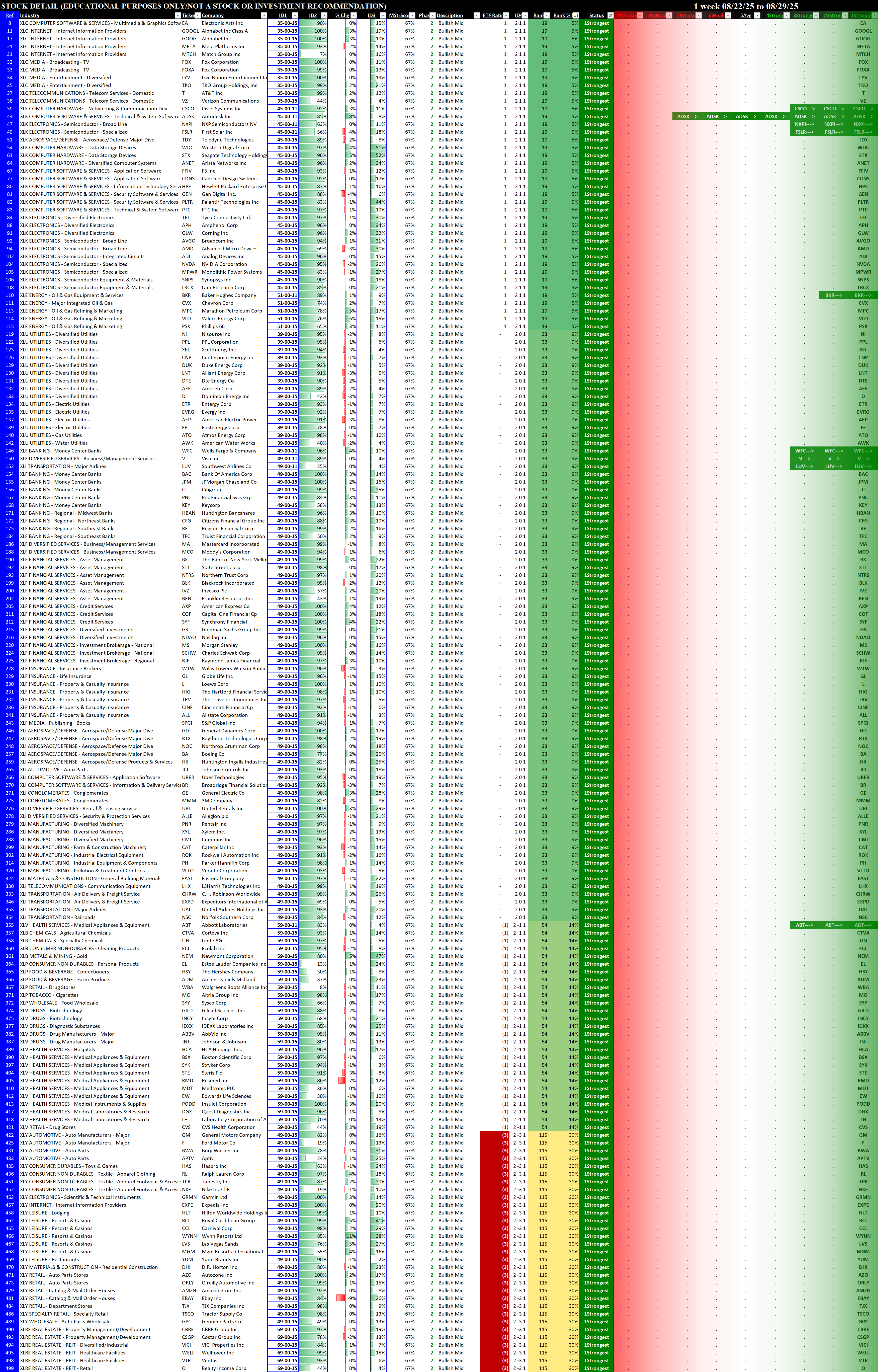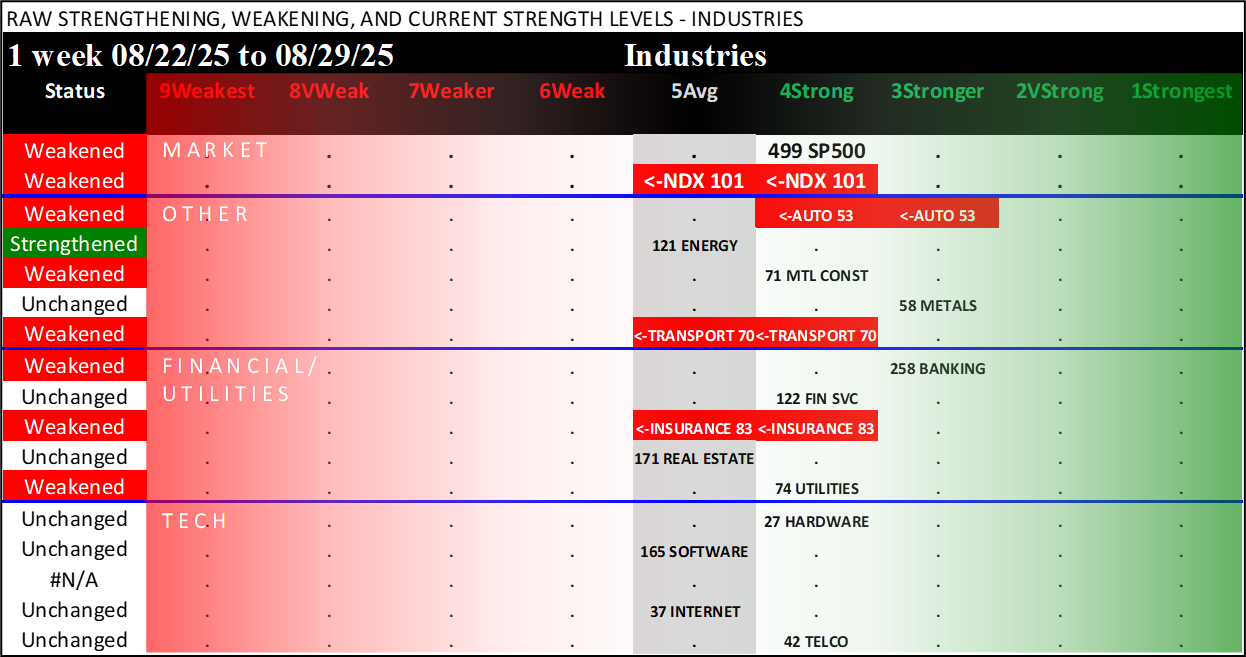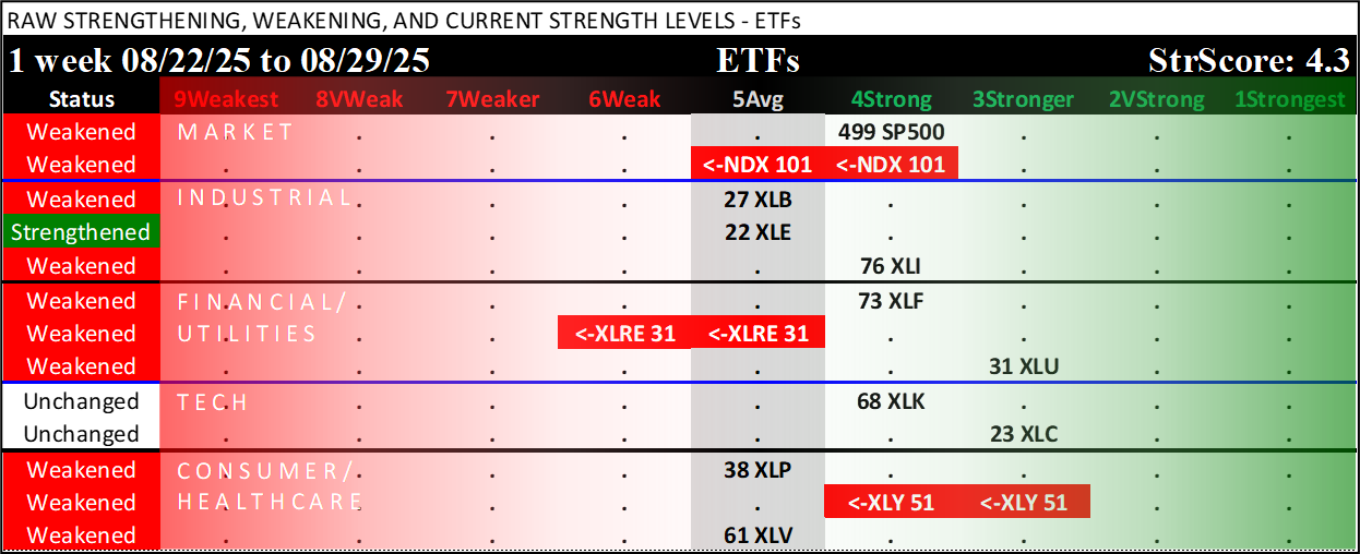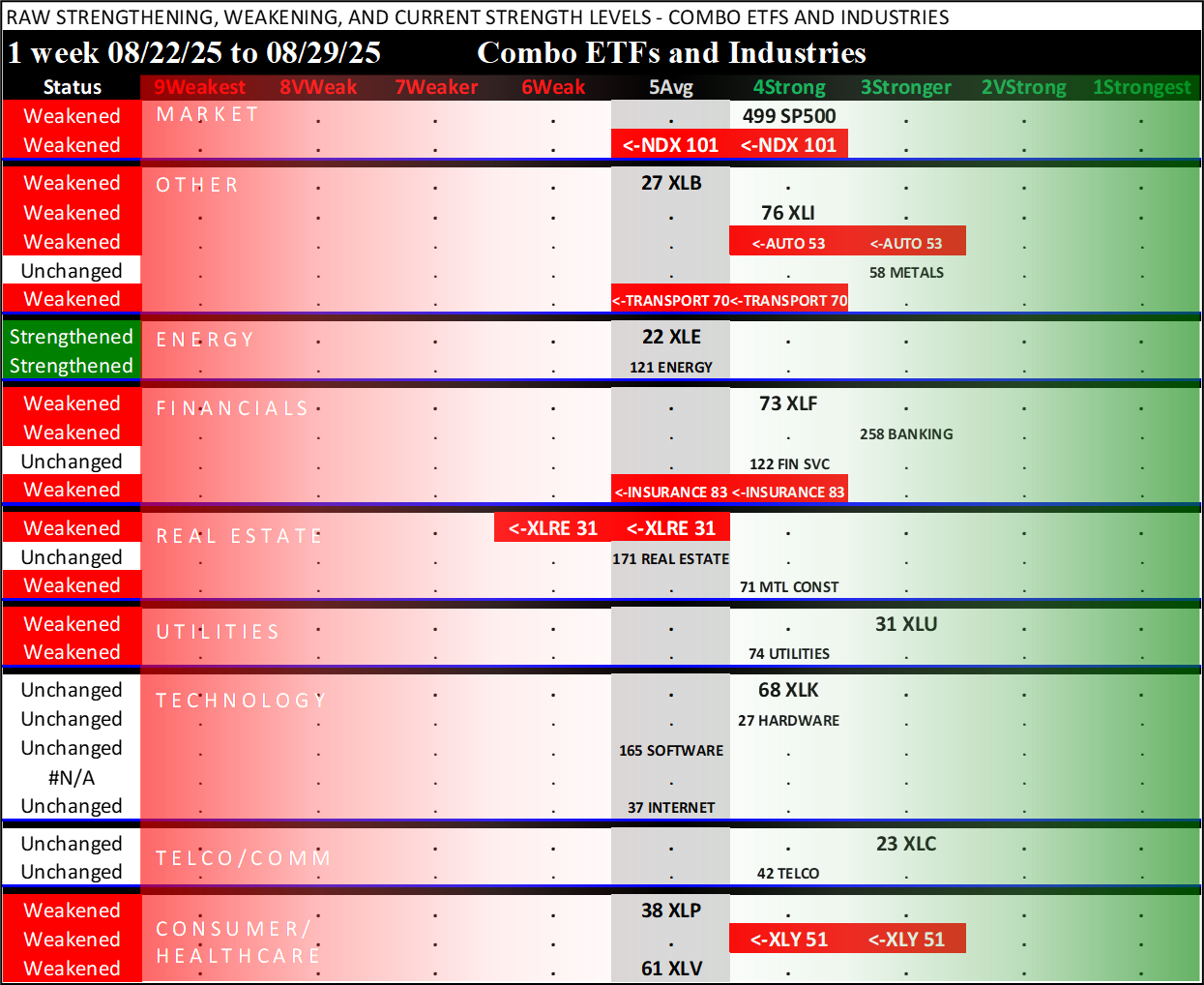 Referred to as Spectrum format (these are presented as the spectrum of possibilities from 9Weakest to 1Strongest), here are the raw strength readings for each sector with their change for the just-completed week: