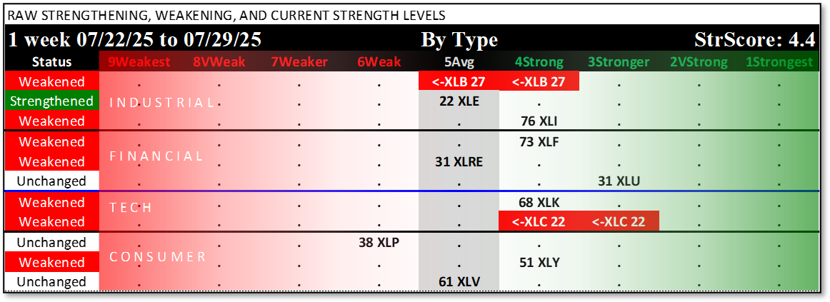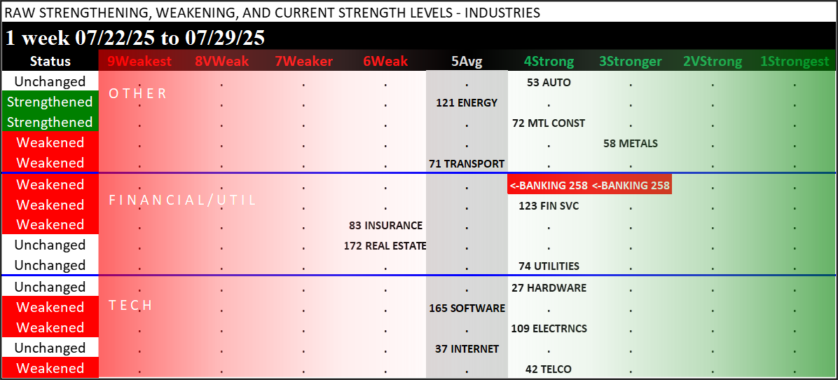 Selected key industries are presented below in Dashboard and Spectrum format similar to the ETFs/Sectors summary above. The underlying information here is the full component stock populations, not just the 500 ETF stocks. Thus, it provides a broader view of underlying strength and weakness and should be used to enhance the ETF Sector insights.