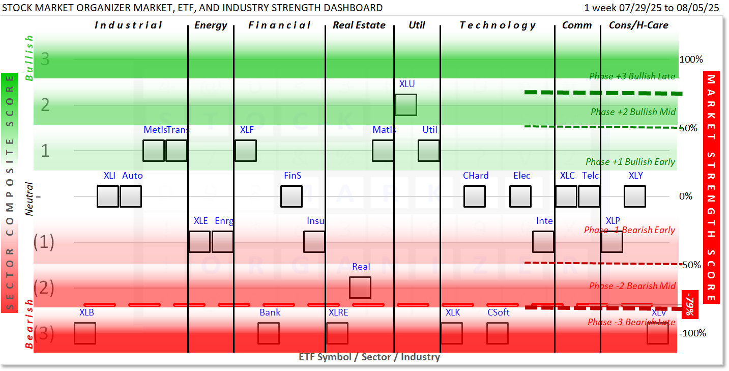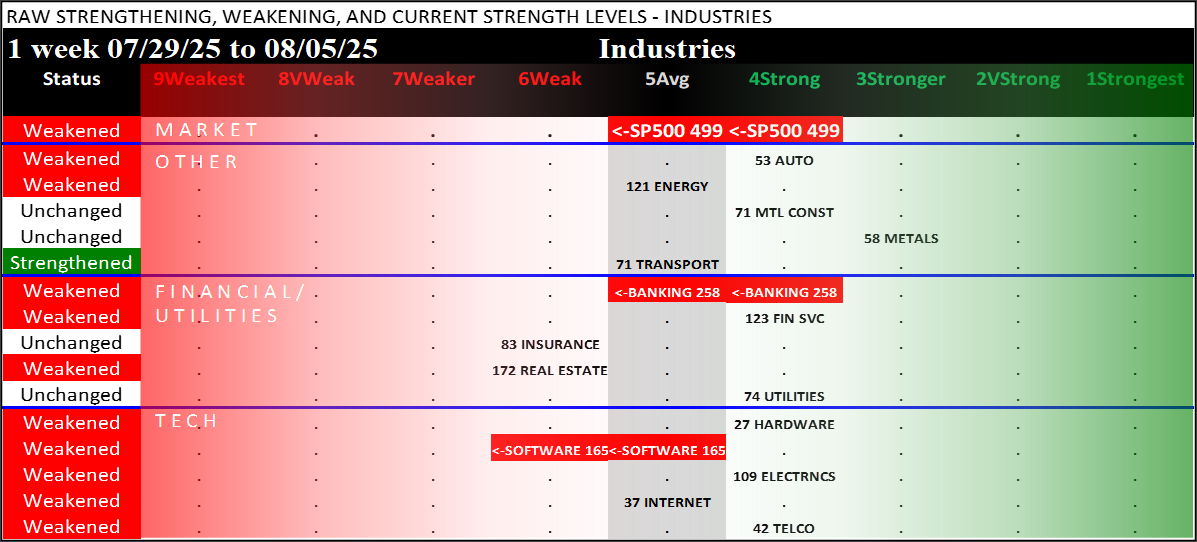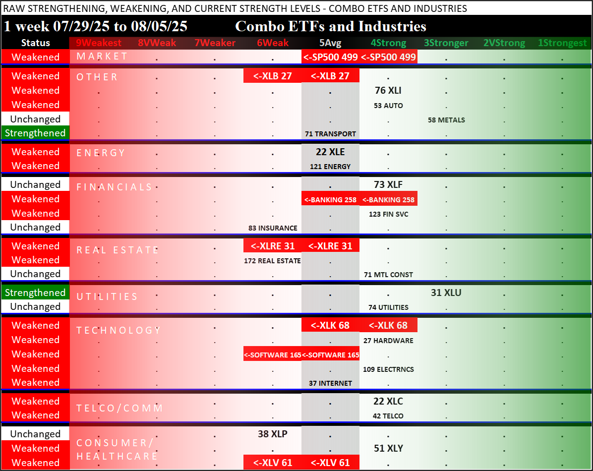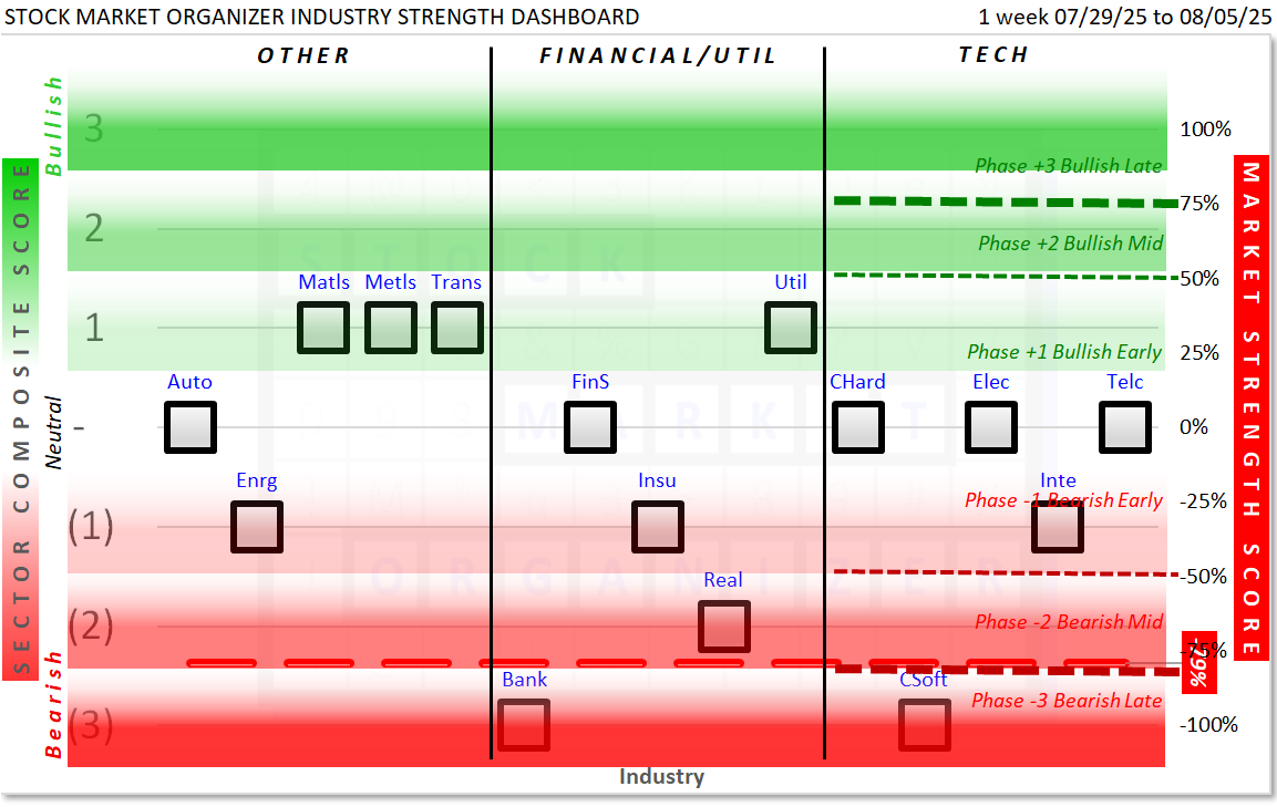 Selected key industries are presented below in Dashboard and Spectrum format similar to the ETFs/Sectors summary above. The underlying information here is the full component stock populations, not just the 500 ETF stocks. Thus, it provides a broader view of underlying strength and weakness and should be used to enhance the ETF Sector insights.