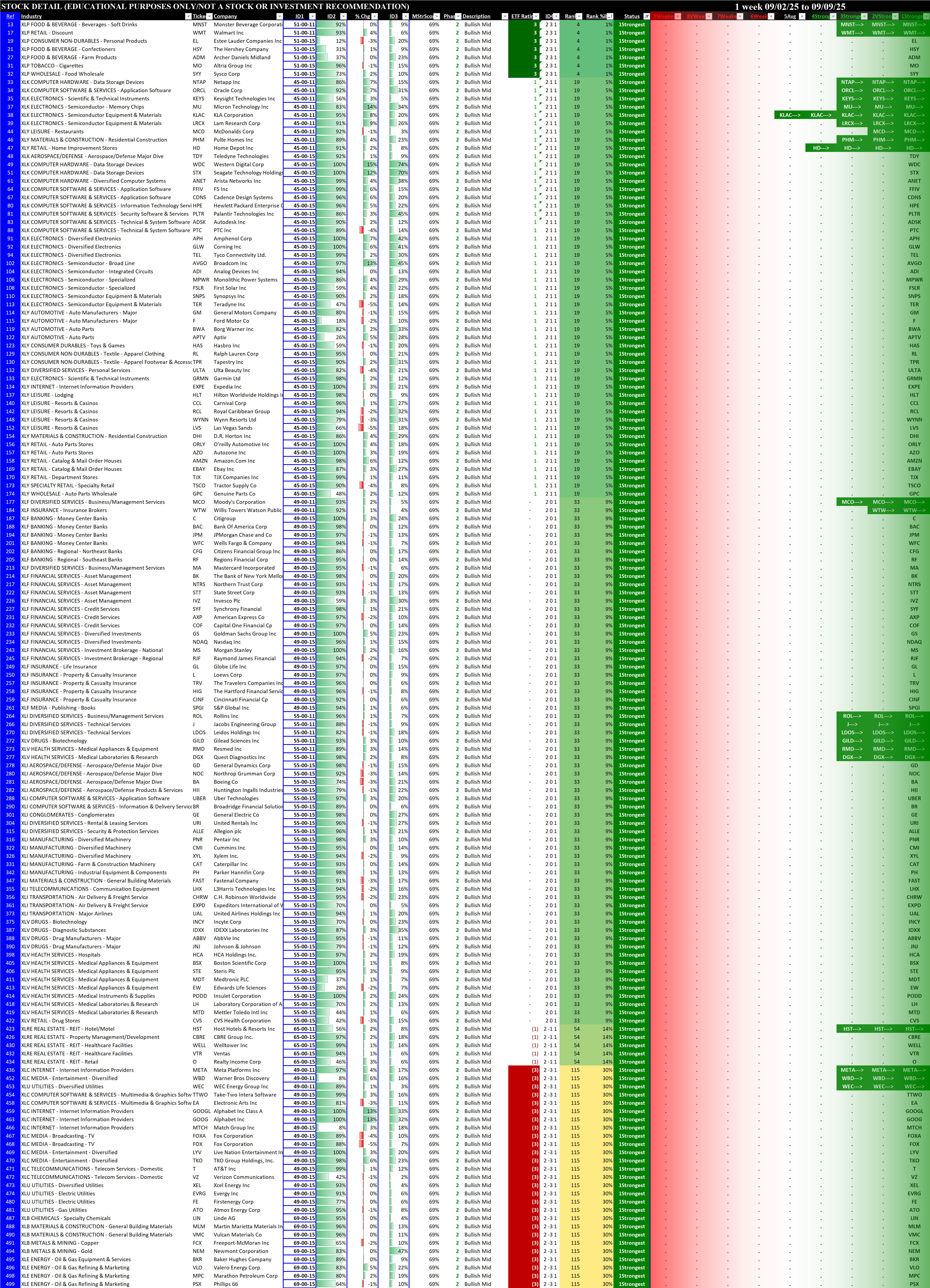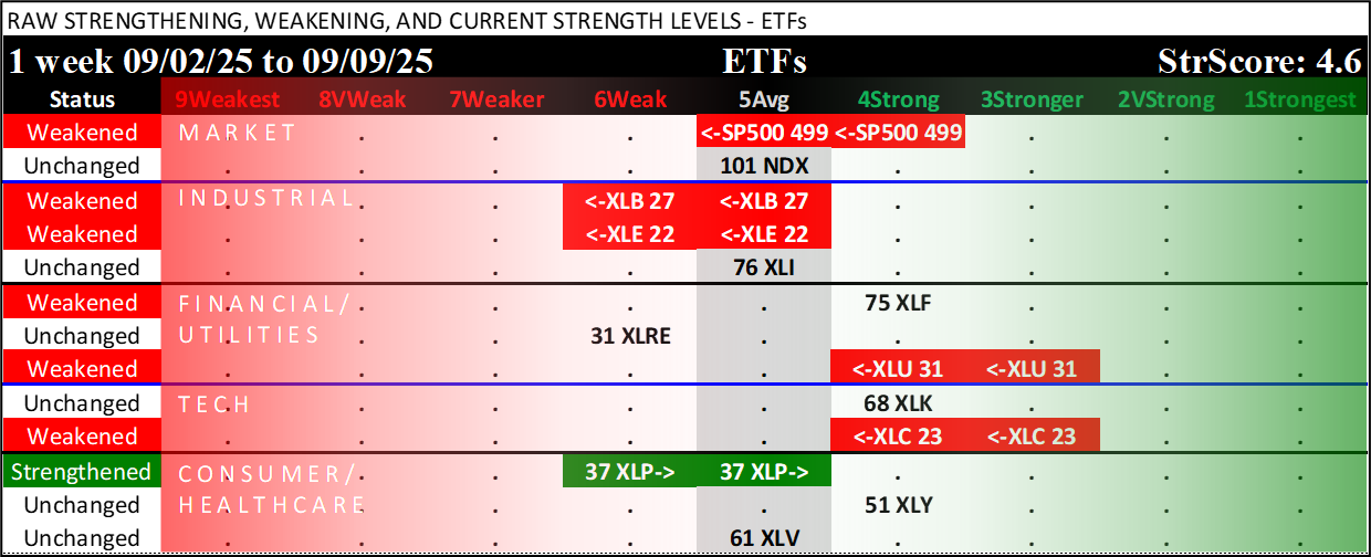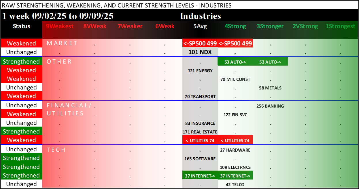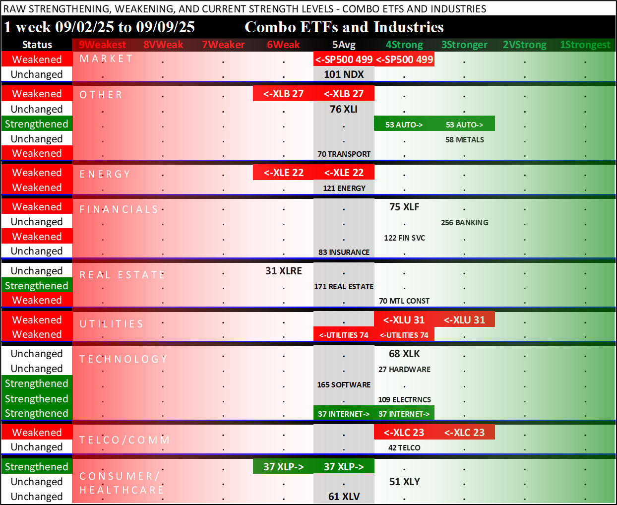 Referred to as Spectrum format (these are presented as the spectrum of possibilities from 9Weakest to 1Strongest), here are the raw strength readings for each sector with their change for the just-completed week: