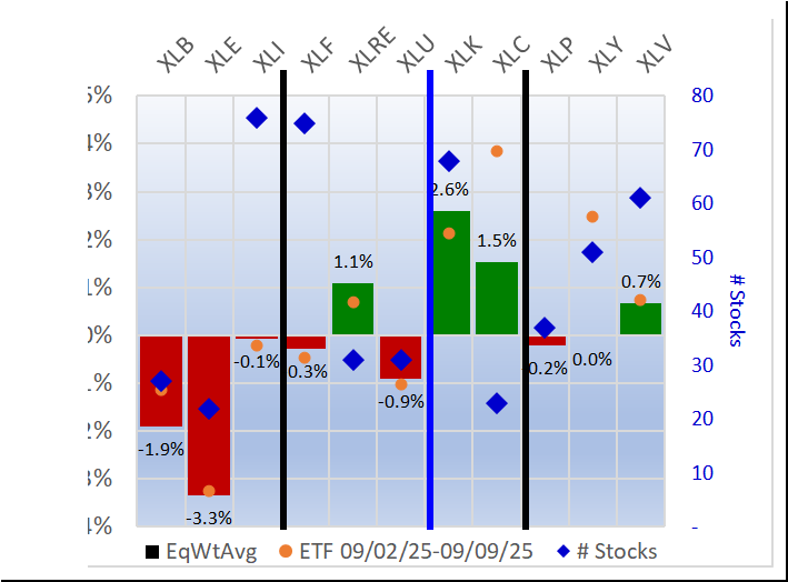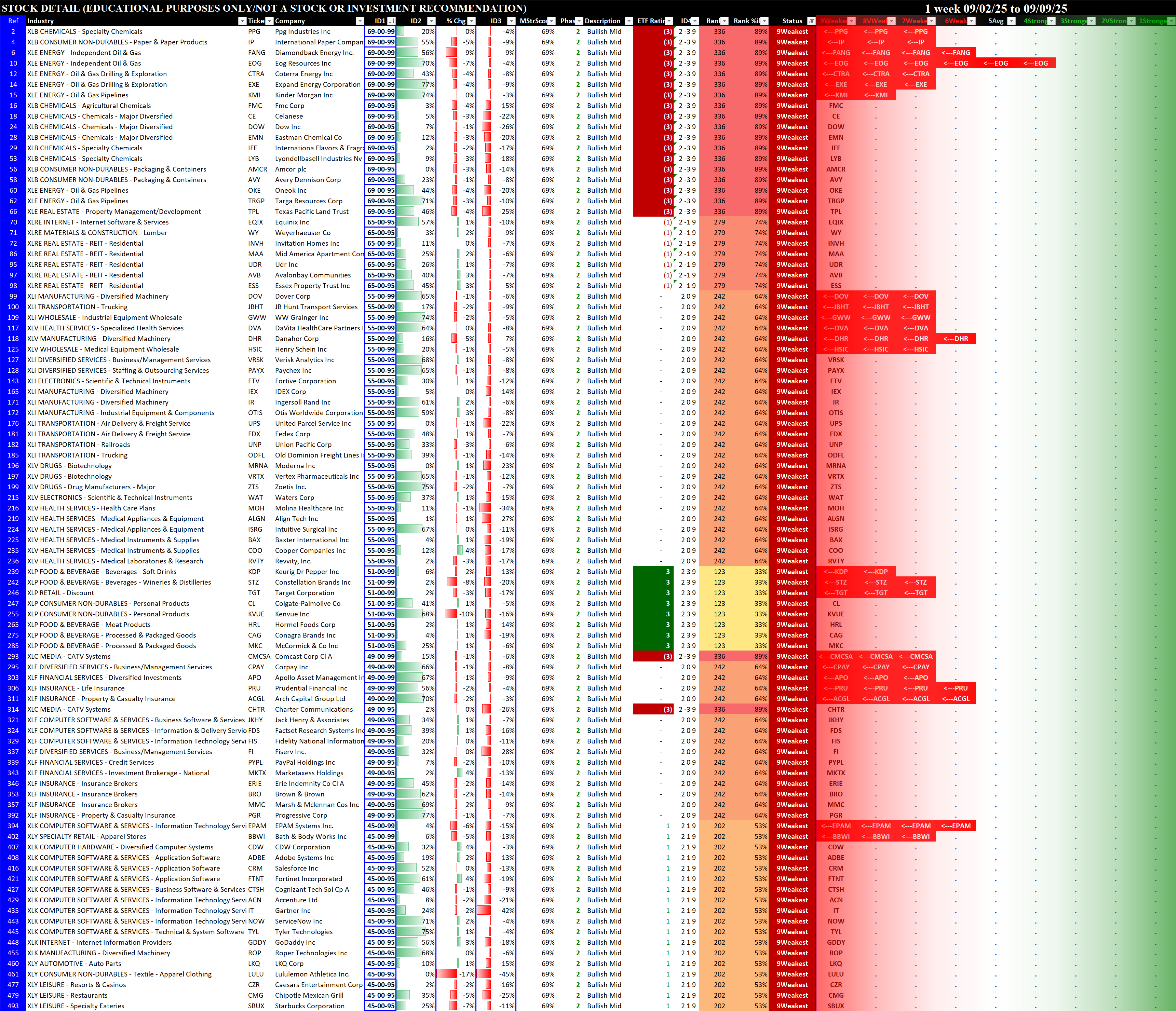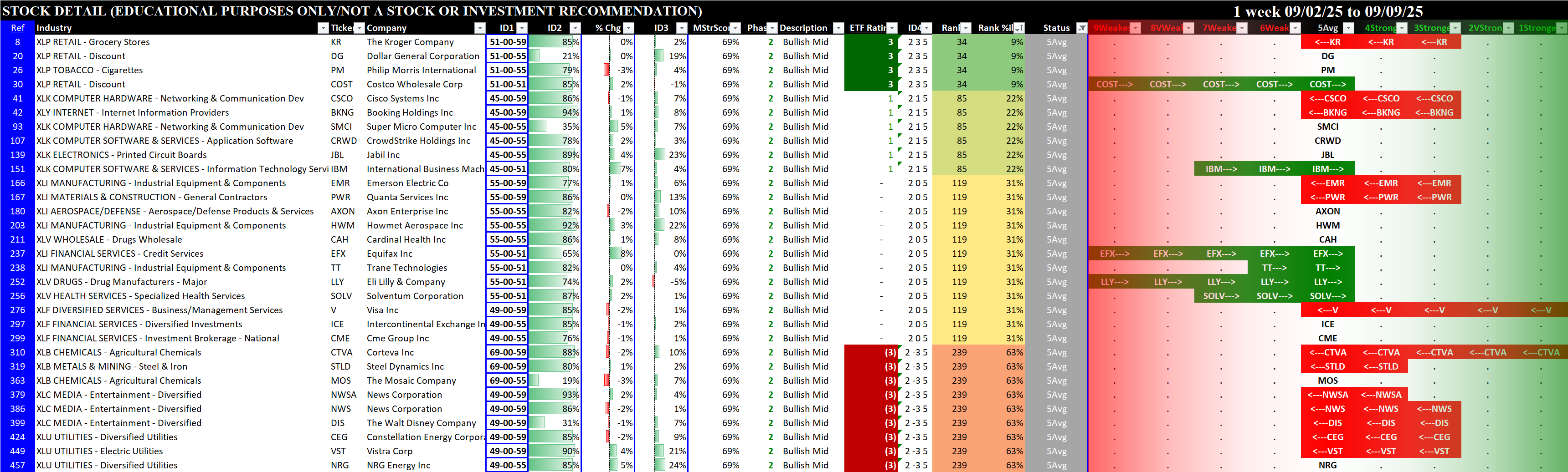 Referred to as Spectrum format (these are presented as the spectrum of possibilities from 9Weakest to 1Strongest), here are the raw strength readings for each sector with their change for the just-completed week:
