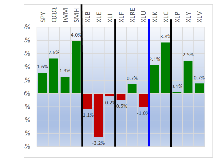 Weekly returns re-cap - the first chart below shows the equal weight returns for the 11 ETFs and the second shows the returns for four indexes and the 11 ETFs.