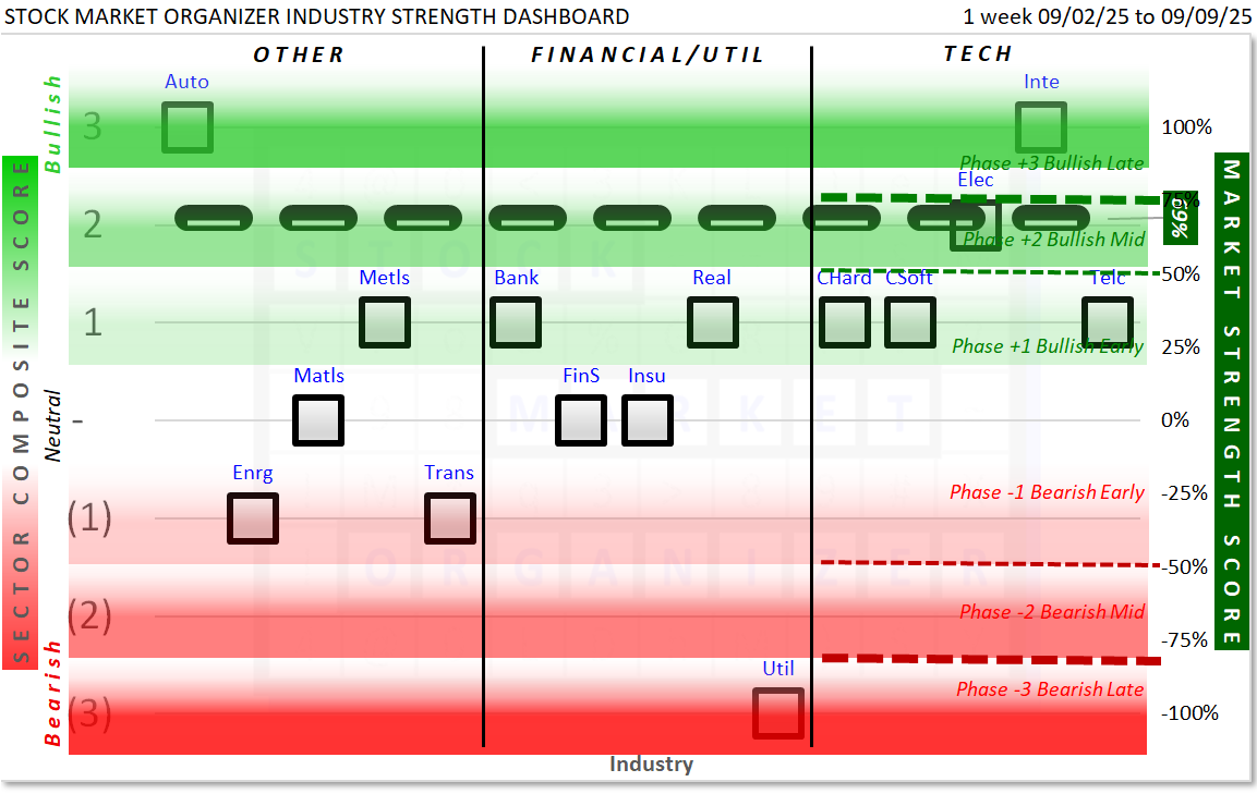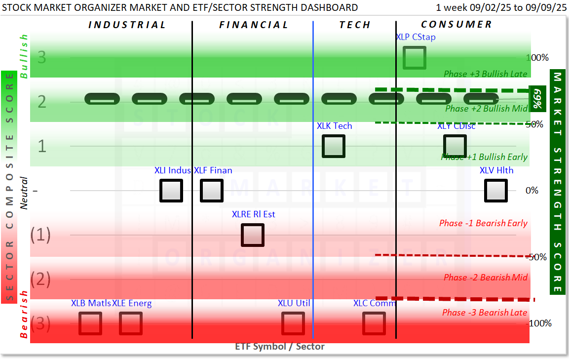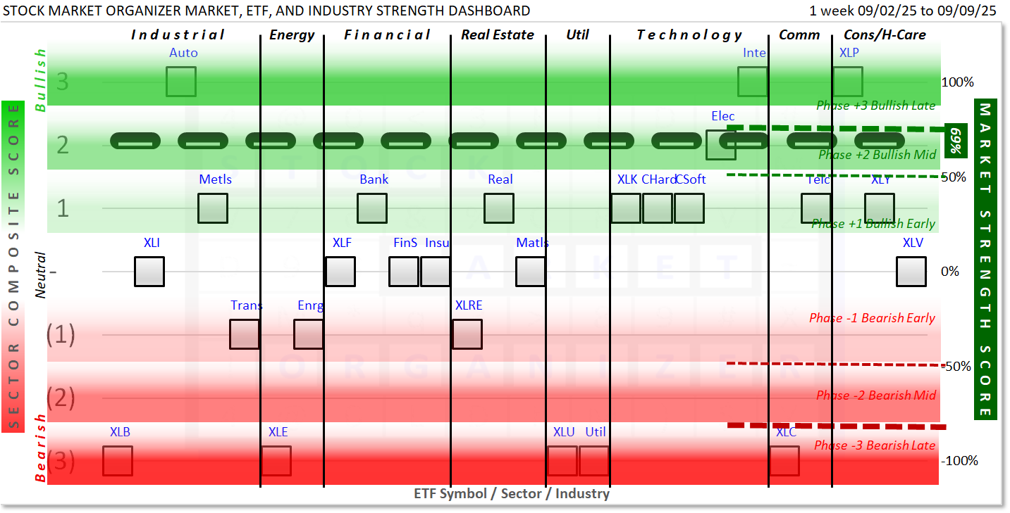 This Market and Sector Strength Dashboard converts to actionable information the raw strengthening, weakening, and current strength levels shown in the spectrum graph below. Note the +69% Market Strength Score translates into a Phase +2 Bullish Mid environment: