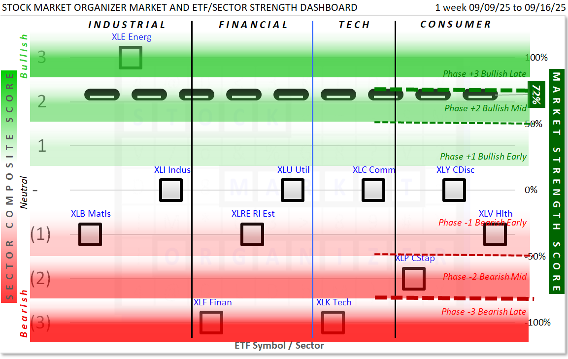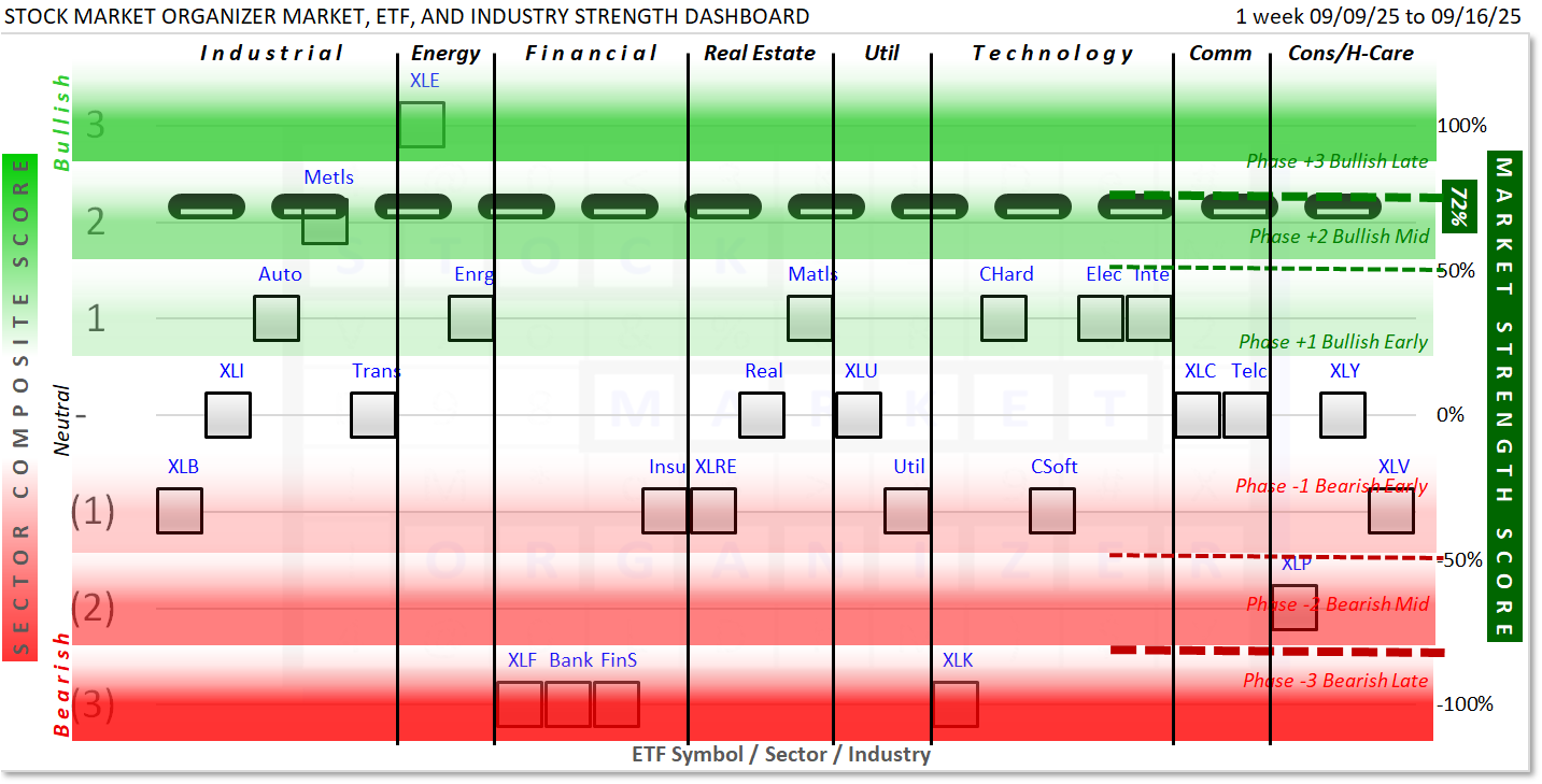 This Market and Sector Strength Dashboard converts to actionable information the raw strengthening, weakening, and current strength levels shown in the spectrum graph below.