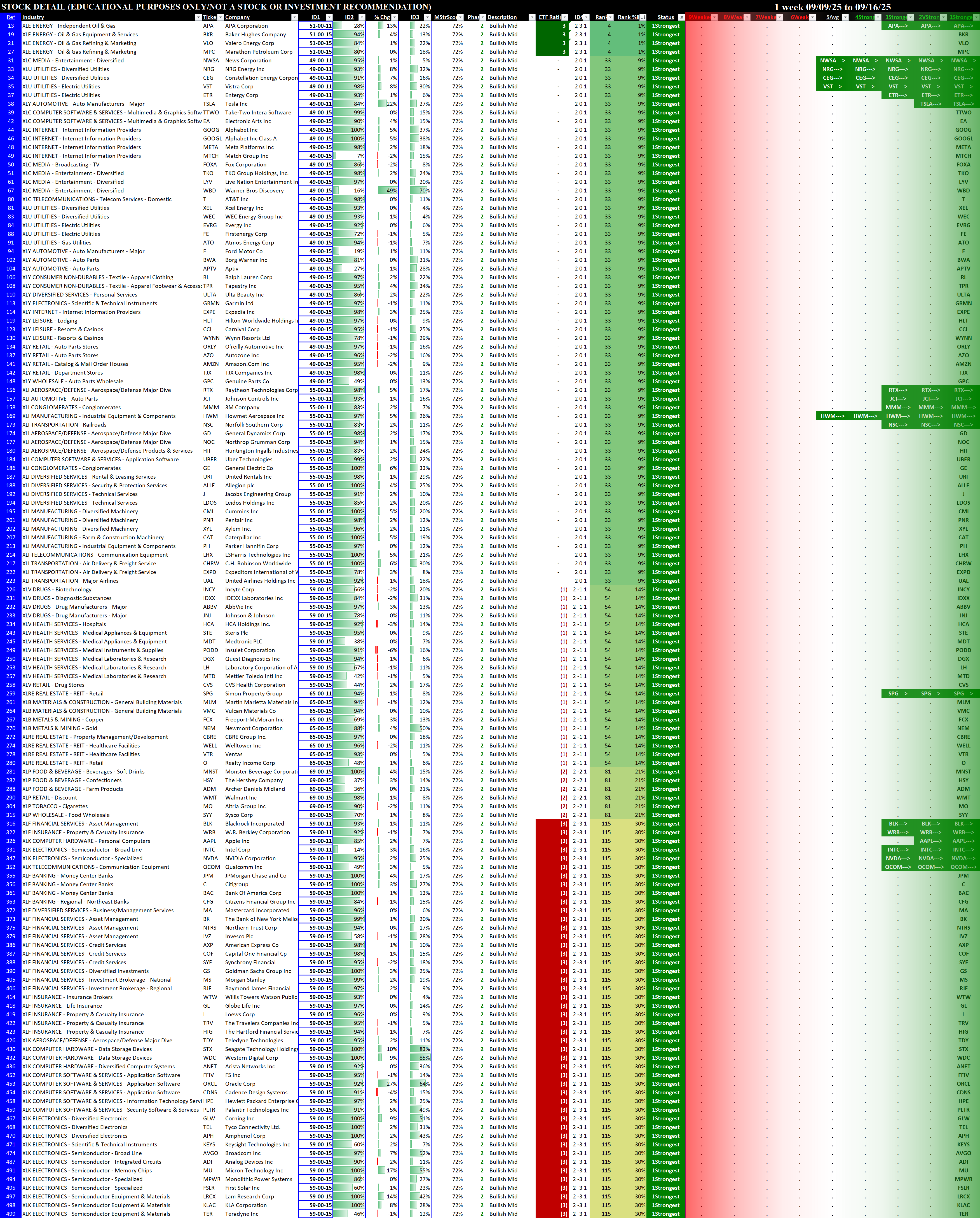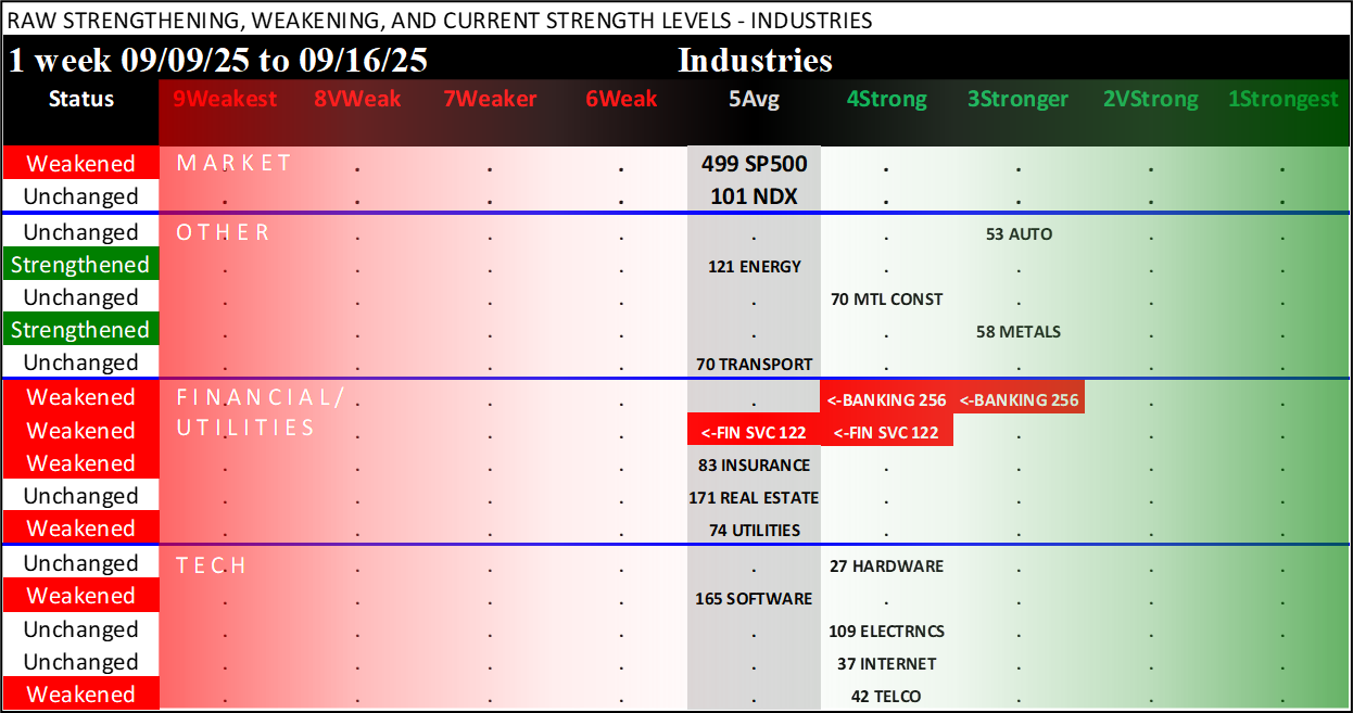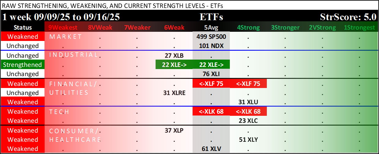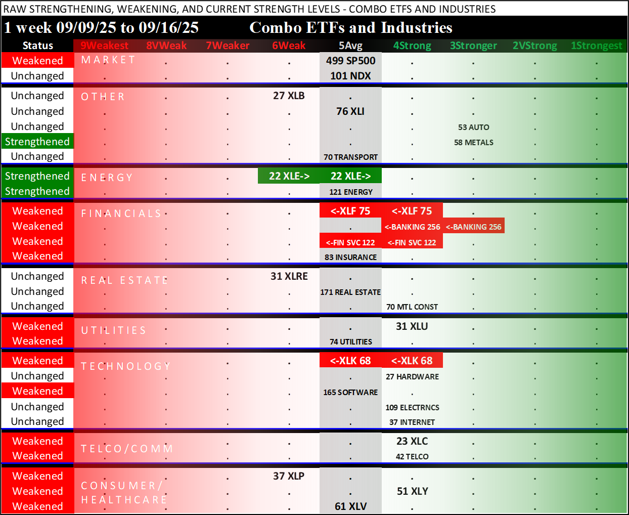 Referred to as Spectrum format (these are presented as the spectrum of possibilities from 9Weakest to 1Strongest), here are the raw strength readings for each sector with their change for the just-completed week: