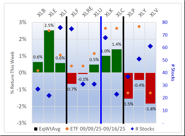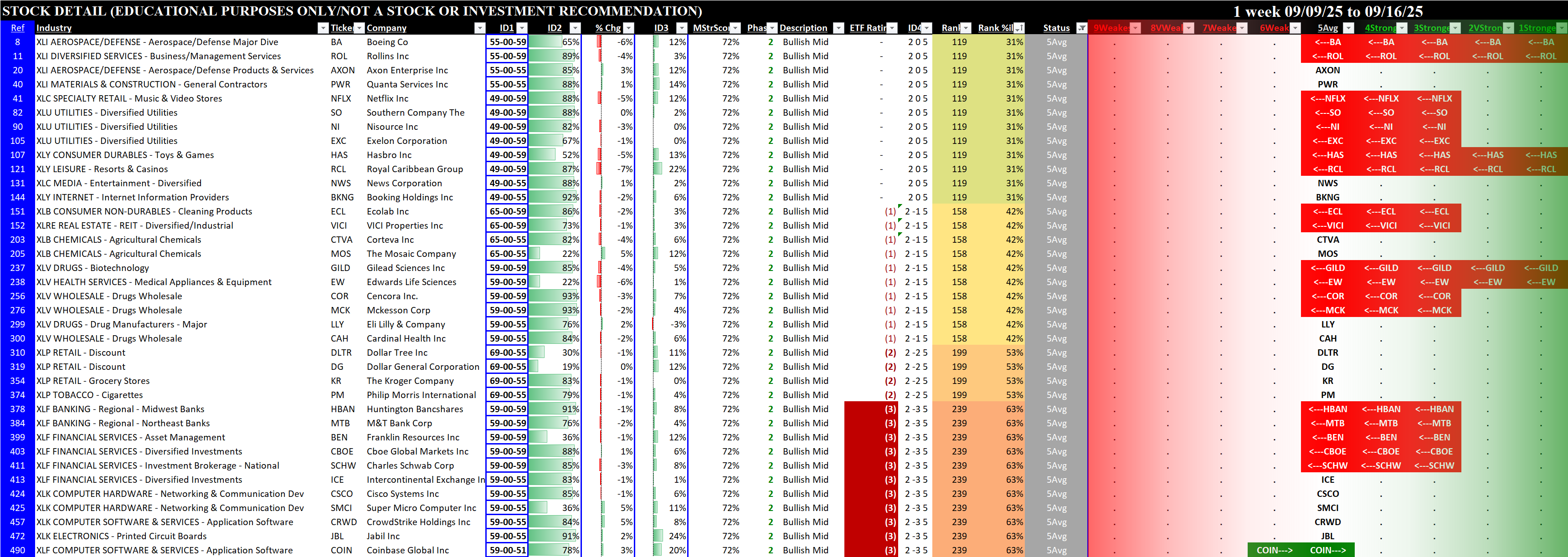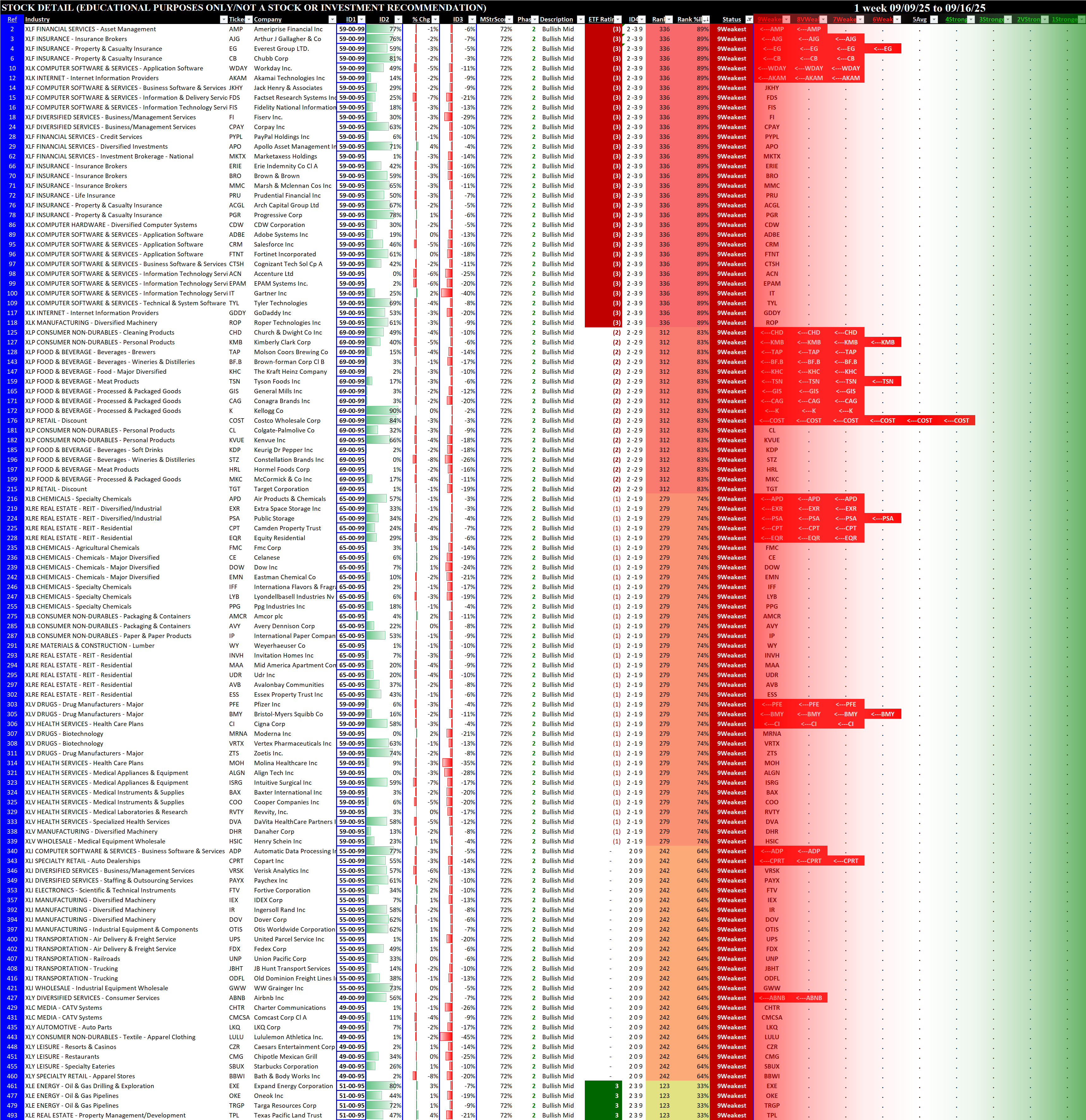 Referred to as Spectrum format (these are presented as the spectrum of possibilities from 9Weakest to 1Strongest), here are the raw strength readings for each sector with their change for the just-completed week: