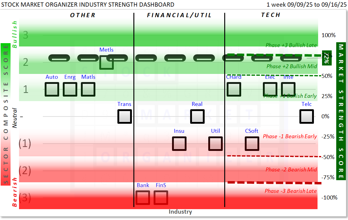 Selected key industries are presented below in Dashboard and Spectrum format similar to the ETFs/Sectors summary above. The underlying information here is the full component stock populations, not just the 500 ETF stocks. Thus, it provides a broader view of underlying strength and weakness and should be used to enhance the ETF Sector insights.