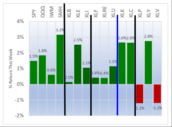 Weekly returns re-cap - the first chart below shows the equal weight returns for the 11 ETFs and the second shows the returns for four indexes and the 11 ETFs.