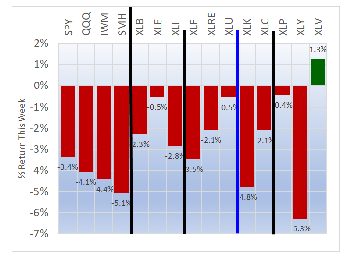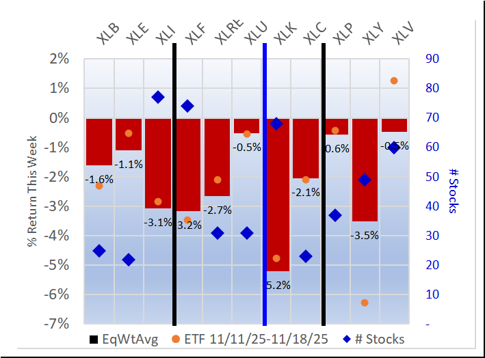 Weekly returns re-cap - the first chart below shows the equal weight returns for the 11 ETFs and the second shows the returns for four indexes and the 11 ETFs.