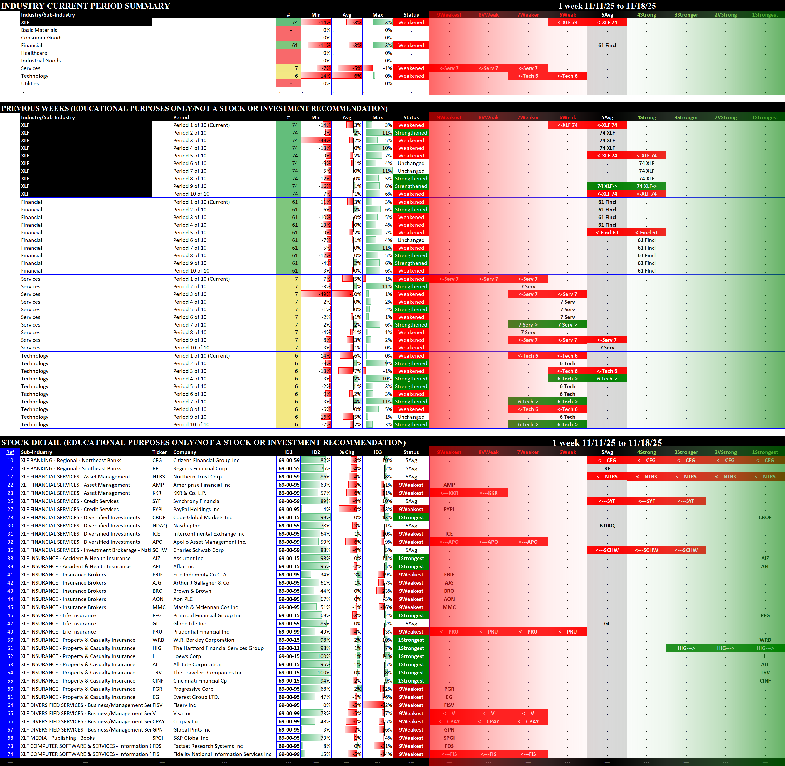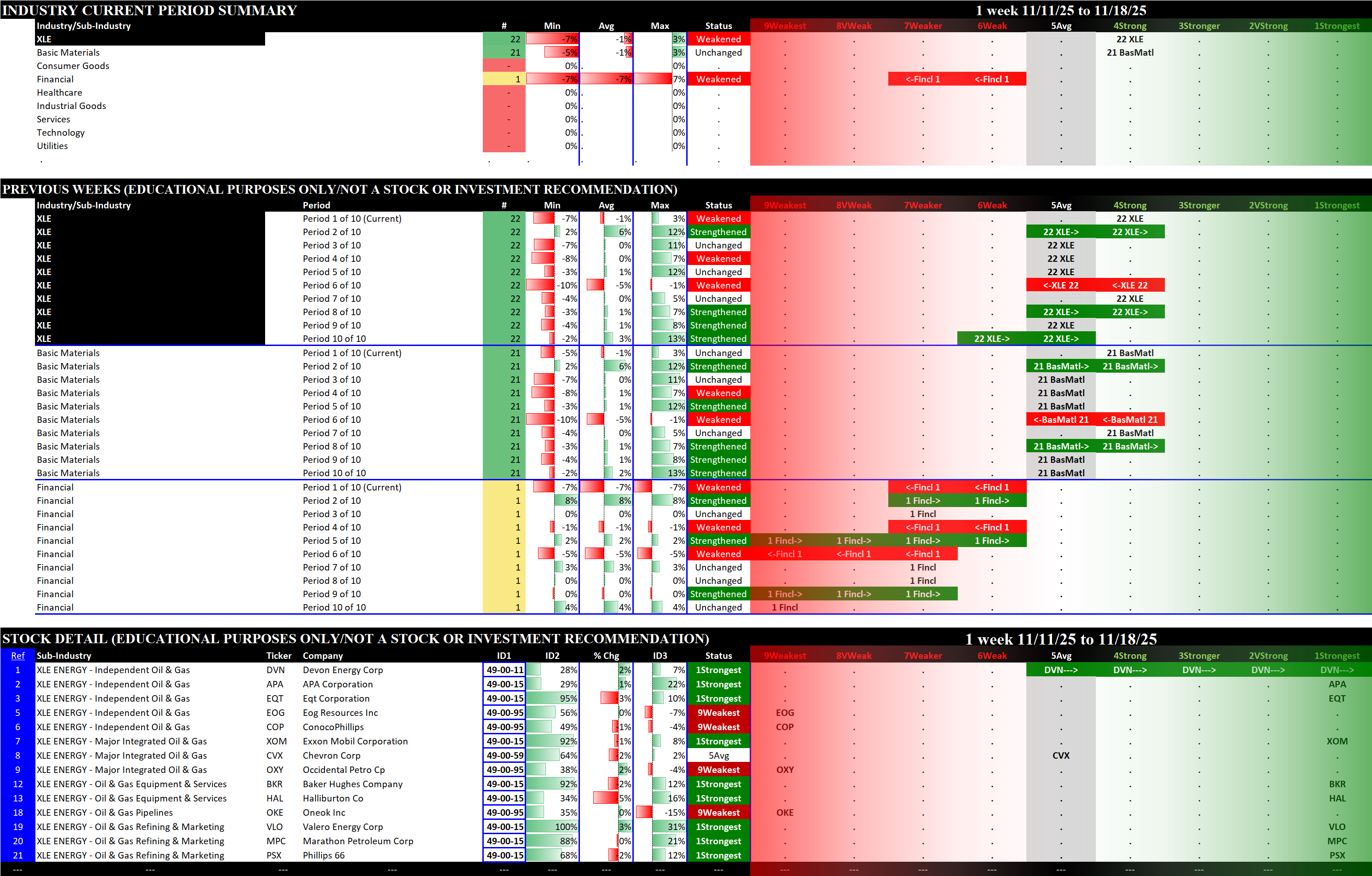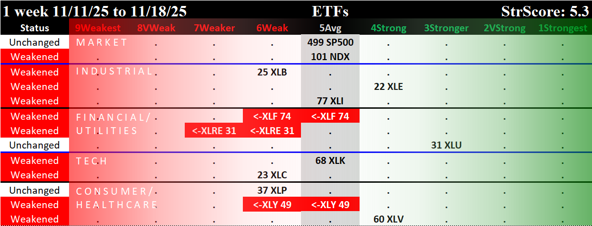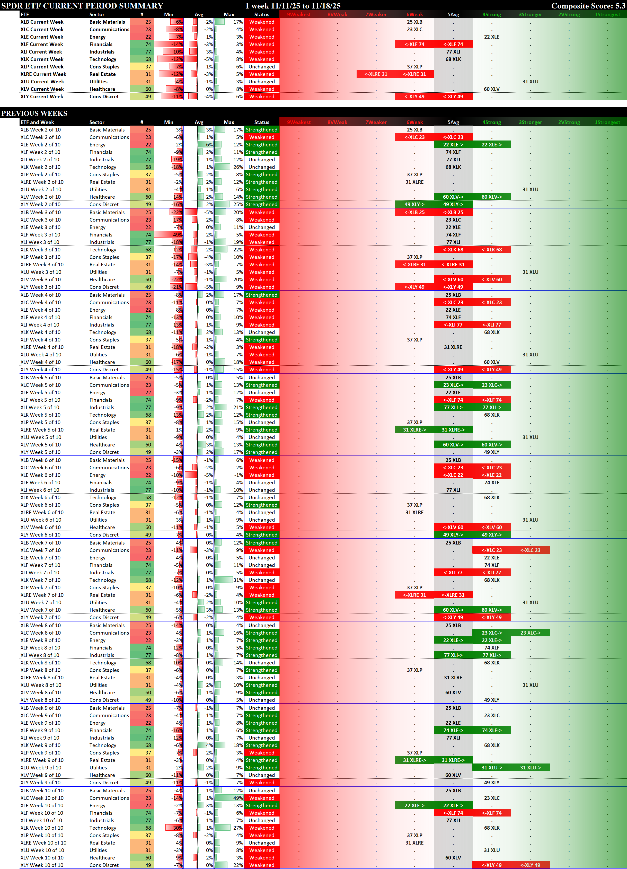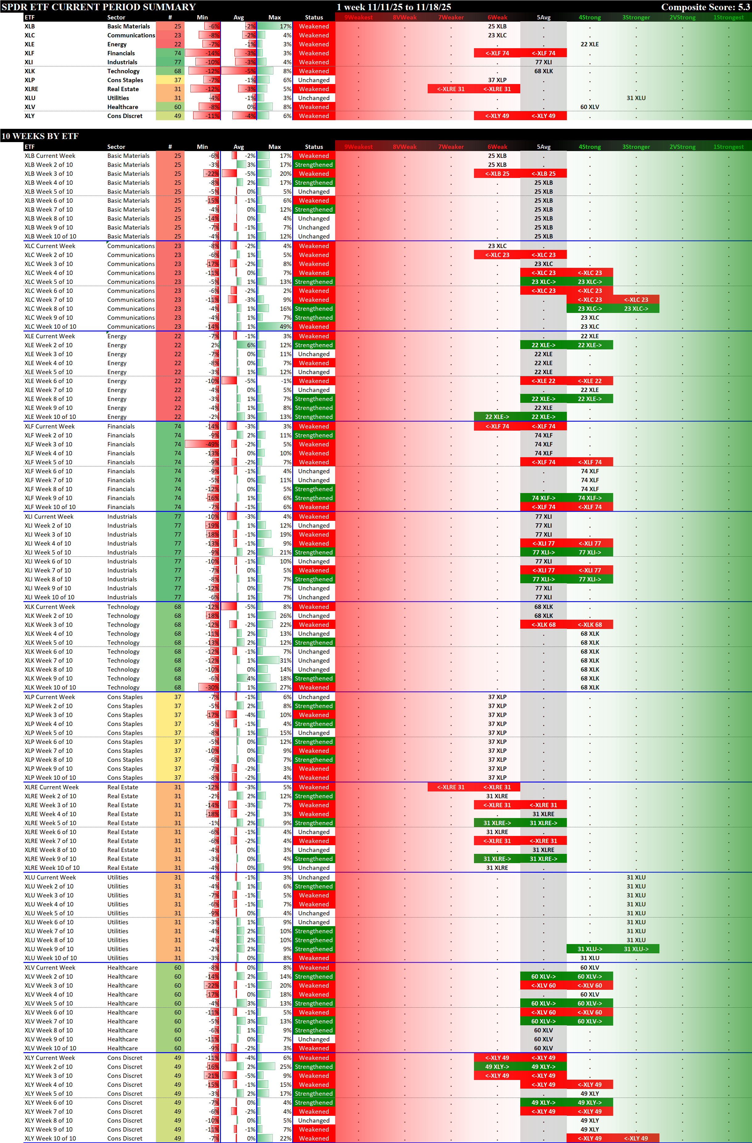 Referred to as Spectrum format (these are presented as the spectrum of possibilities from 9Weakest to 1Strongest), here are the raw strength readings for each sector with their change for the just-completed week:
