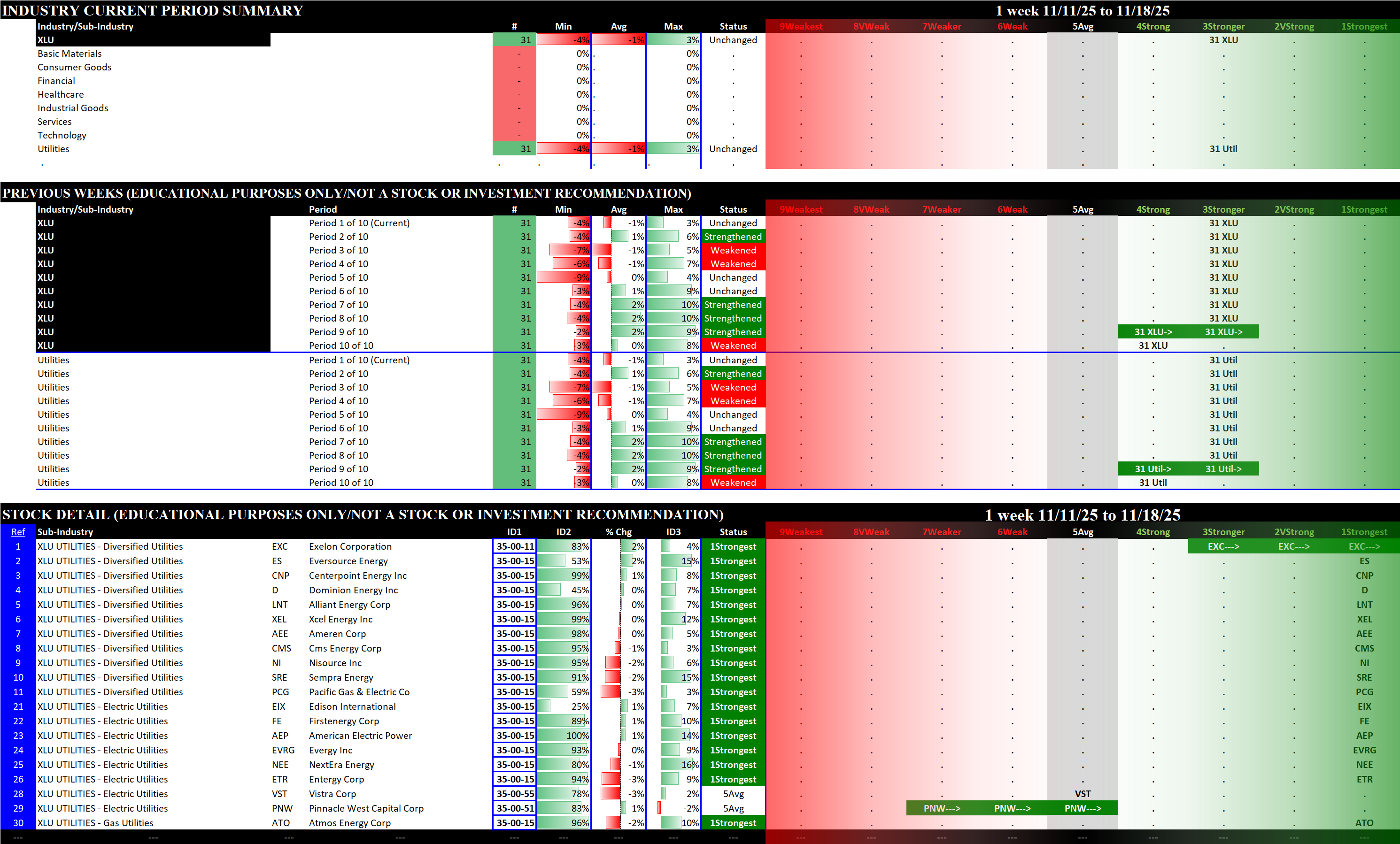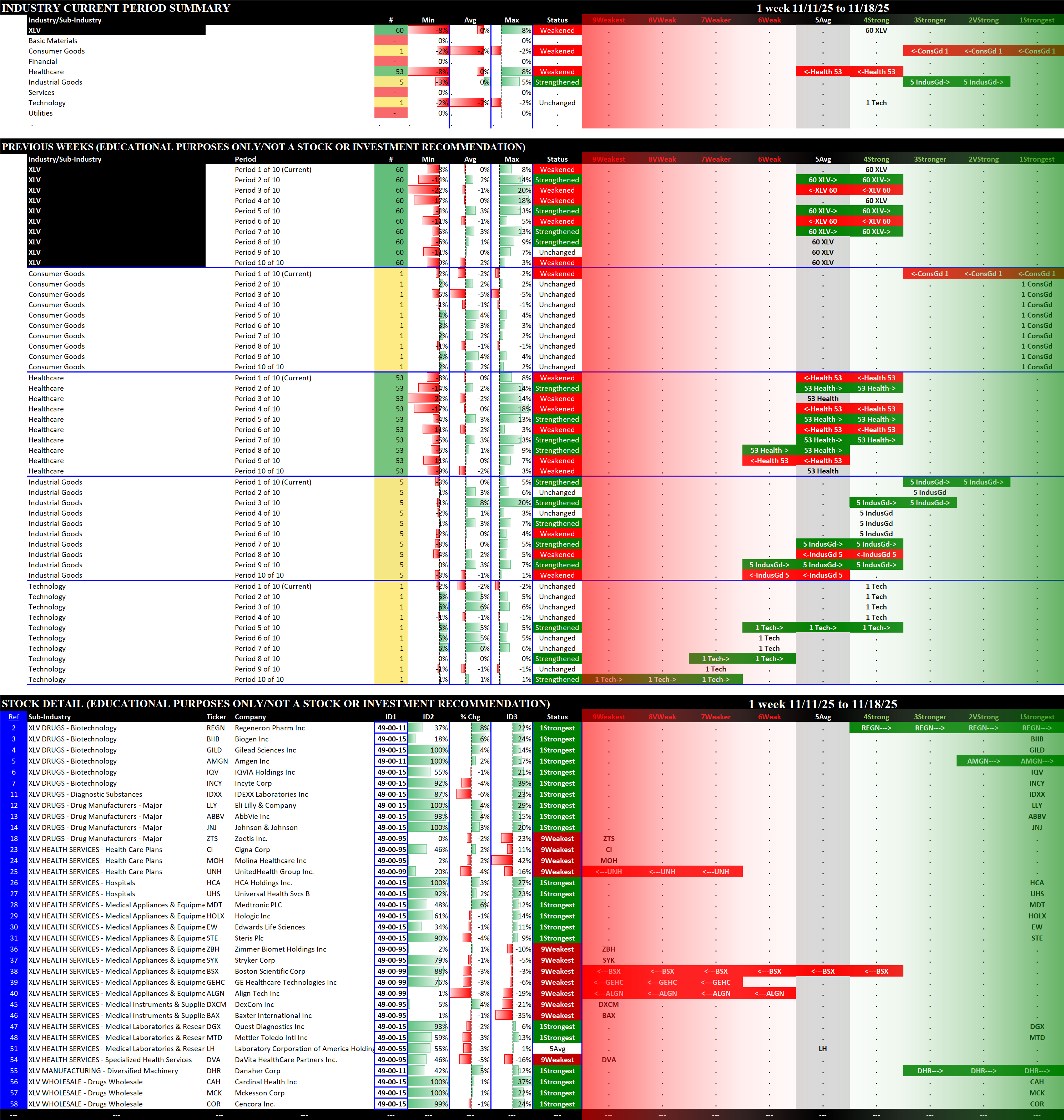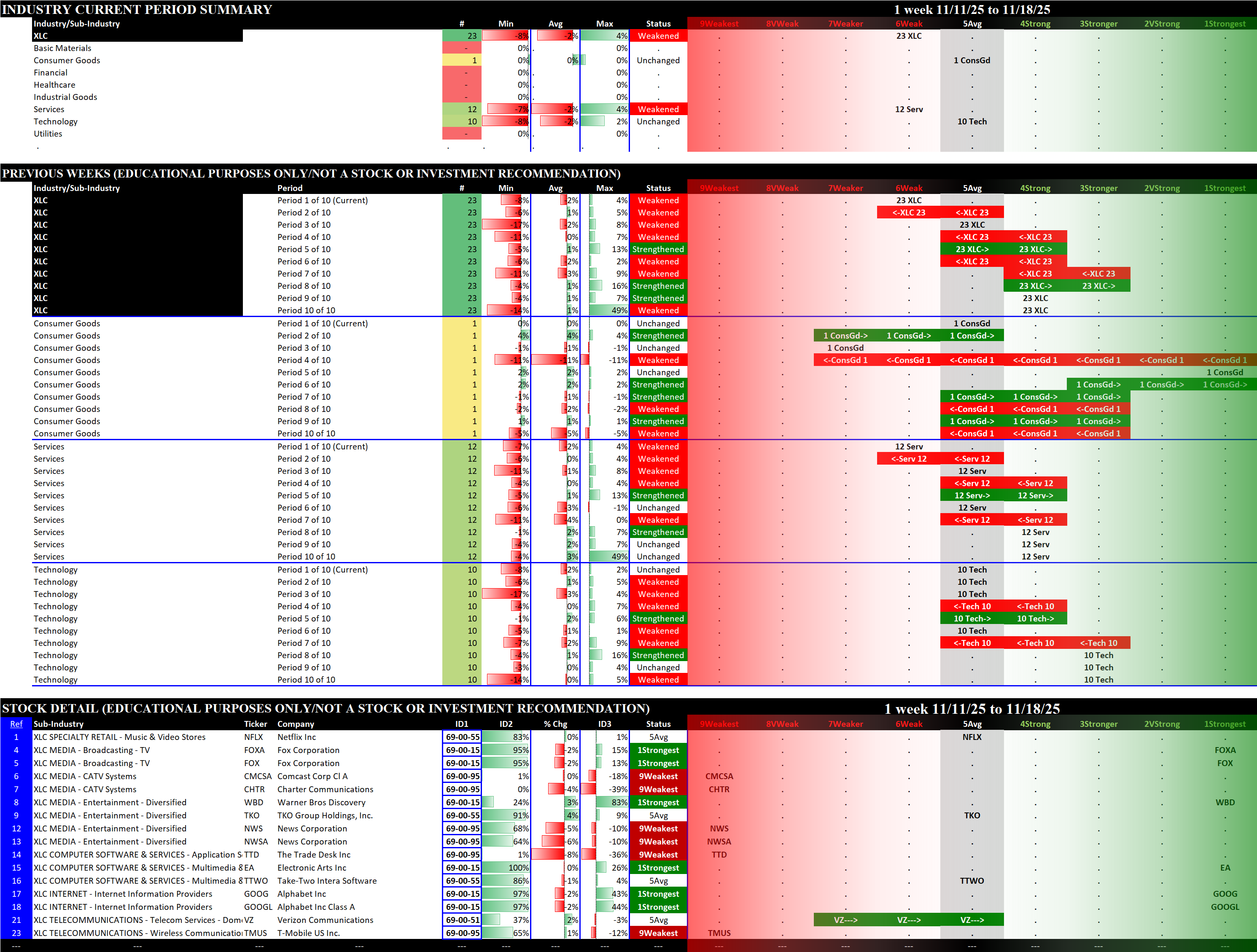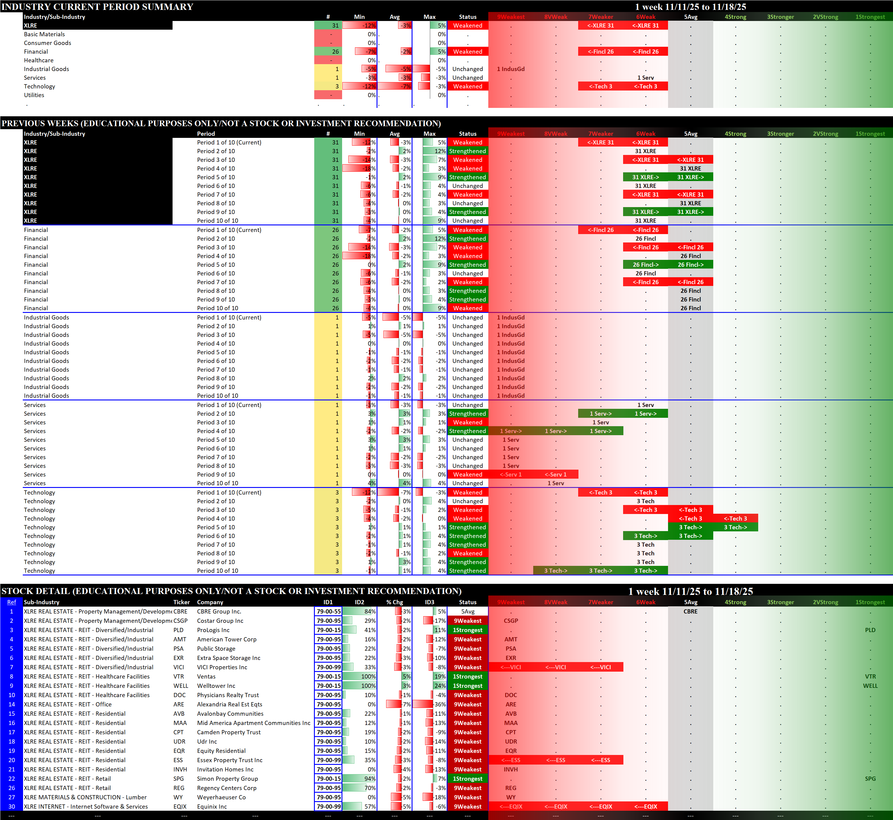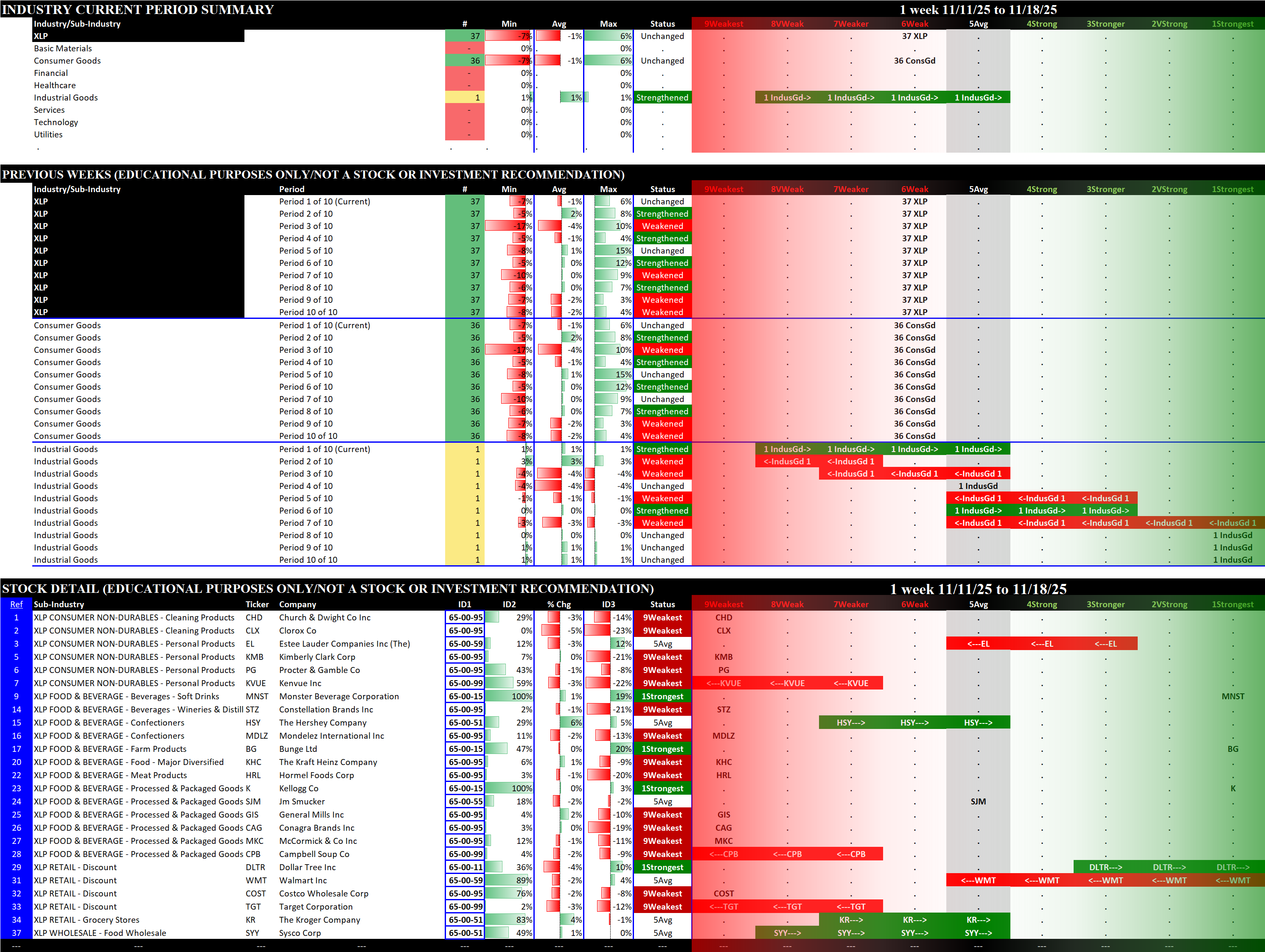 Referred to as Spectrum format (these are presented as the spectrum of possibilities from 9Weakest to 1Strongest), here are the raw strength readings for each sector with their change for the just-completed week: