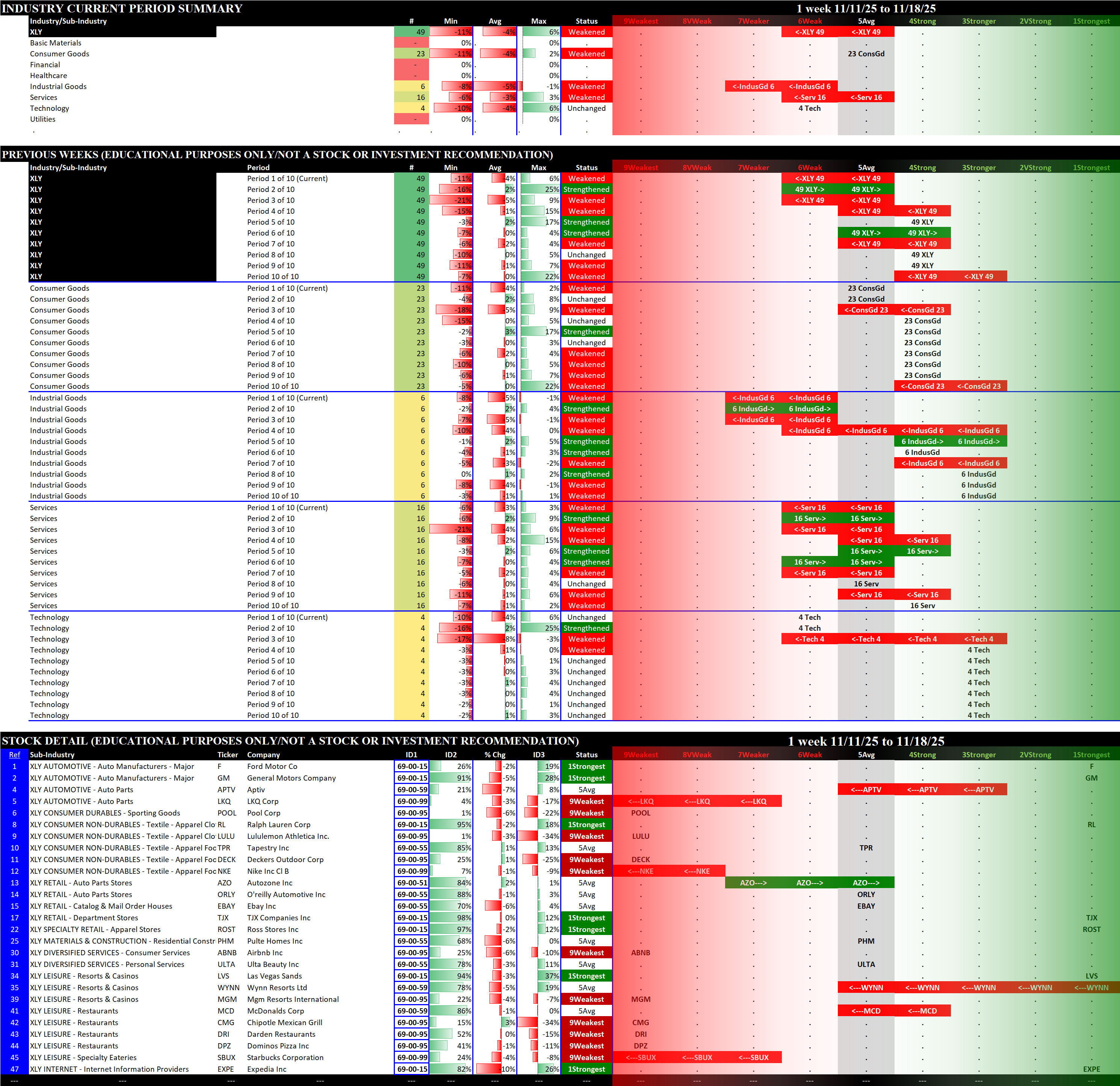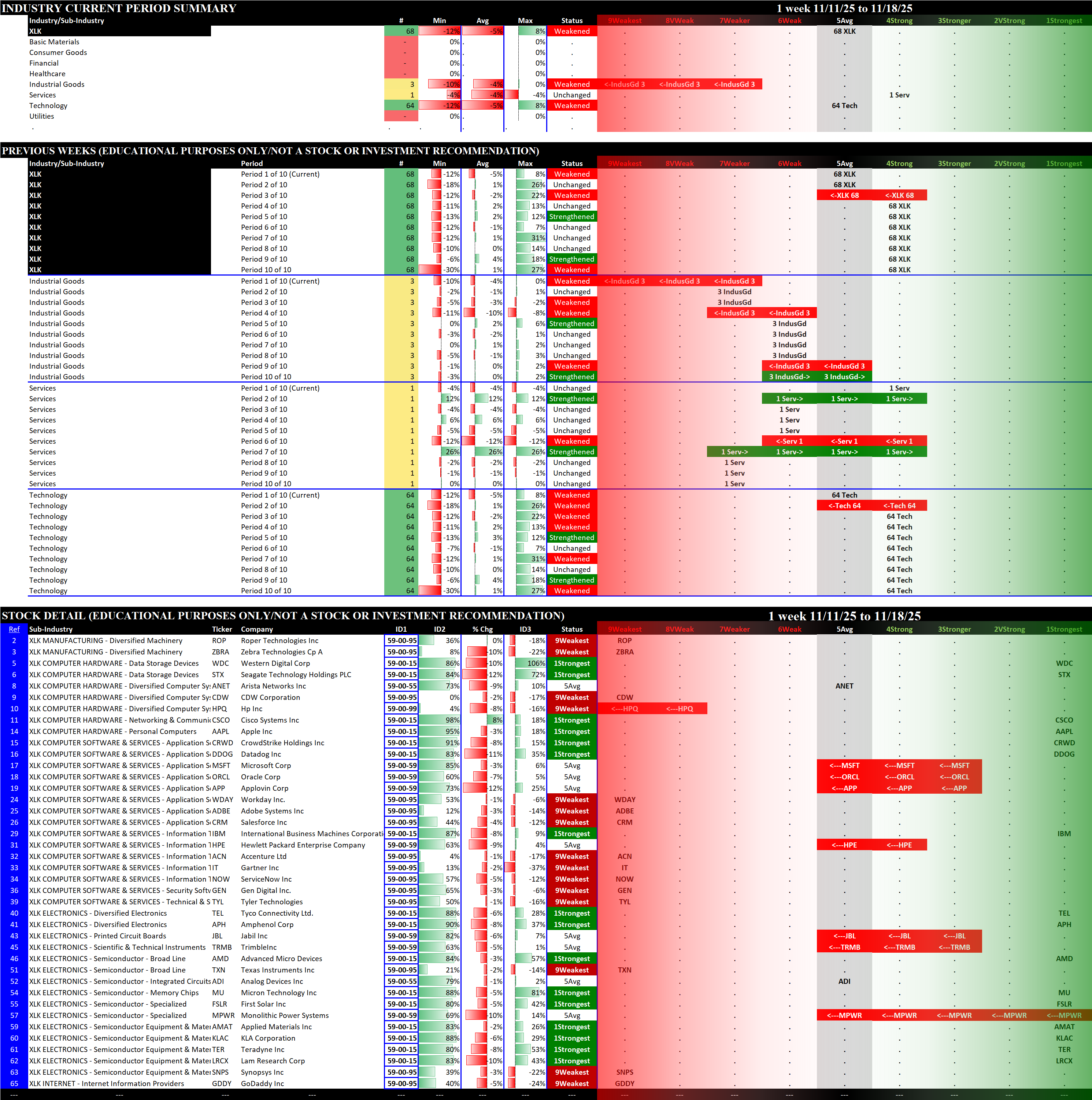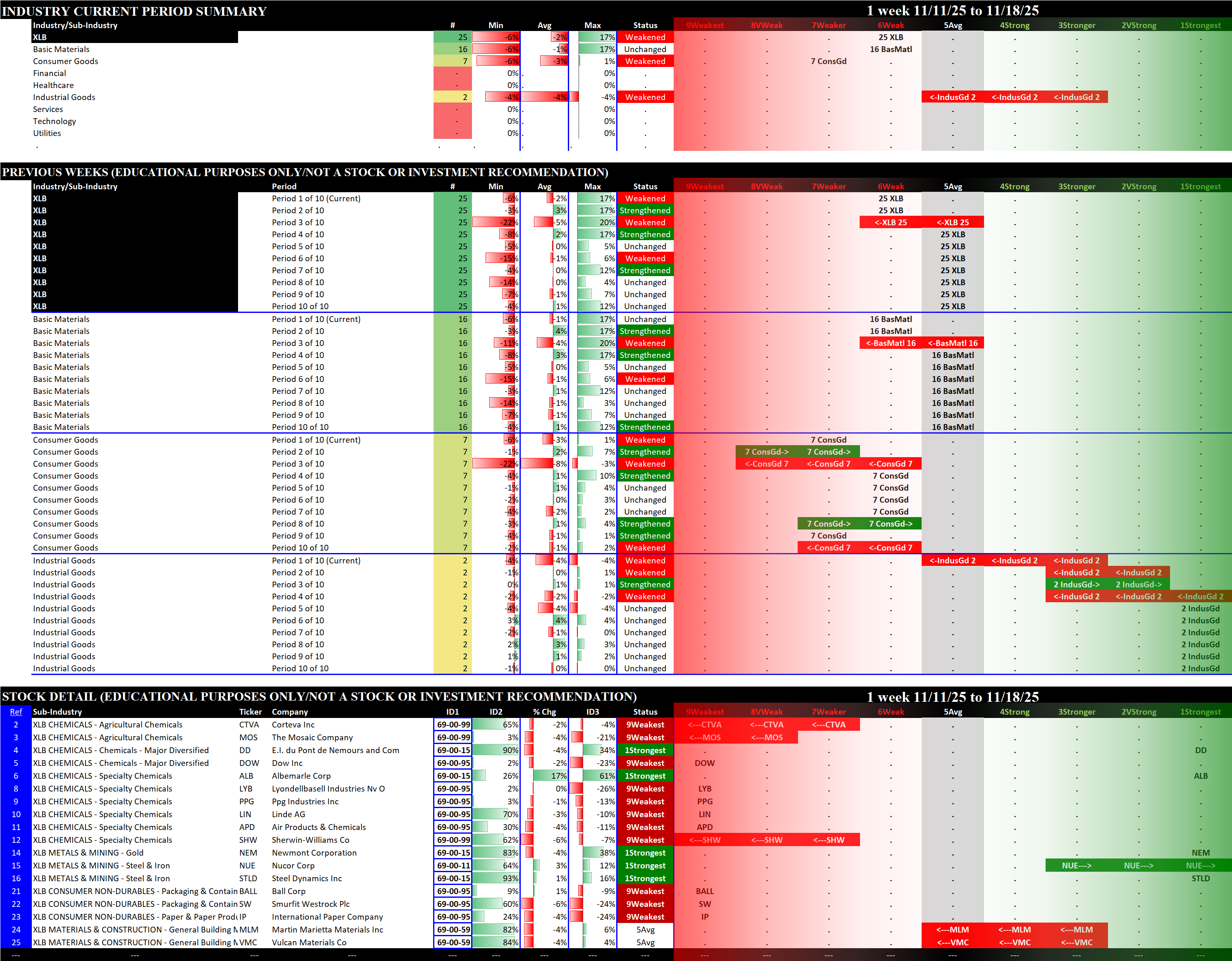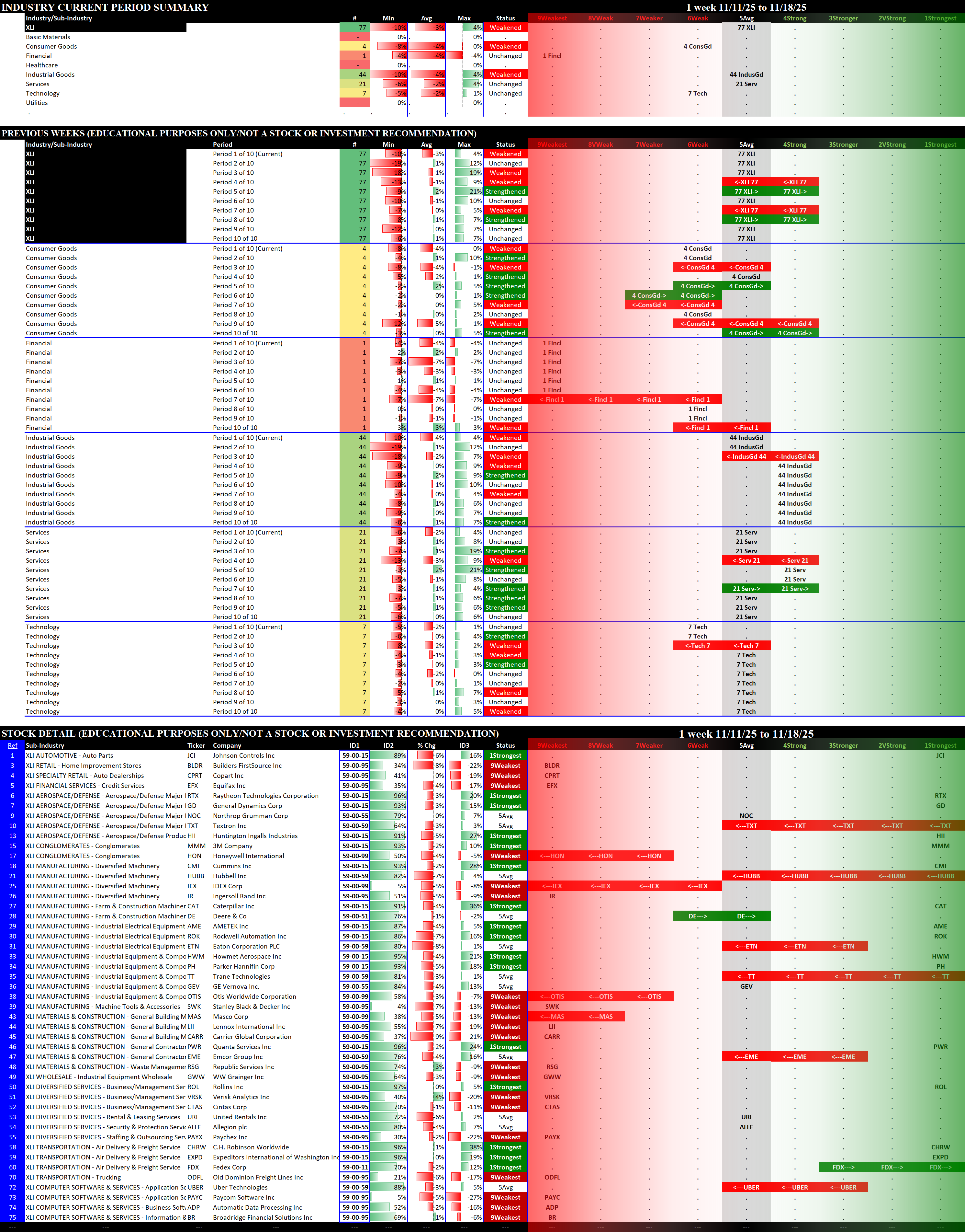 Referred to as Spectrum format (these are presented as the spectrum of possibilities from 9Weakest to 1Strongest), here are the raw strength readings for each sector with their change for the just-completed week: