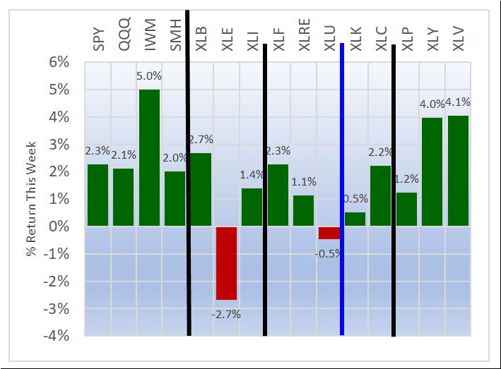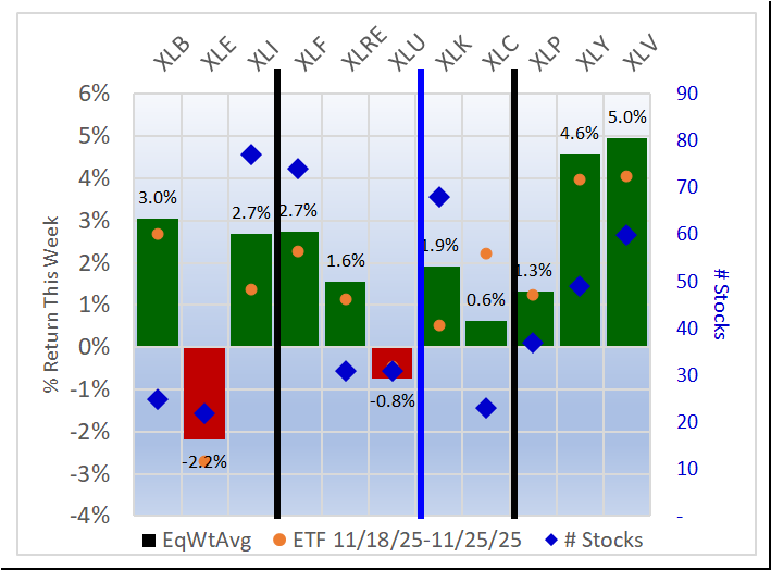 Weekly returns re-cap - the first chart below shows the equal weight returns for the 11 ETFs and the second shows the returns for four indexes and the 11 ETFs.