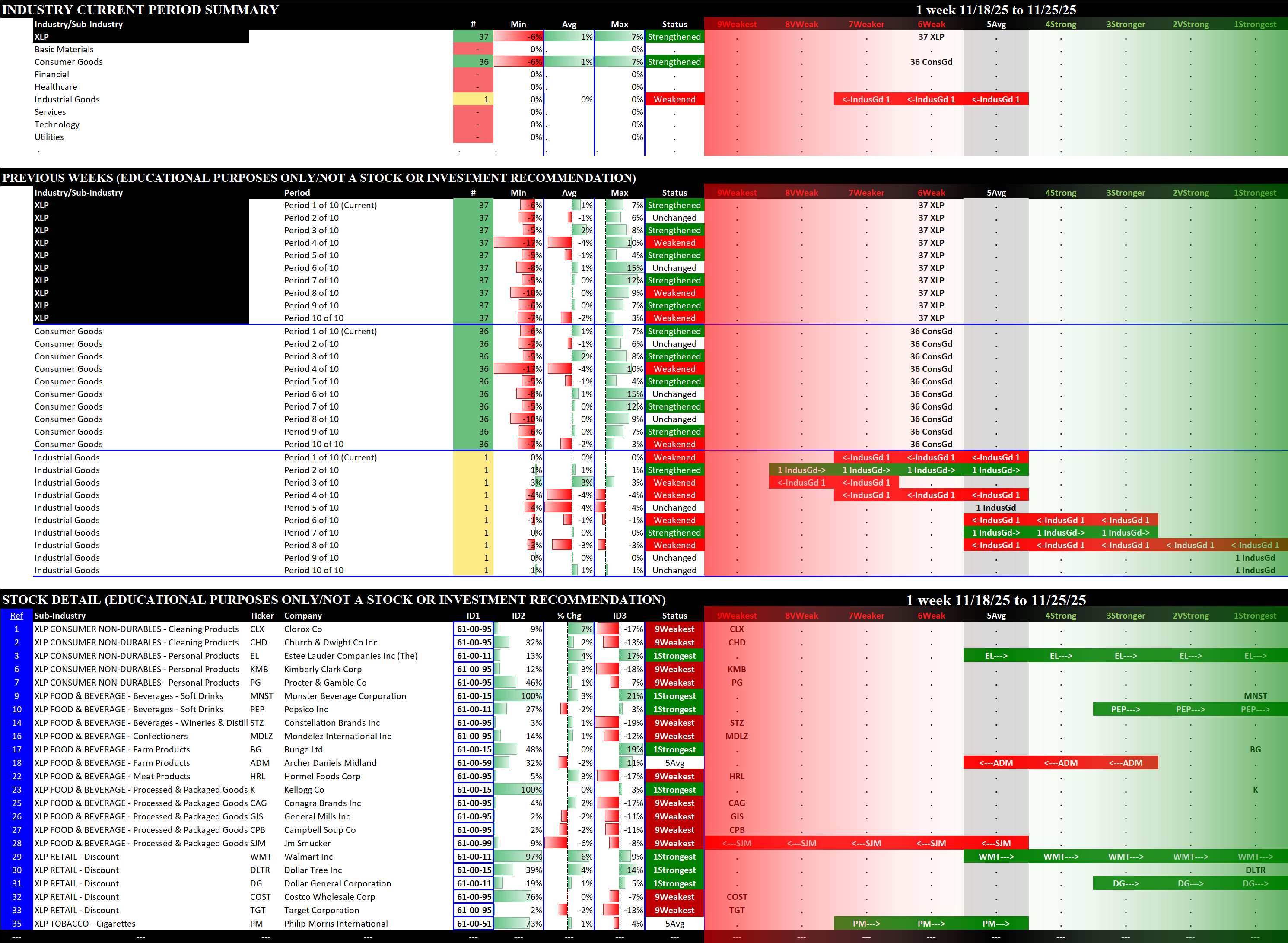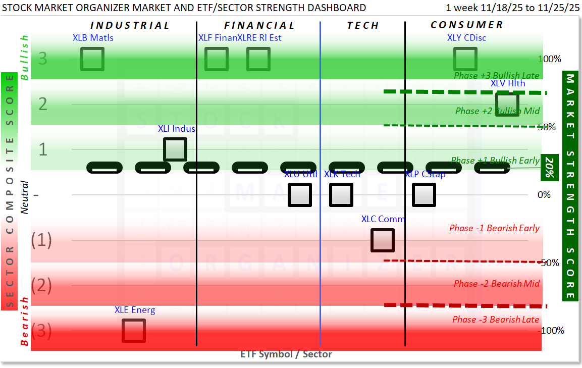 This Market and Sector Strength Dashboard converts to actionable information the raw strengthening, weakening, and current strength levels shown in the spectrum graph below.
