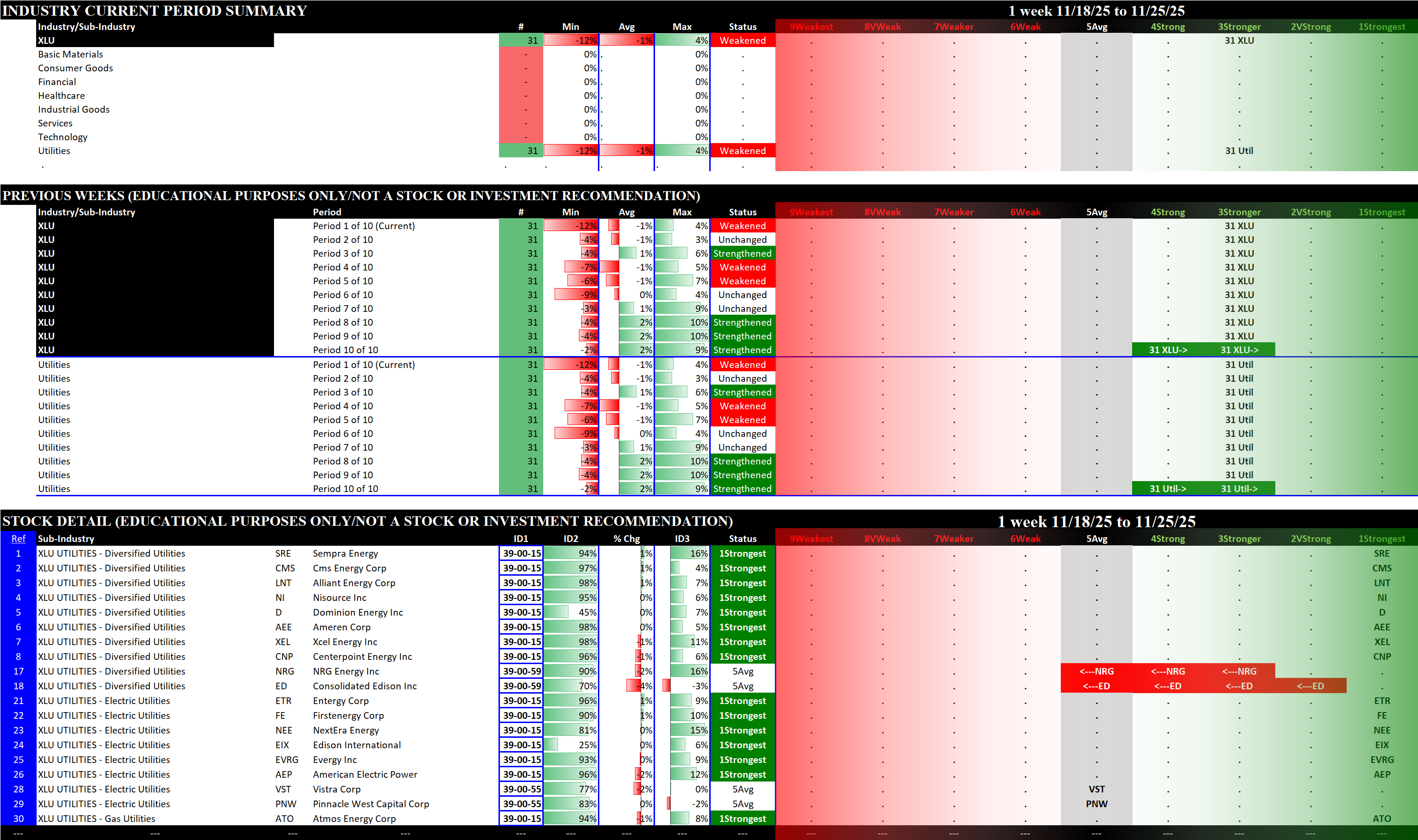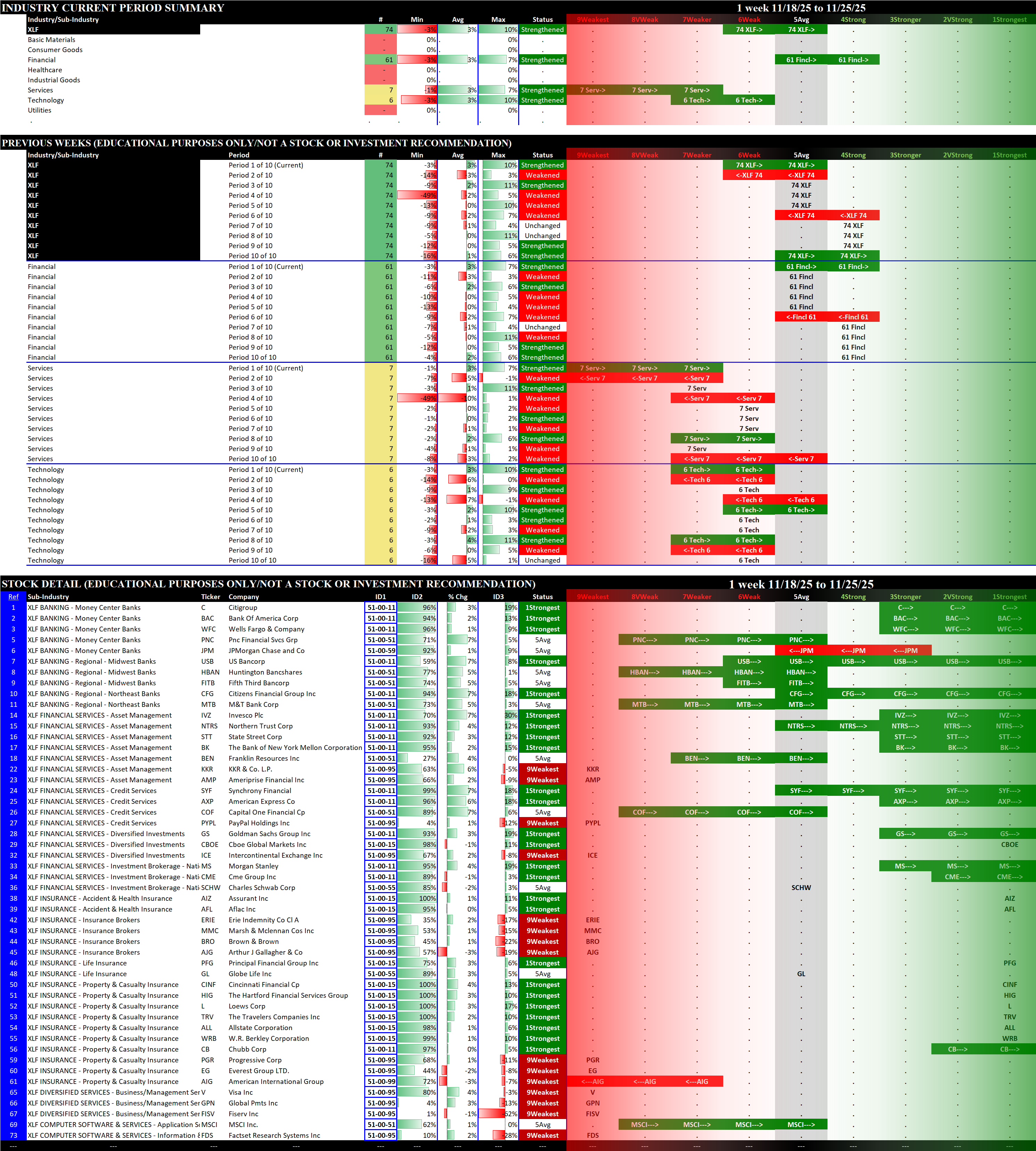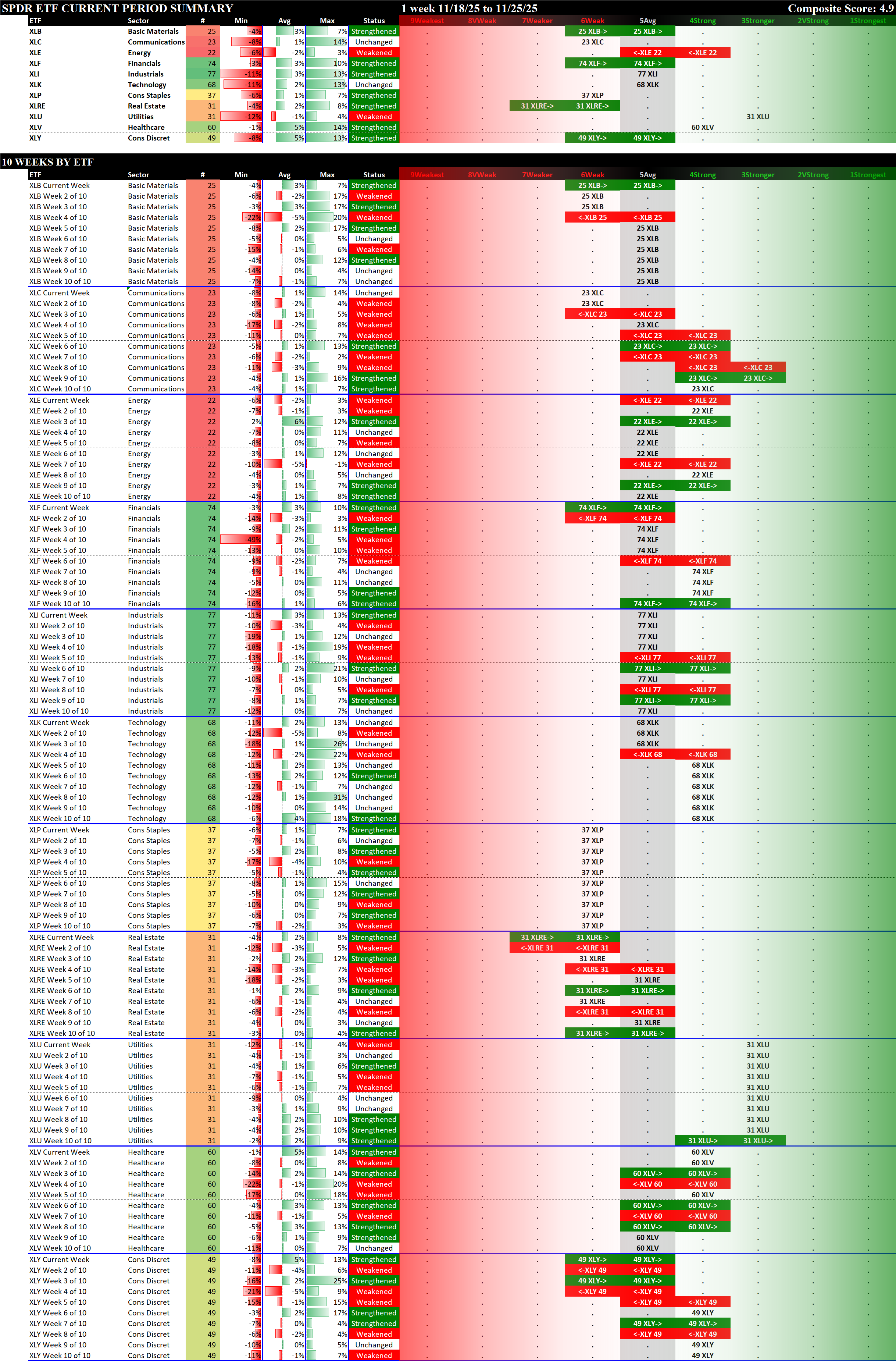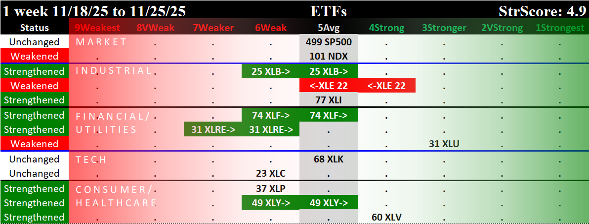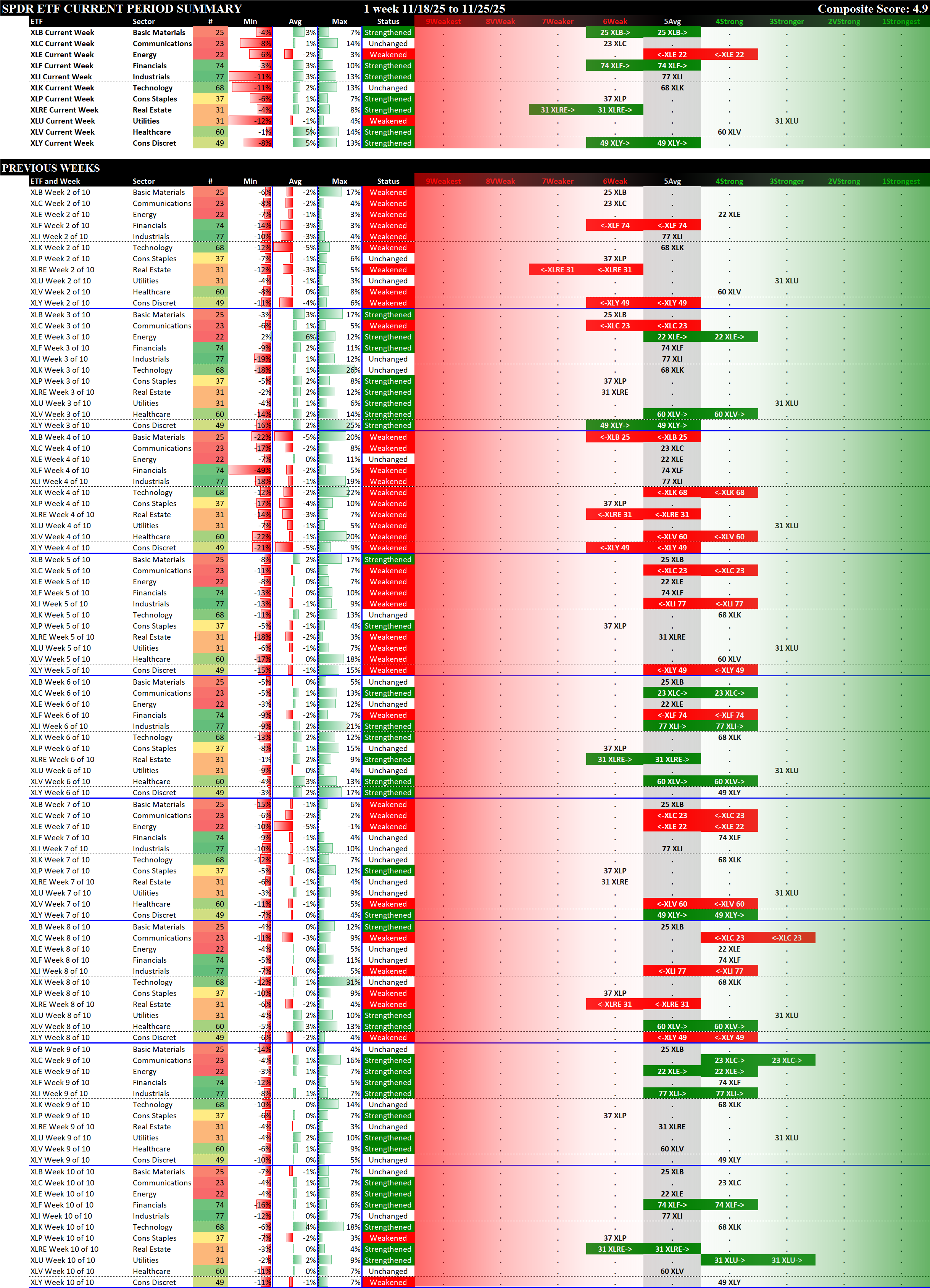 Referred to as Spectrum format (these are presented as the spectrum of possibilities from 9Weakest to 1Strongest), here are the raw strength readings for each sector with their change for the just-completed week:
