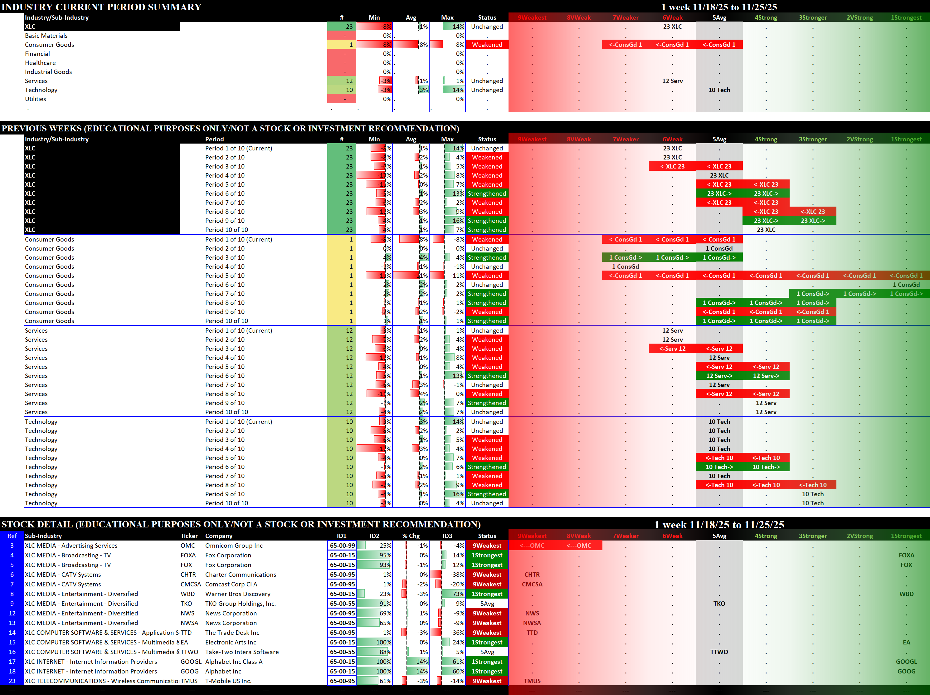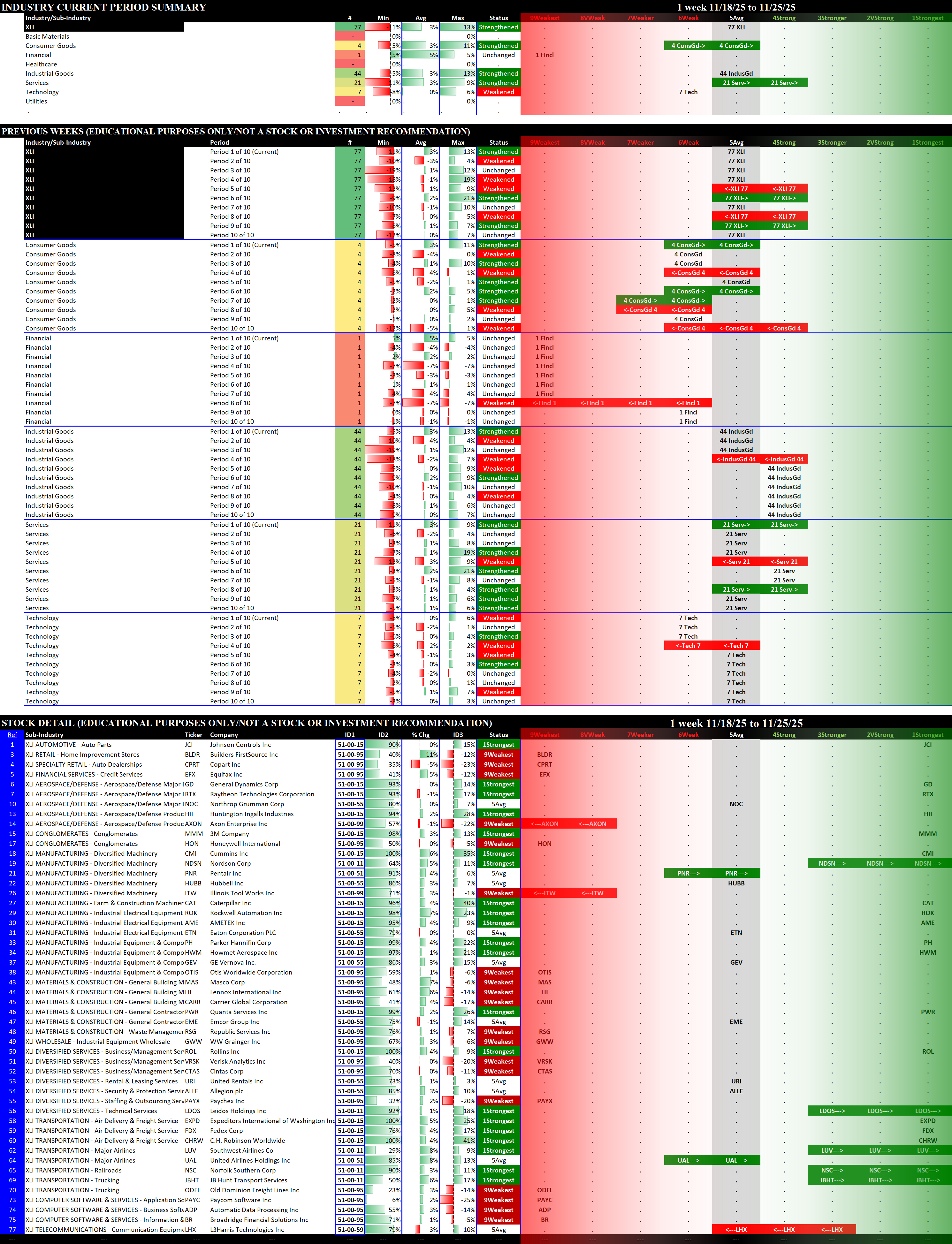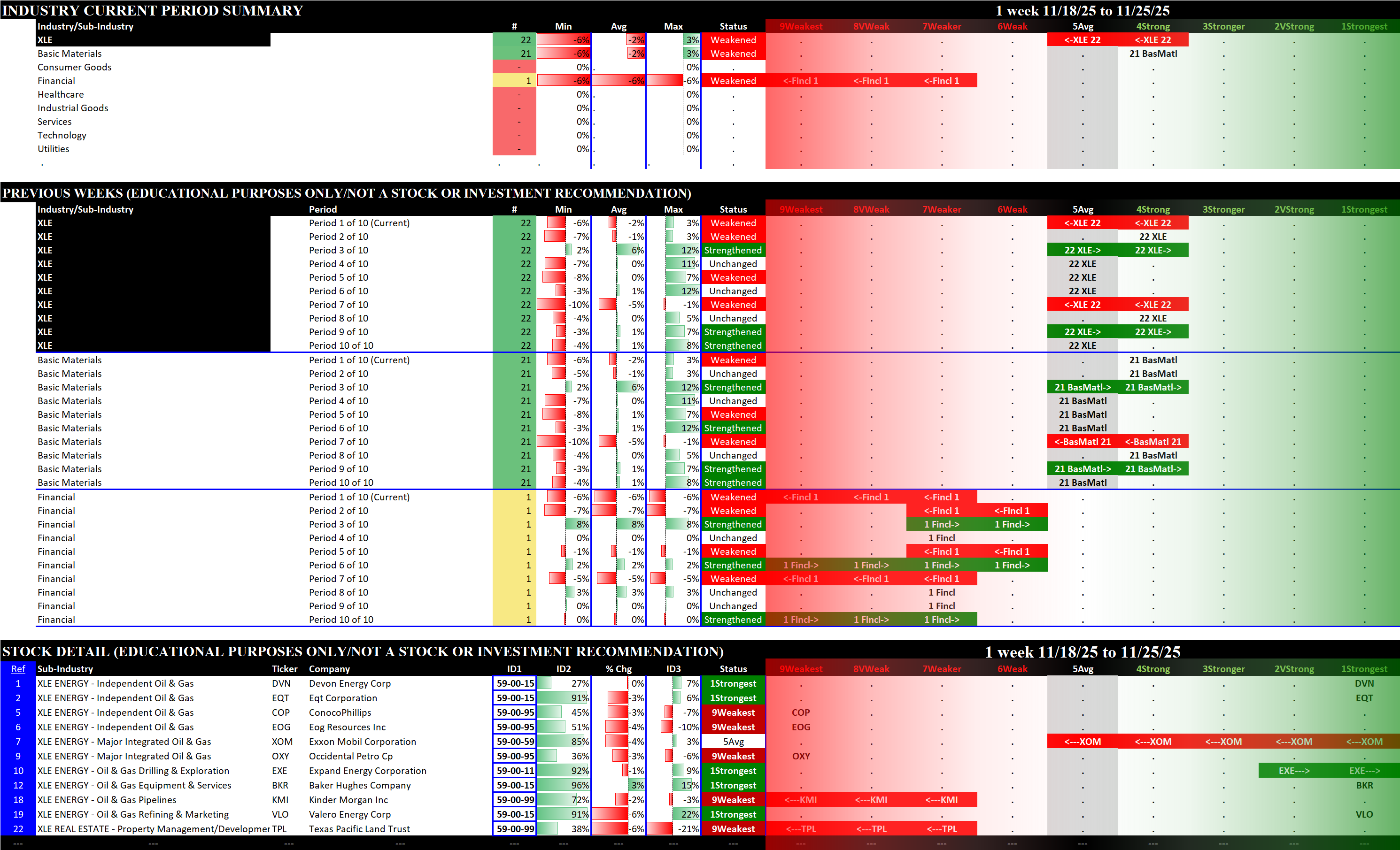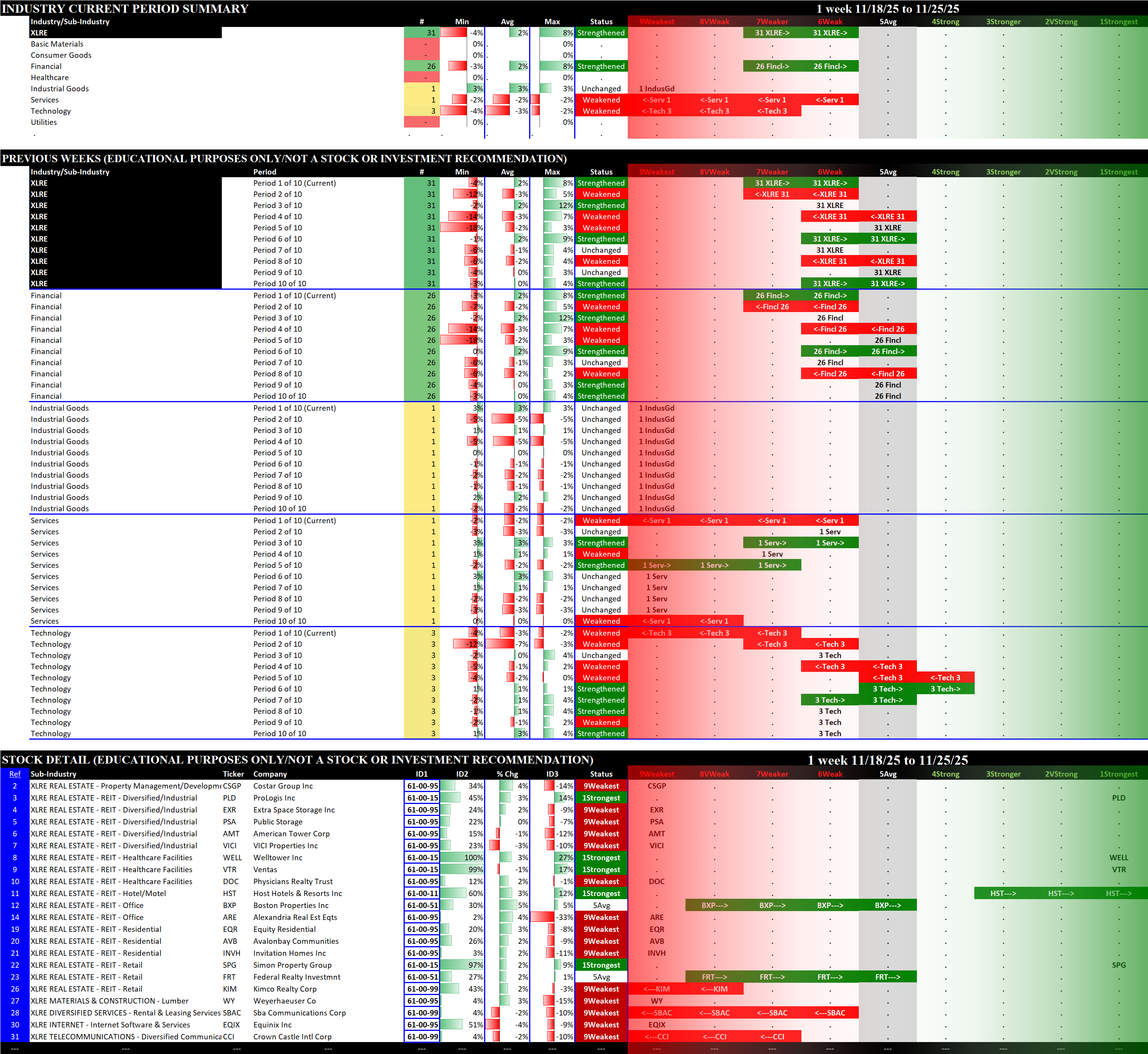 Referred to as Spectrum format (these are presented as the spectrum of possibilities from 9Weakest to 1Strongest), here are the raw strength readings for each sector with their change for the just-completed week:
