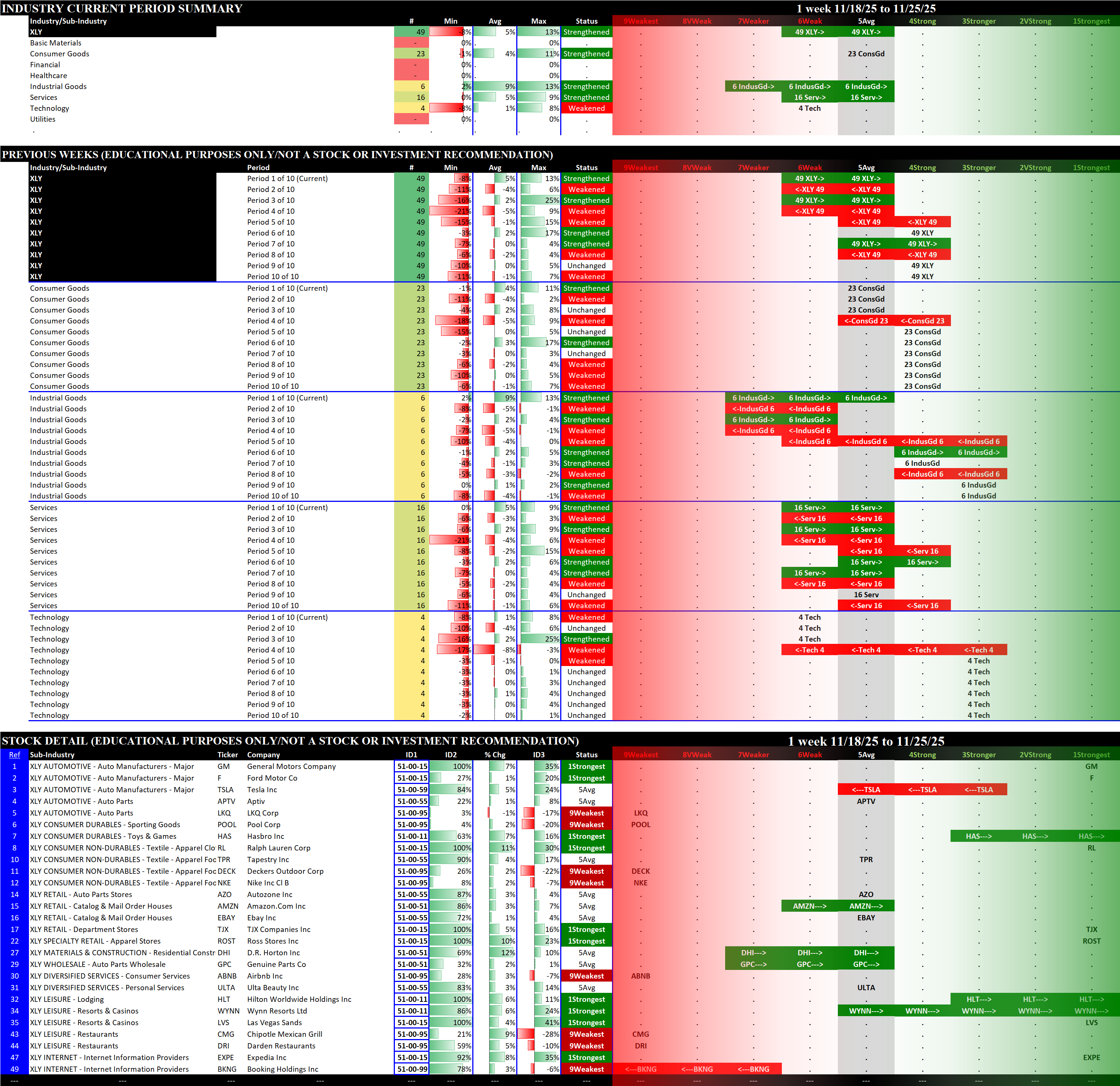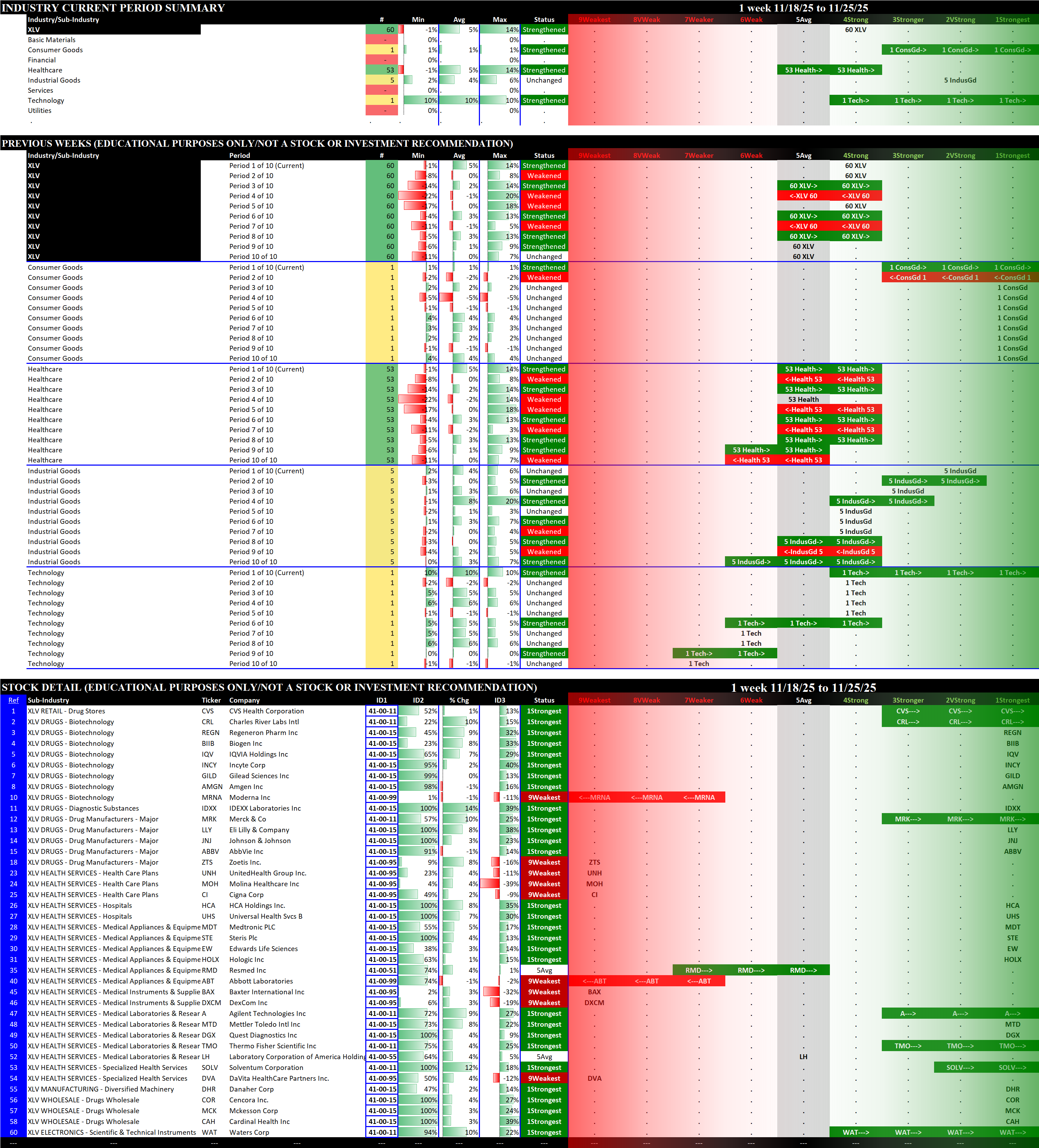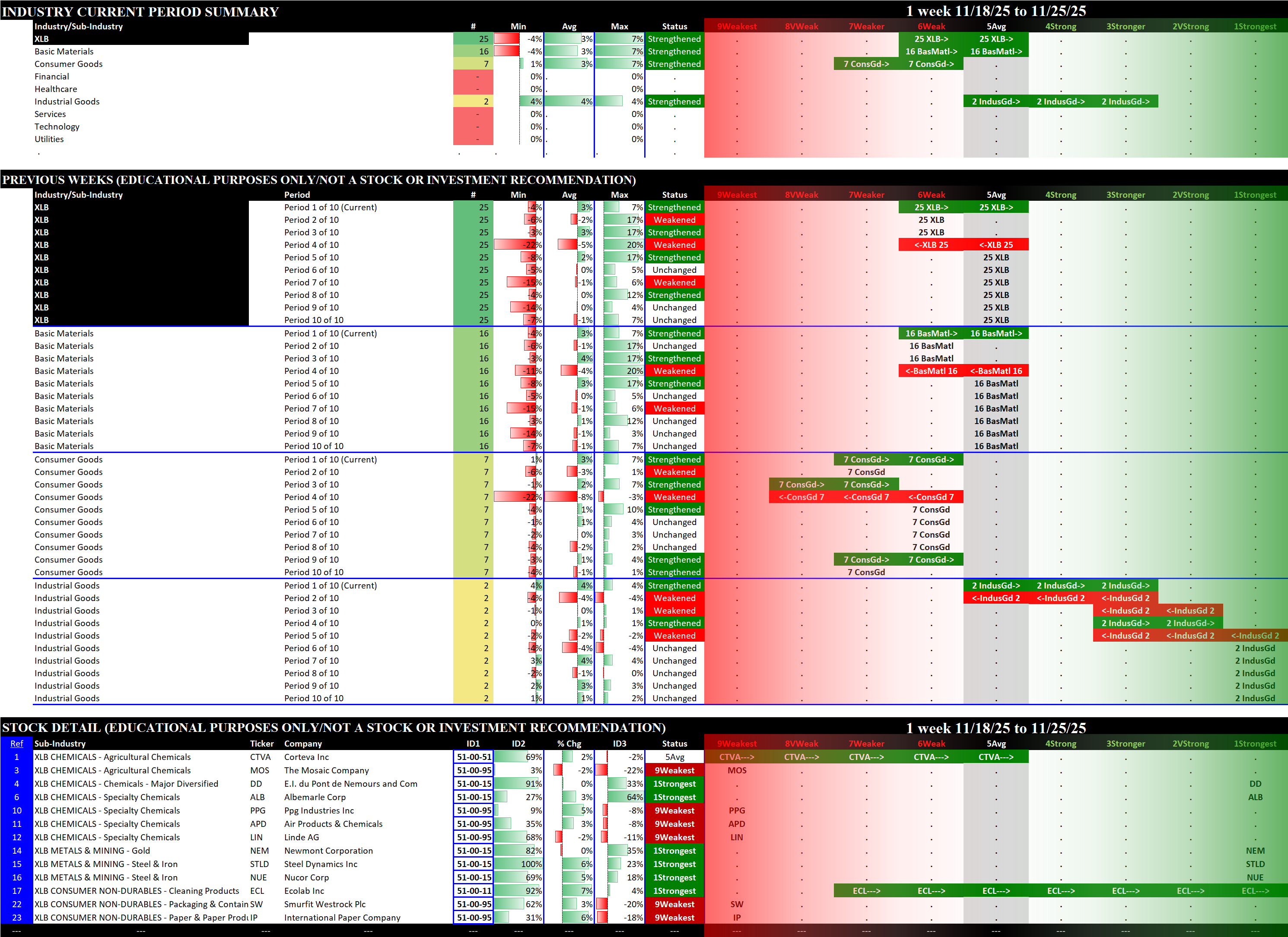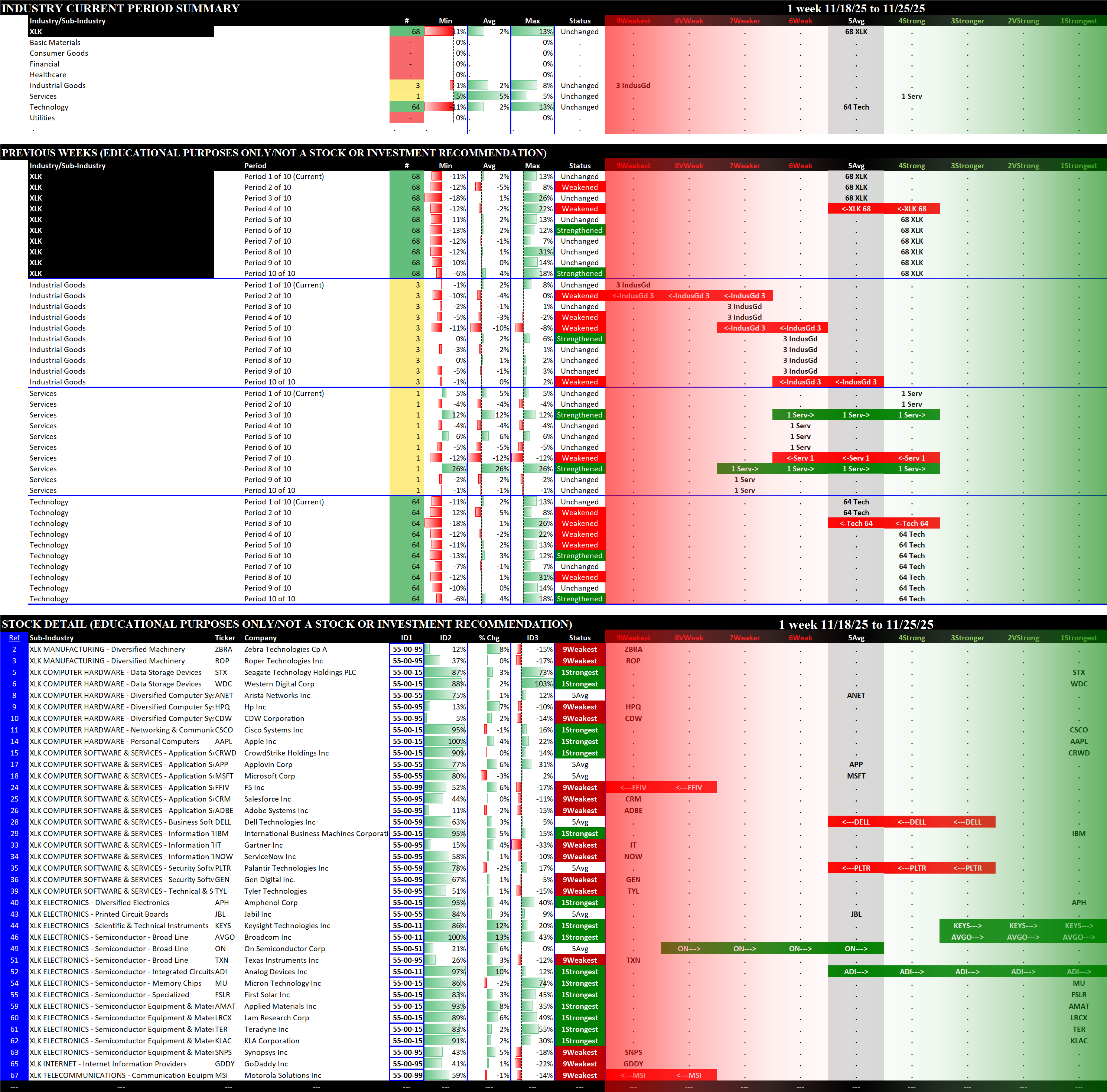 Referred to as Spectrum format (these are presented as the spectrum of possibilities from 9Weakest to 1Strongest), here are the raw strength readings for each sector with their change for the just-completed week: