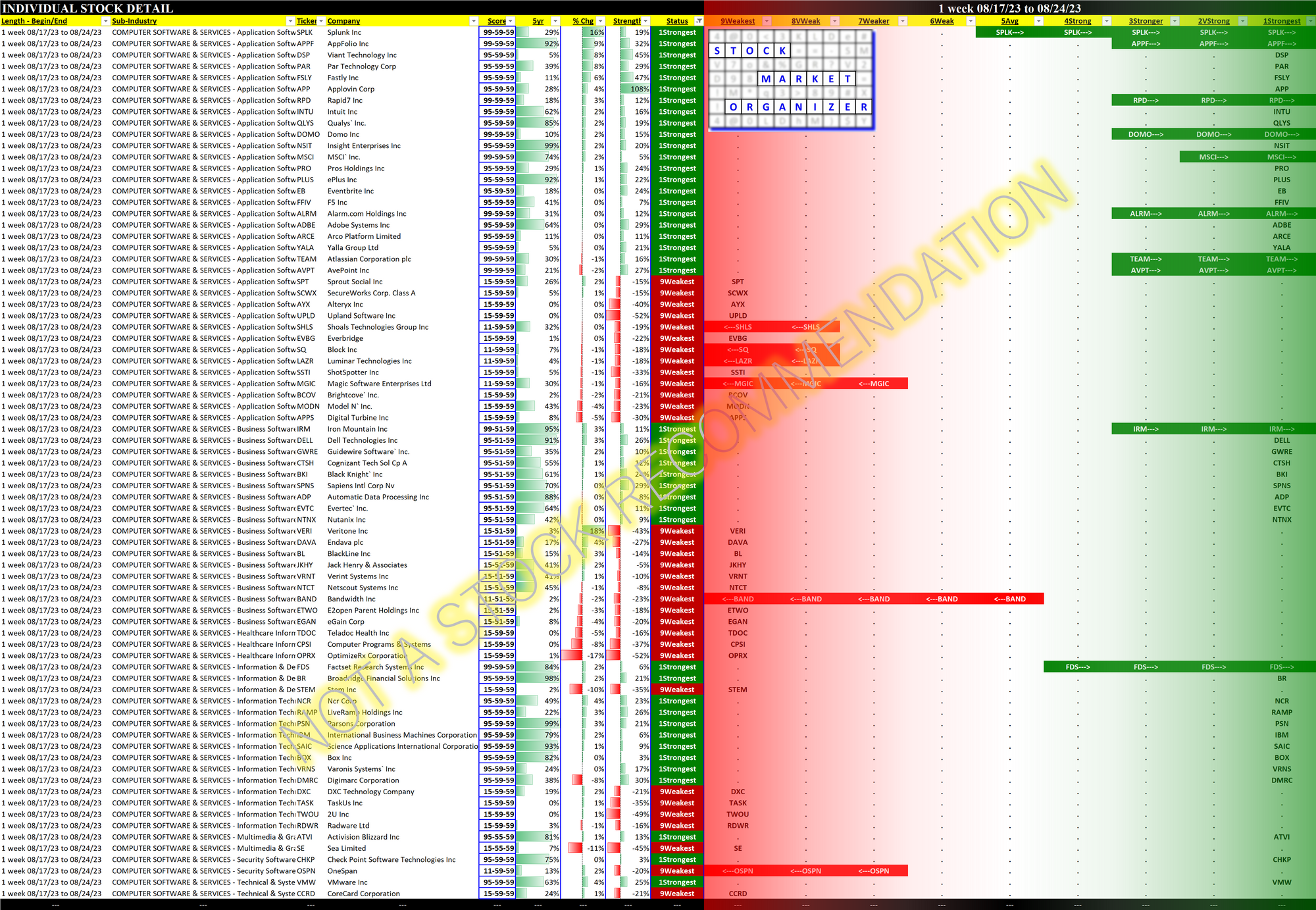For the week, a little more than half of the industry's stocks finished in the green. The leader was VERI/Veritone Inc., a small stock which was +18%, followed by SPLK/Splunk Inc. which was +16% including today's +13% (despite the down market).