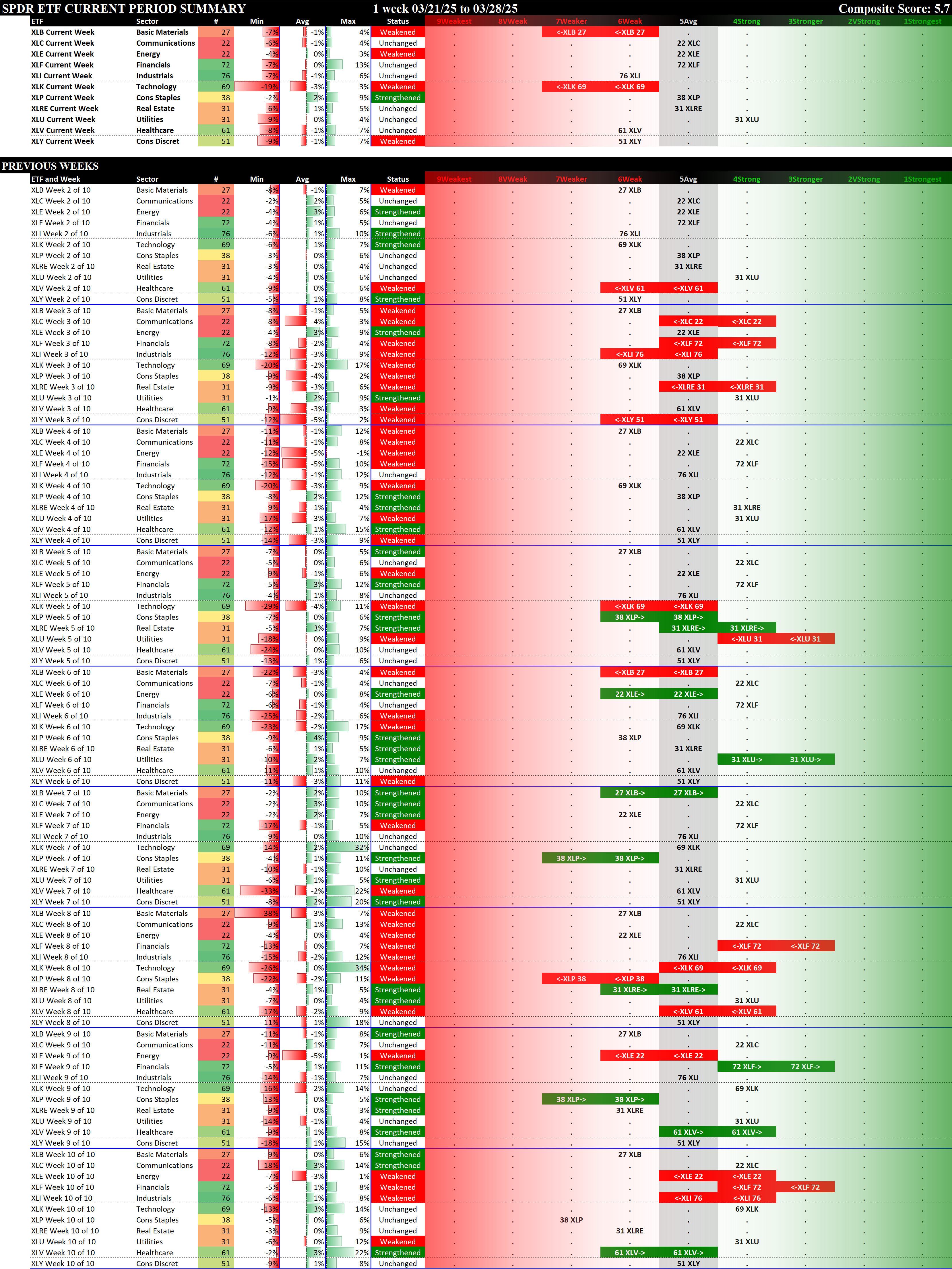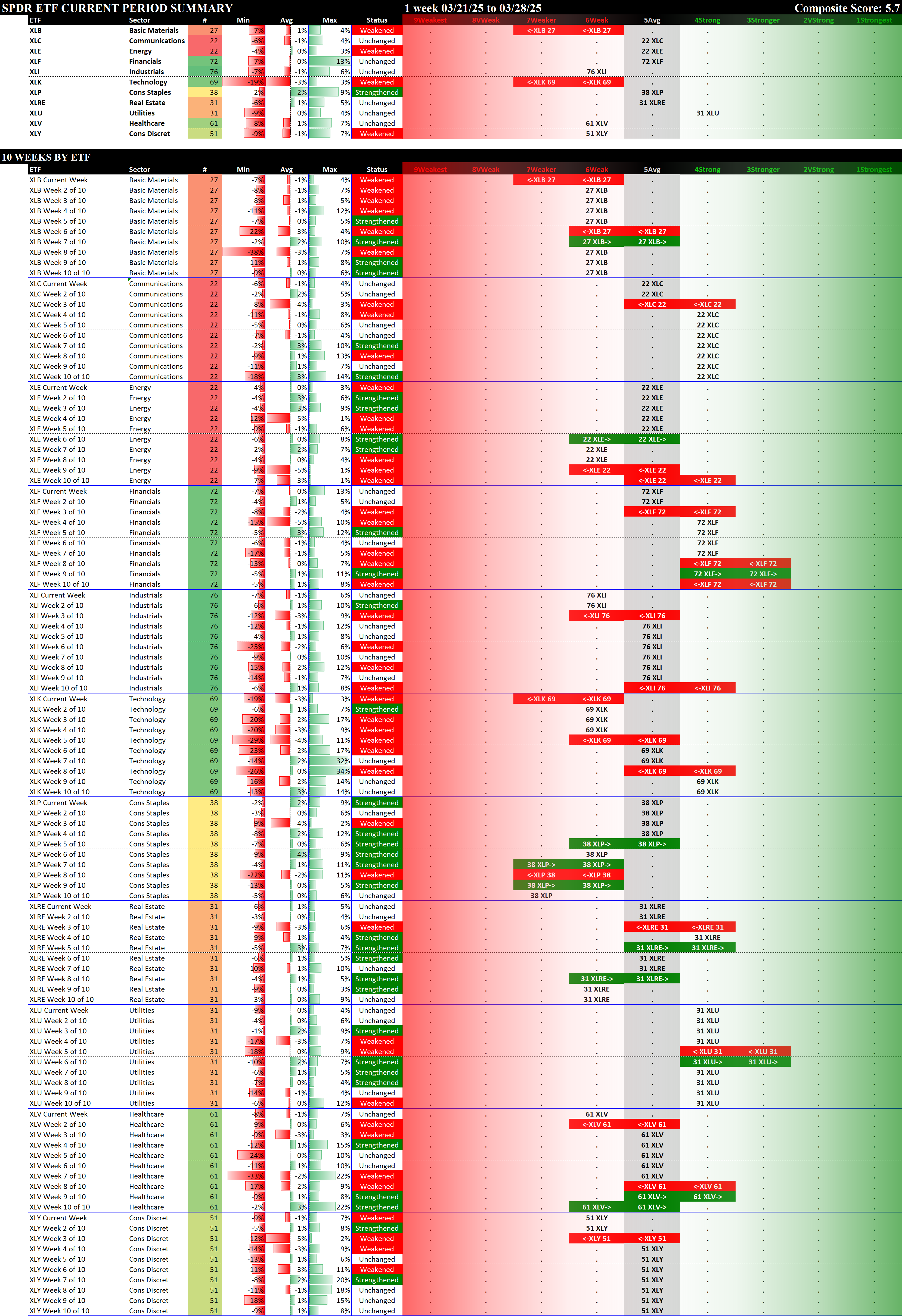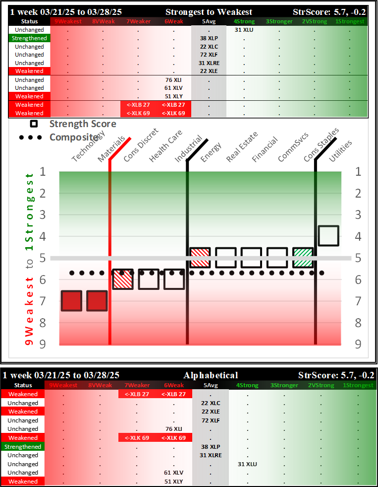 SPDR Sector ETFs Fri 2025-03-28: 5.7 Strength Score (Weakened -0.2)