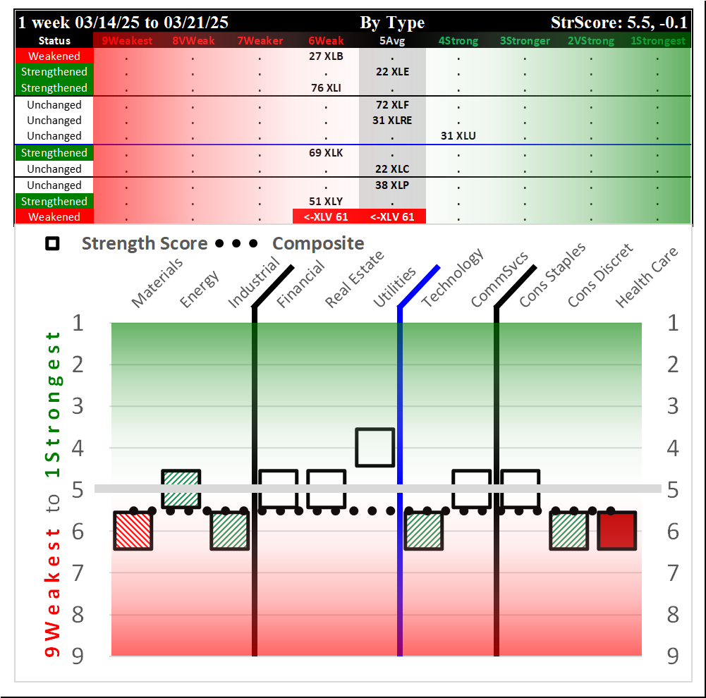 Last Friday's ETF strength report is available here (SPDR Sector ETFs Fri 2025-03-21: 5.5 Strength Score Weakened -0.1).
