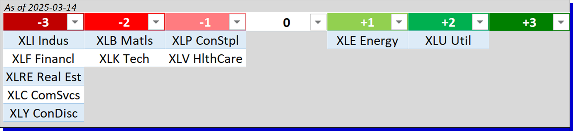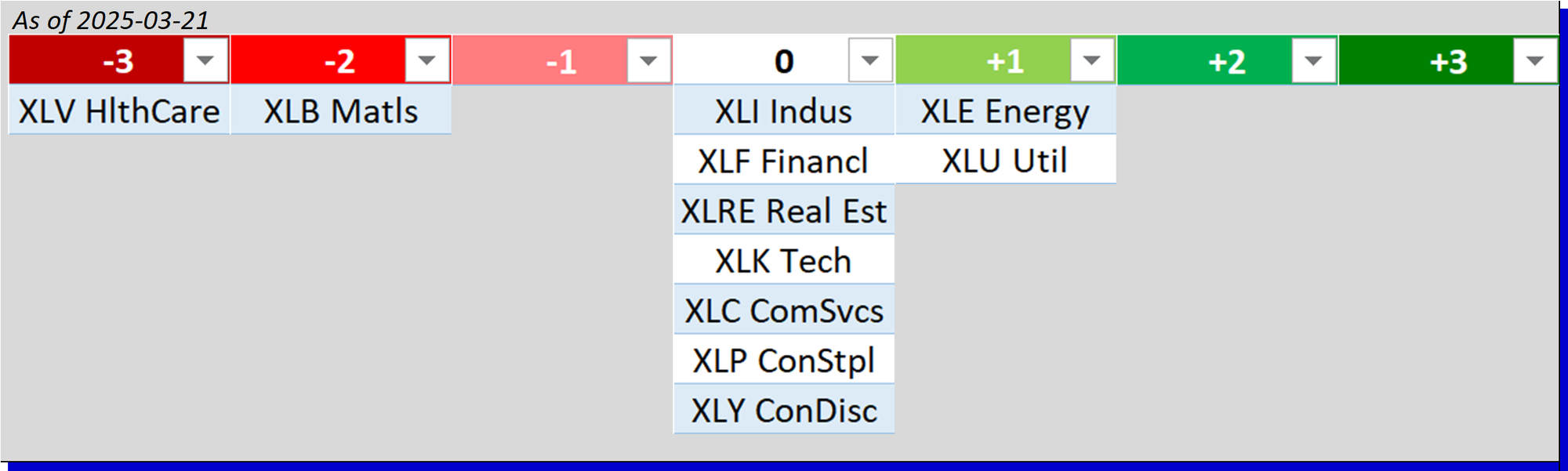 - Bottom row: XLP/Consumer Staples, XLY/Consumer Discretionary, and XLV/Health Care