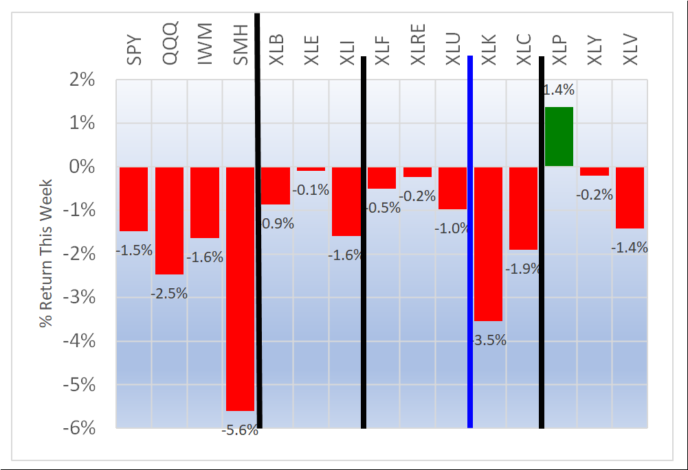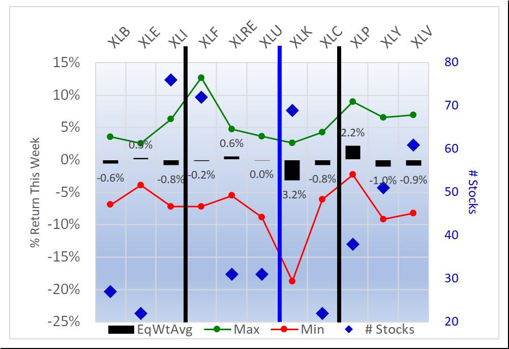 - XLK/Technology, -3.2% average for 69 stocks