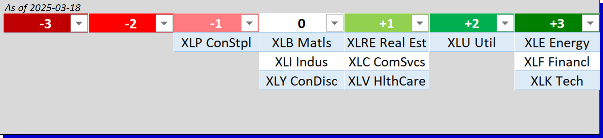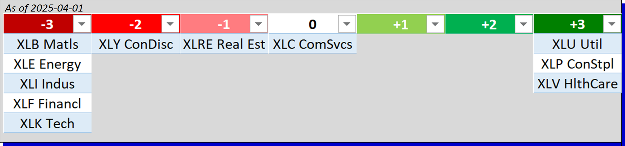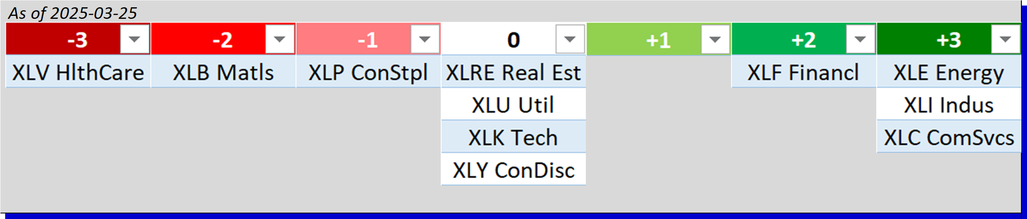 - Bottom row: XLP/Consumer Staples, XLY/Consumer Discretionary, and XLV/Health Care